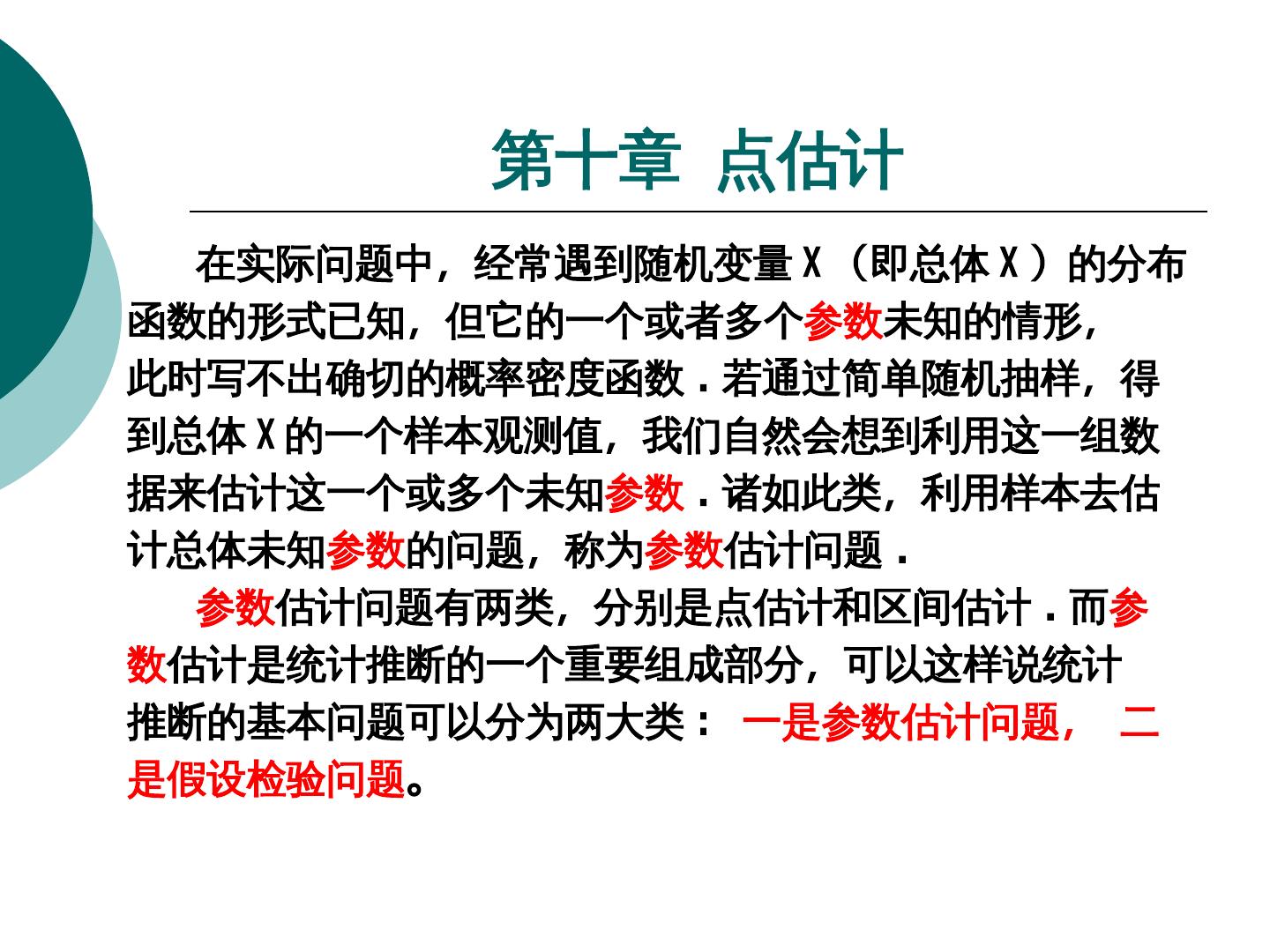 2 . 第十章 点估计 在实际问题中,经常遇到随机变量 X (即总体即总体 X )的分布的分布 函数的形式已知,但它的一个或者多个参数未知的情形, 此时写不出确切的概率密度函数 . 若通过简单随机抽样,得 到总体 X 的一个样本观测值,我们自然会想到利用这一组数 据来估计这一个或多个未知参数 . 诸如此类,利用样本去估 计总体未知参数的问题,称为参数估计问题 . 参数估计问题有两类,分别是点估计和区间估计 . 而参 数估计是统计推断的一个重要组成部分,可以这样说统计 推断的基本问题可以分为两大类 : 一是参数估计问题, 二 是假设检验问题。