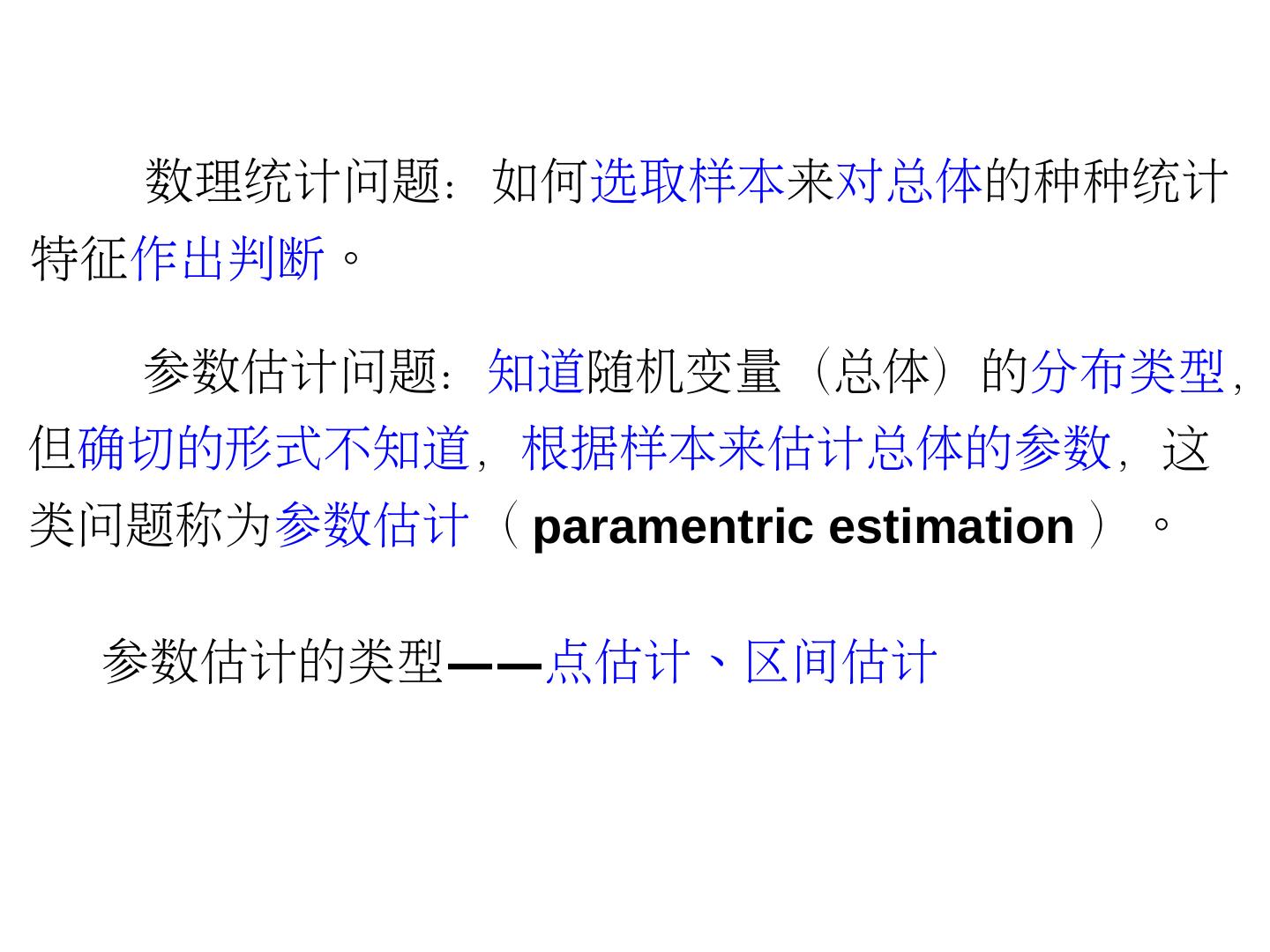 3 . 数理统计问题:如何选取样本来对总体的种种统计 特征作出判断。 参数估计问题:知道随机变量(总体)的分布类型, 但确切的形式不知道,根据样本来估计总体的参数,这 类问题称为参数估计( paramentric estimation )。 参数估计的类型——点估计、区间估计