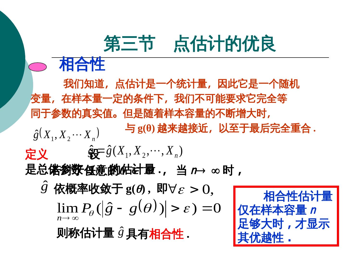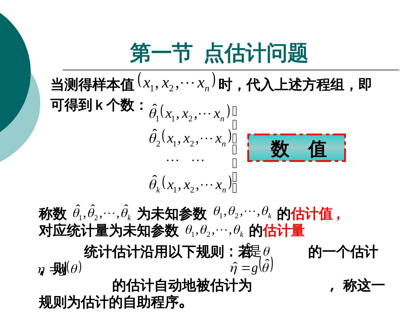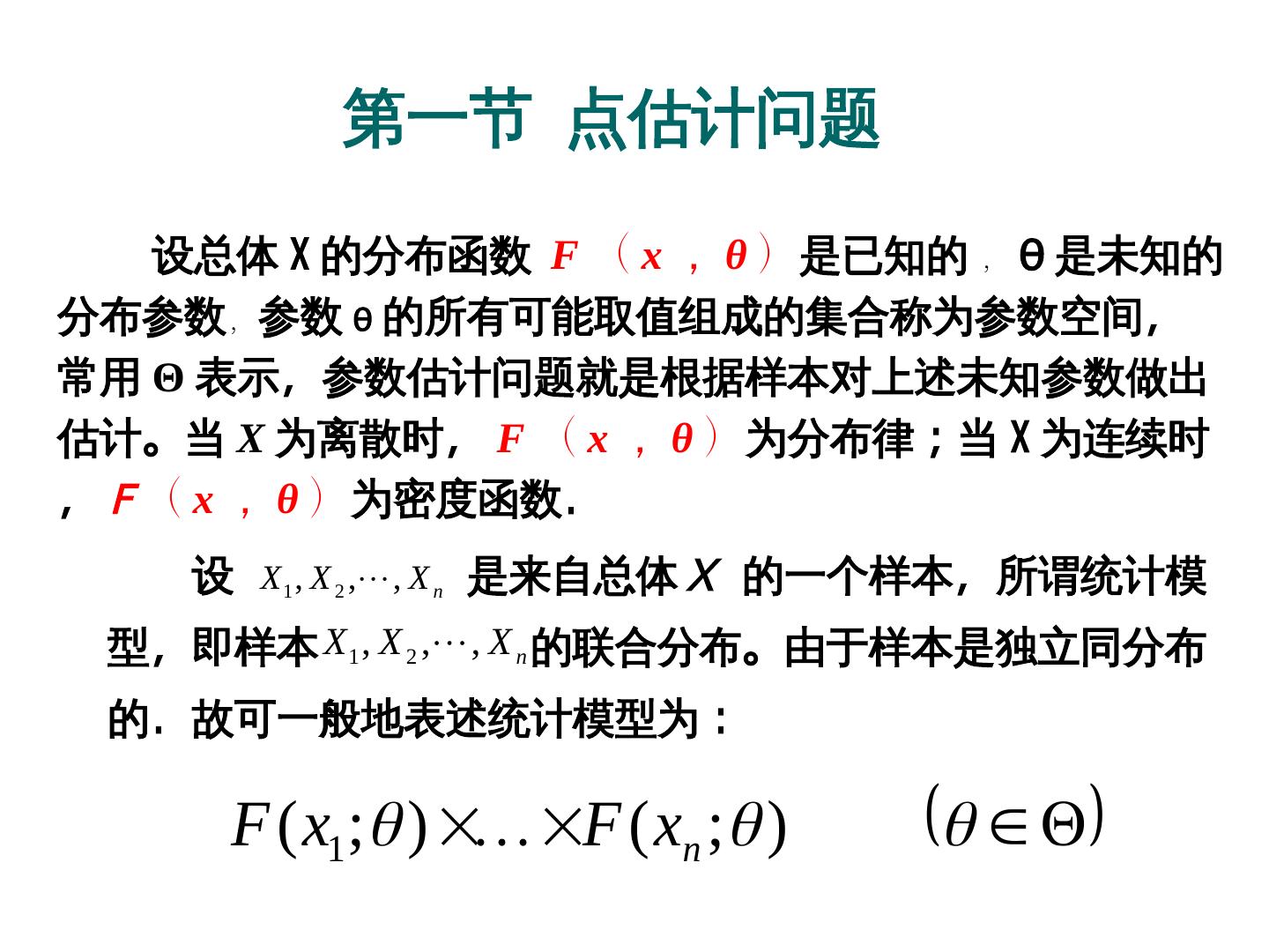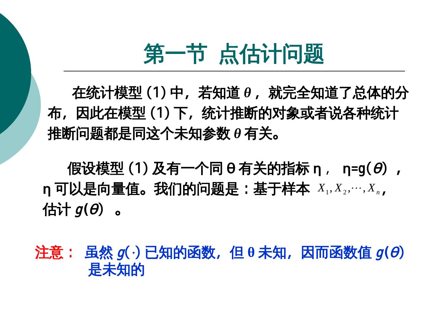 7 . 第一节 点估计问题 在统计模型 (1) 中,若知道 θ ,就完全知道了总体的分 布,因此在模型 (1) 下,统计推断的对象或者说各种统计 推断问题都是同这个未知参数 θ 有关。 假设模型 (1) 及有一个同 θ 有关的指标 η , η=g(g(θ) , η 可以是向量值。我们的问题是:基于样本 X 1 , X 2 ,, X n , 估计 g(θ) 。 注意: 虽然 g(·) 已知的函数,但 θ 未知,因而函数值 g(θ) 是未知的