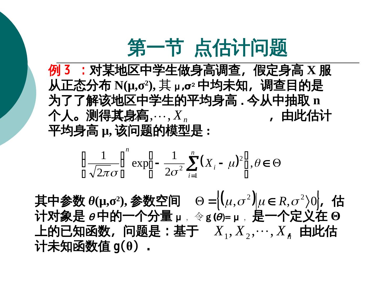 8 . 第一节 点估计问题 例 3 :对某地区中学生做身高调查,假定身高 X 服 从正态分布 N(μ,σ2), 其 μ ,σ2 中均未知,调查目的是 为了了解该地区中学生的平均身高 . 今从中抽取 n 个人。测得其身高X 1 , X 2 , , X n ,由此估计 X , X , , X 平均身高 μ, 该问题的模型是 : n 1 1 n exp 2 X i , 2 2 2 i 1 其中参数 θ(μ,σ2), 参数空间 , 2 R, 2 0 ,估 计对象是 θ 中的一个分量 μ ,令 g (θ )= μ ,是一个定义在 Θ 上的已知函数,问题是:基于 X 1 , X 2 , , X ,由此估n 计未知函数值 g(θ) .