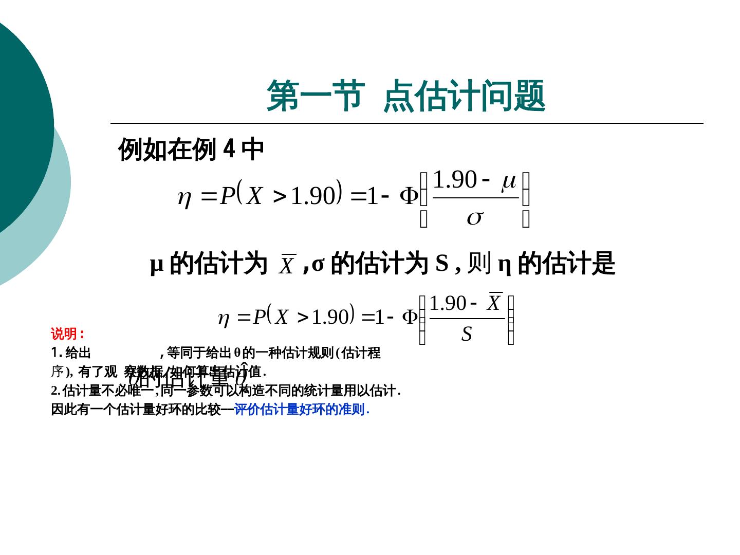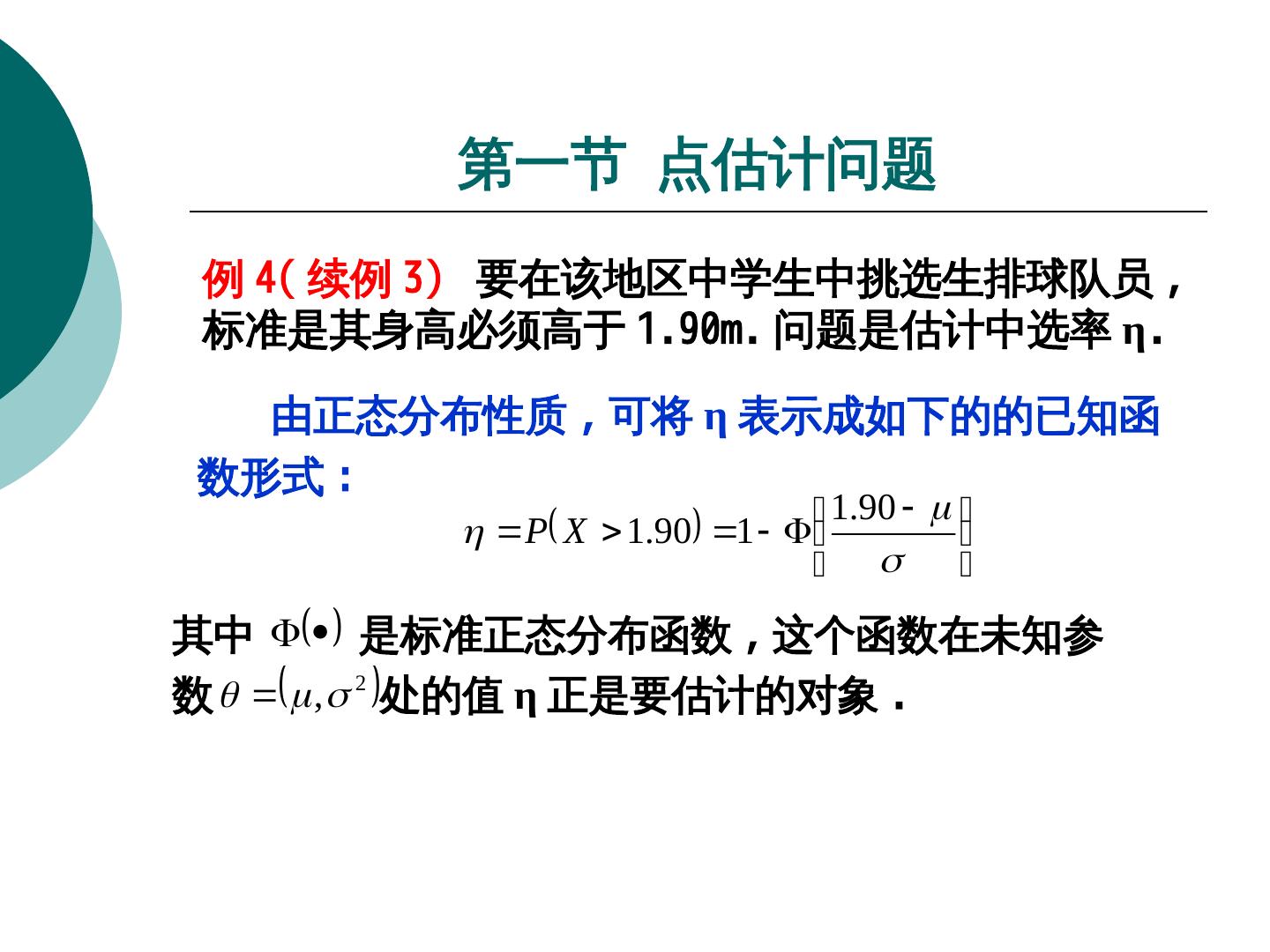 9 . 第一节 点估计问题 例 4( 续例 3) 要在该地区中学生中挑选生排球队员 , 标准是其身高必须高于 1.90m. 问题是估计中选率 η. 由正态分布性质 , 可将 η 表示成如下的的已知函 数形式 : 1.90 P X 1.90 1 其中 是标准正态分布函数 , 这个函数在未知参 数 , 2 处的值 η 正是要估计的对象 .