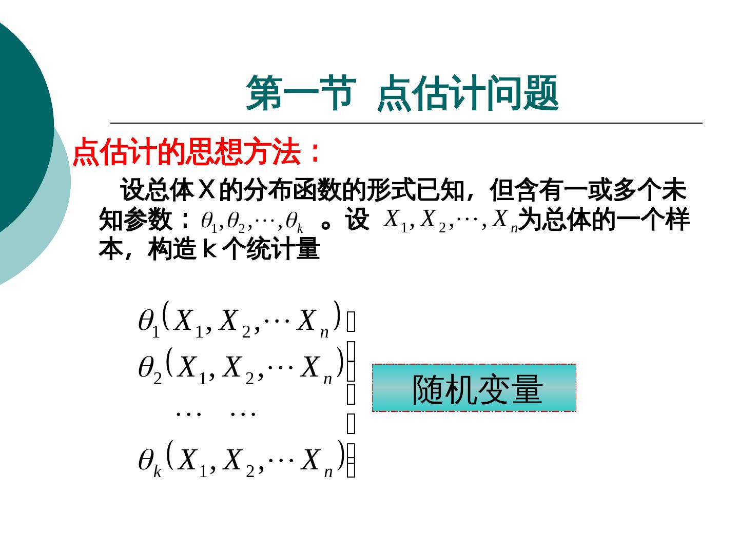 10 . 第一节 点估计问题 点估计的思想方法: 设总体X的分布函数的形式已知,但含有一或多个未 知参数: 。设 为总体的一个样 1 , 2 ,, k X 1 , X 2 ,, X n 本,构造k个统计量k个统计量个统计量 1 X 1 , X 2 , X n 2 X 1 , X 2 , X n 随机变量 k X 1 , X 2 , X n
