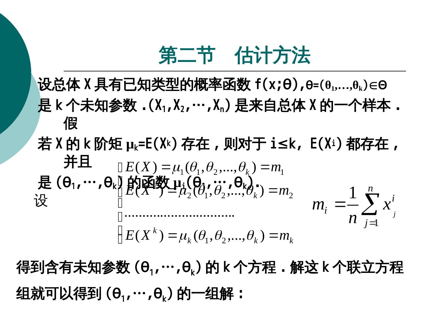 14 . 第二节 估计方法 设总体 X 具有已知类型的概率函数 f(x;θ),θ),θ=g((θ1,…,θk)∈Θ 是 k 个未知参数 .(X1,X2,…,Xn) 是来自总体 X 的一个样本 . 假 若 X 的 k 阶矩 μk=g(E(Xk) 存在 , 则对于 i≤k, E(Xi) 都存在 , 并且 E ( X ) 1 (1 , 2 ,..., k ) m1 是 (θ1,…,θk) 的函数 2 µi(θ1,…,θk). E ( X ) 2 (1 , 2 ,..., k ) m2 1 n 设 ............................... mi x n j 1 j i E ( X k ) ( , ,..., ) m k 1 2 k k 得到含有未知参数 (θ1,…,θk) 的 k 个方程 . 解这 k 个联立方程 组就可以得到 (θ1,…,θk) 的一组解 :