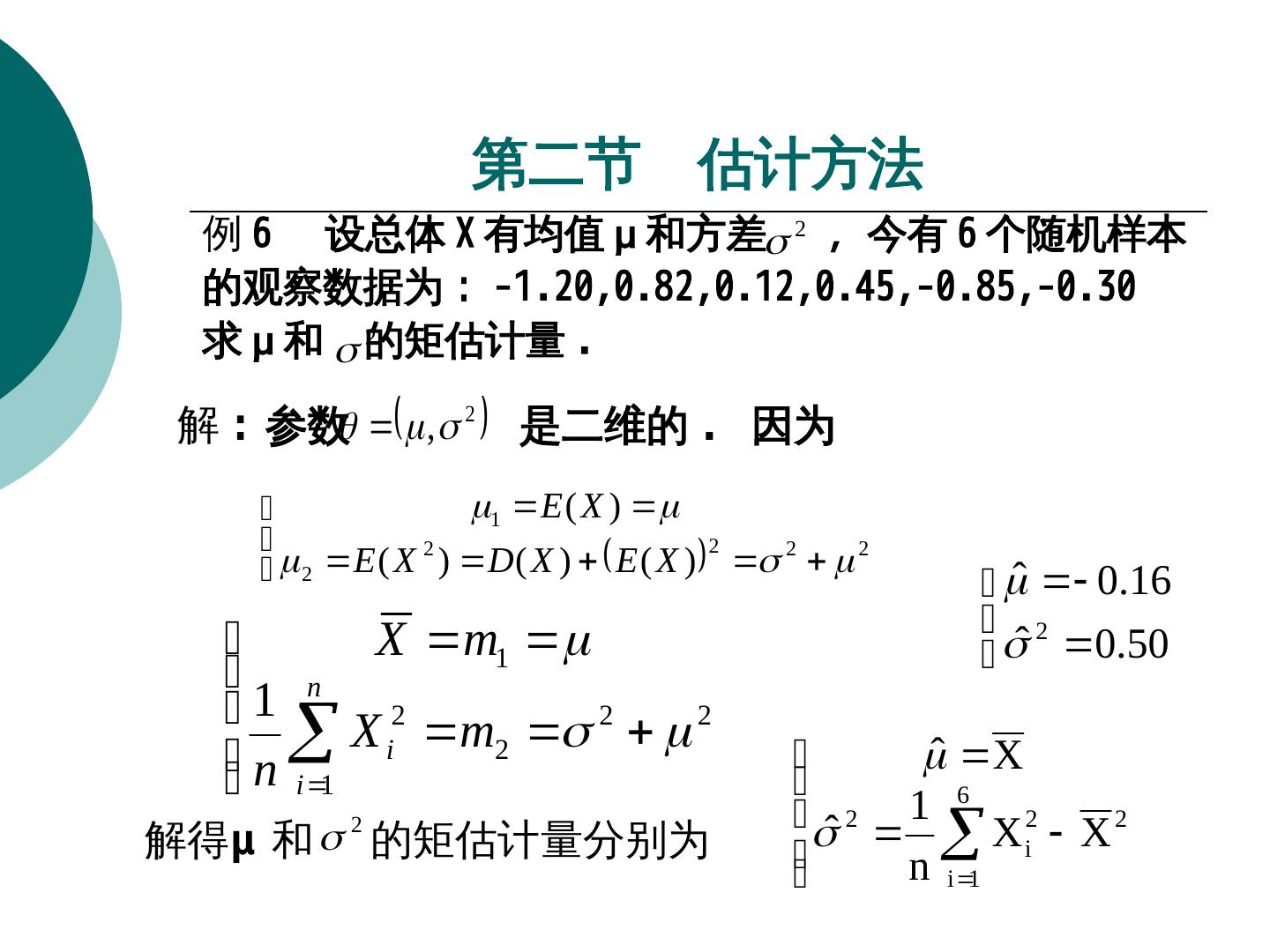 18 . 第二节 估计方法 例 6 设总体 X 有均值 μ 和方差 2 ,今有 6 个随机样本 的观察数据为: -1.20,0.82,0.12,0.45,-0.85,-0.30 求 μ 和 的矩估计量 2 . 解 : 参数 , 2 是二维的 . 因为 1 E ( X ) 2 E ( X 2 ) D ( X ) E ( X ) 2 2 2 ˆ 0.16 2 X m1 ˆ 0.50 n 1 X 2 m 2 2 n i 1 i 2 ˆ X 6 ˆ 2 1 2 解得μ 和 的矩估计量分别为 i n i 1 X 2 X 2