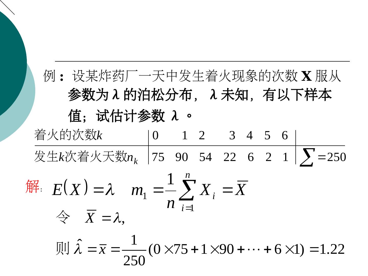 20 . 例 : 设某炸药厂一天中发生着火现象的次数 X 服从 参数为λ的泊松分布, λ未知,有以下样本 值;试估计参数 λ。 着火的次数k 0 1 2 3 4 5 6 发生k次着火天数n k 75 90 54 22 6 2 1 250 解: E X 1 n m1 X i X n i 1 令 X , ˆ 1 则 x (0 75 1 90 6 1) 1.22 250