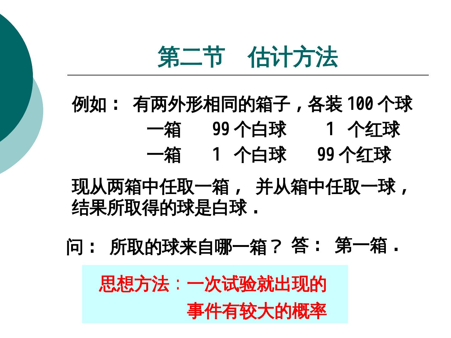 23 . 第二节 估计方法 例如 : 有两外形相同的箱子 , 各装 100 个球 一箱 99 个白球 1 个红球 一箱 1 个白球 99 个红球 现从两箱中任取一箱 , 并从箱中任取一球 , 结果所取得的球是白球 . 问 : 所取的球来自哪一箱? 答 : 第一箱 . 思想方法:一次试验就出现的 事件有较大的概率
