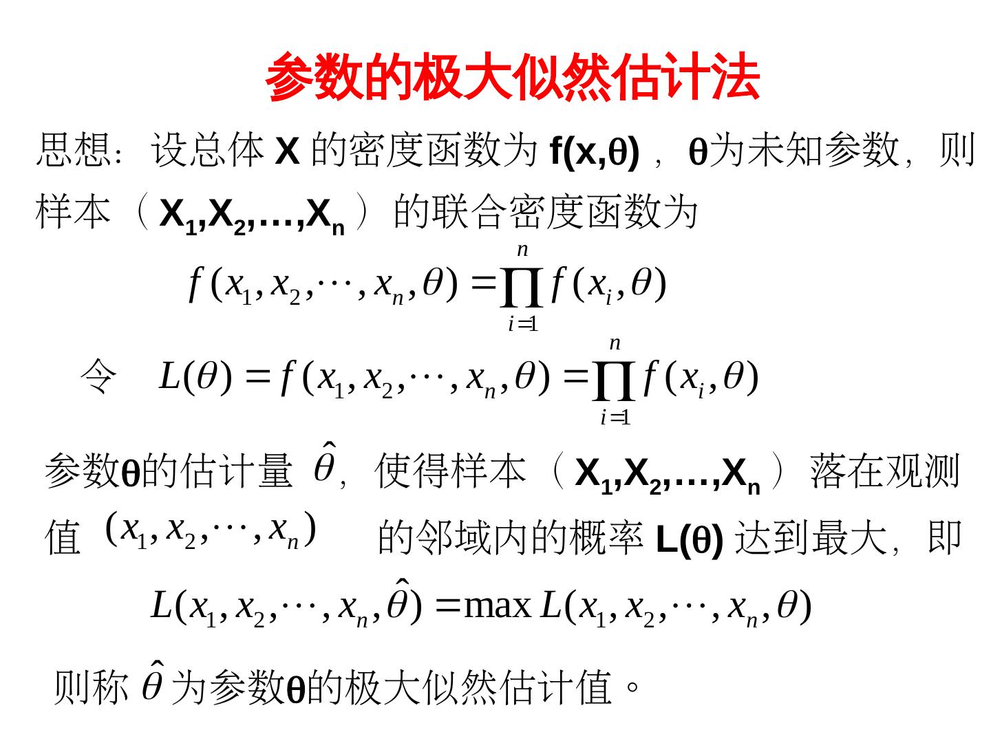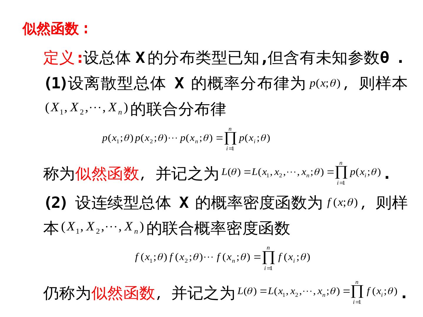 25 .似然函数 : 定义:设总体 X 的分布类型已知,但含有未知参数θ . (1)设离散型总体 X 的概率分布律为 p( x; ) ,则样本 ( X 1 , X 2 , , X n ) 的联合分布律 n p ( x1 ; ) p ( x 2 ; ) p ( x n ; ) p ( xi ; ) i 1 n 称为似然函数,并记X之为 L( ) L( x , x ,, x ; ) p( x ; ) . 1 2 n i 1 i (2) 设连续型总体 X 的概率密度函数为 f ( x; ) ,则样 本 ( X 1 , X 2 ,, X n ) 的联合概率密度函数 n f ( x1 ; ) f ( x 2 ; ) f ( x n ; ) f ( xi ; ) i 1 n 仍称为似然函数,并记X之为 L( ) L( x , x ,, x ; ) f ( x ; ) . 1 2 n i 1 i
