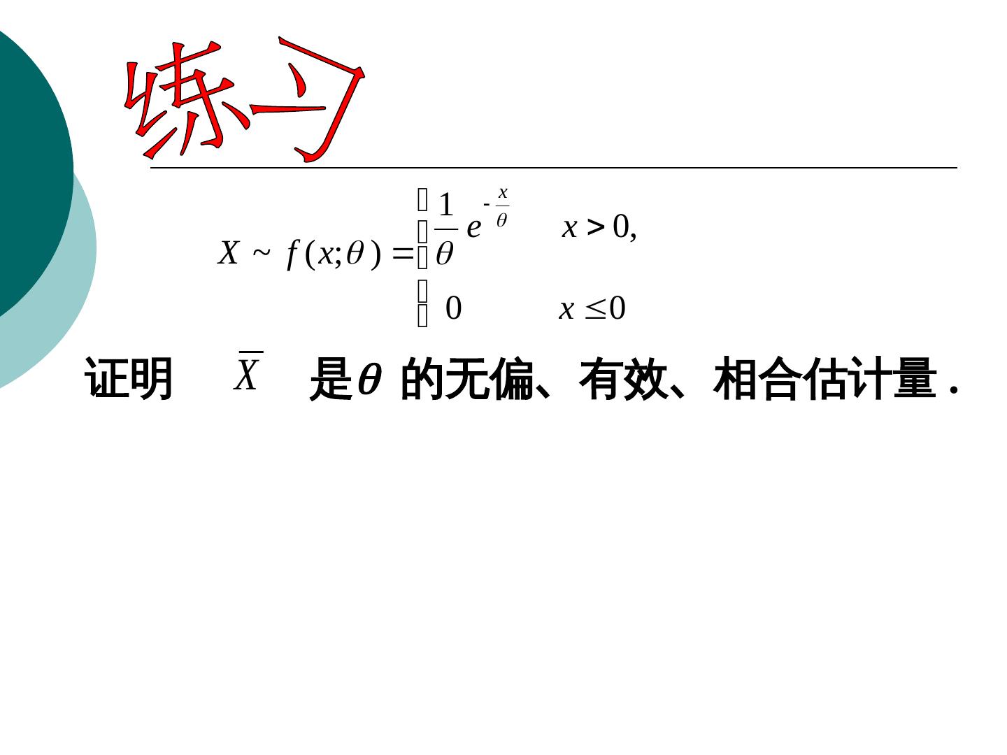 21 .练习 对容量为 n 的子样,求下列密度函数中参数 a 的 矩估计量。 2 2 (a x), (0 x a ) f ( x ) a 0, 其它 a 2 a 解 由于 EX x 2 (a x)dx 0 a 3 a 所以由矩法估计,得 X 3 n 3 X 3 解得 a n i 1 Xi n 3 所以,参数 a 的矩估计量为 a n i 1 Xi