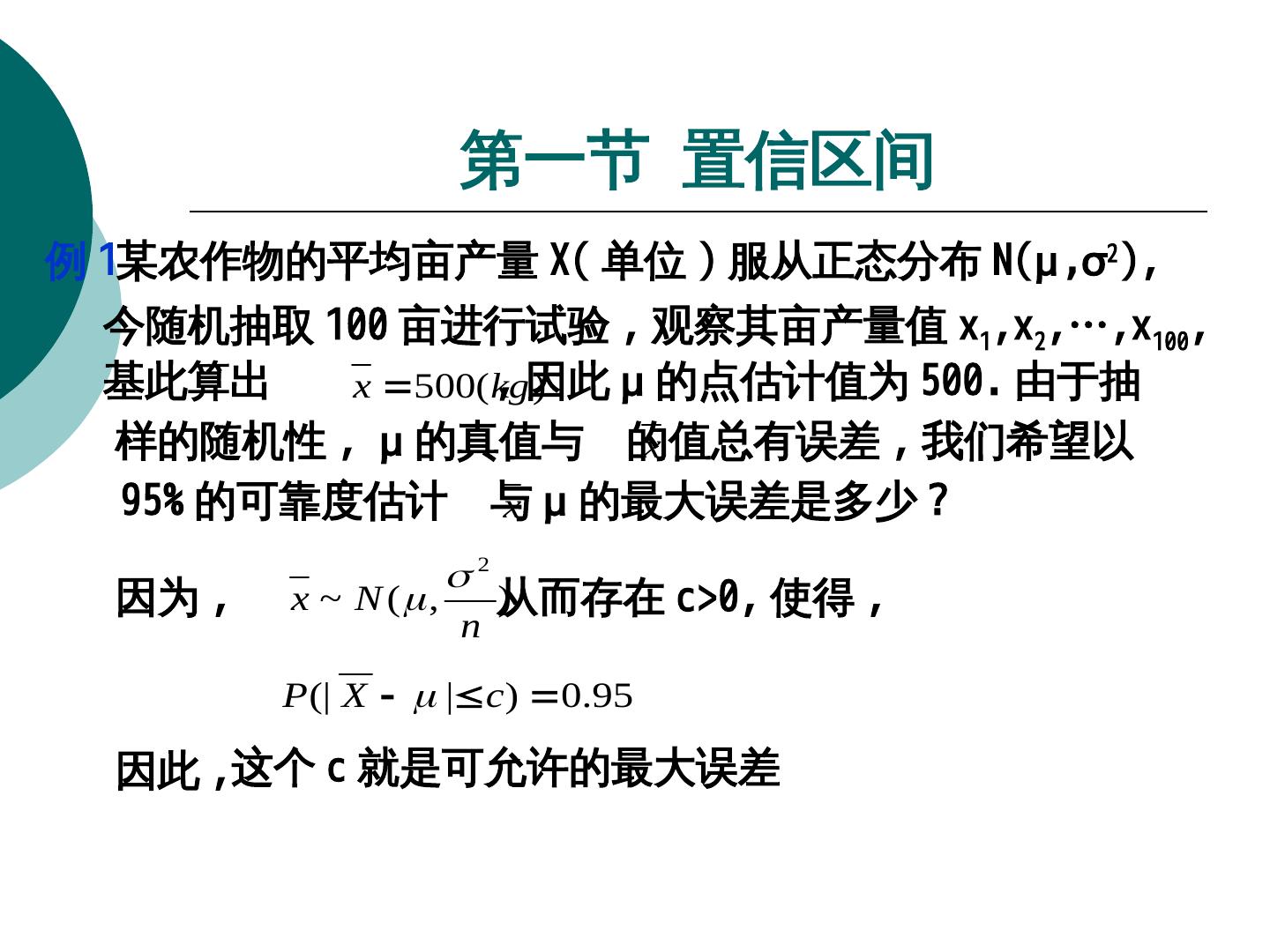 4 . 第一节 置信区间 例 1某农作物的平均亩产量 X( 单位 ) 服从正态分布 N(μ,σ2), 今随机抽取 100 亩进行试验 , 观察其亩产量值 x1,x2,…,x100, 基此算出 , 因此 x 500( kg ) μ 的点估计值为 500. 由于抽 样的随机性 , μ 的真值与 的值总有误差 x , 我们希望以 95% 的可靠度估计 与 x μ 的最大误差是多少 ? 2 因为 , x ~ N ( , 从而存在 ) c>0, 使得 , n P (| X |c) 0.95 因此 ,这个 c 就是可允许的最大误差