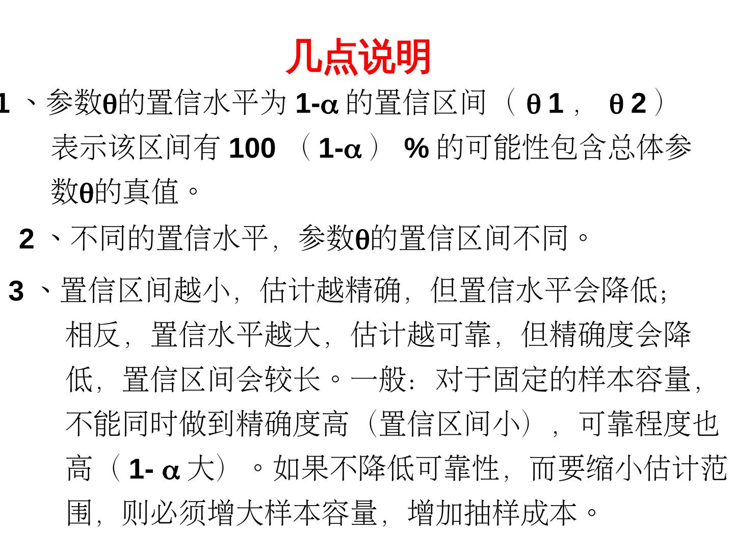 6 . 几点说明 1 、参数的置信水平为 1- 的置信区间( 1 , 2 ) 表示该区间有 100 ( 1- ) % 的可能性包含总体参 数的真值。 2 、不同的置信水平, 参数的置信区间不同。 3 、置信区间越小, 估计越精确, 但置信水平会降低; 相反, 置信水平越大, 估计越可靠, 但精确度会降 低, 置信区间会较长。一般:对于固定的样本容量, 不能同时做到精确度高( 置信区间小), 可靠程度也 高( 1- 大)。如果不降低可靠性, 而要缩小估计范 围, 则必须增大样本容量, 增加抽样成本。