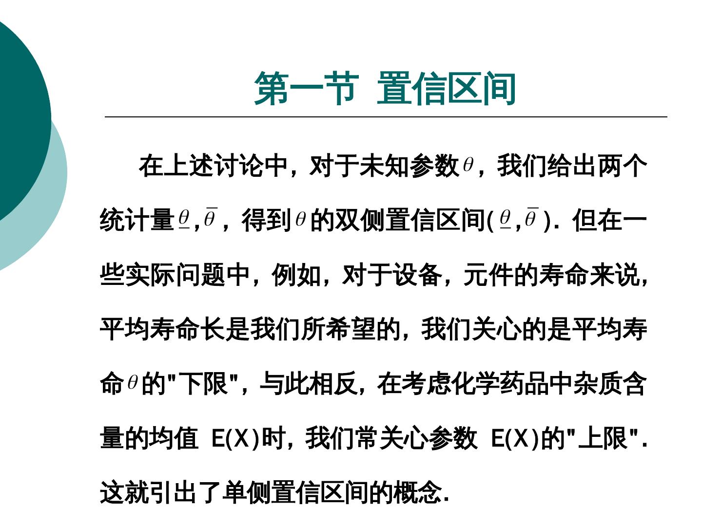 7 . 第一节 置信区间 在上述讨论中, 对于未知参数 , 我们给出两个 统计量 , , 得到 的双侧置信区间( , ). 但在一 些实际问题中, 例如, 对于设备, 元件的寿命来说, 平均寿命长是我们所希望的, 我们关心的是平均寿 命 的"下限", 与此相反, 在考虑化学药品中杂质含 量的均值 E(X )时, 我们常关心参数 E(X )的"上限". 这就引出了单侧置信区间的概念.