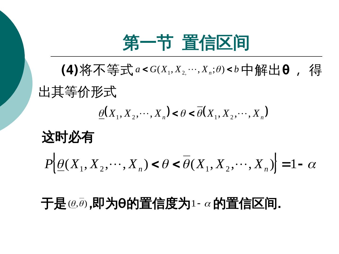 12 . 第一节 置信区间 (4)将不等式 a G ( X 1 , X 2, , X n ; ) b 中解出 θ的置信区间 ,得 出其等价形式 X 1 , X 2 ,, X n X 1 , X 2 ,, X n 这时必有 P ( X 1 , X 2 , , X n ) ( X 1 , X 2 ,, X n ) 1 于是 ( , ) ,即为θ的置信度为θ的置信度为的置信度为θ的置信度为1 的置信区间.