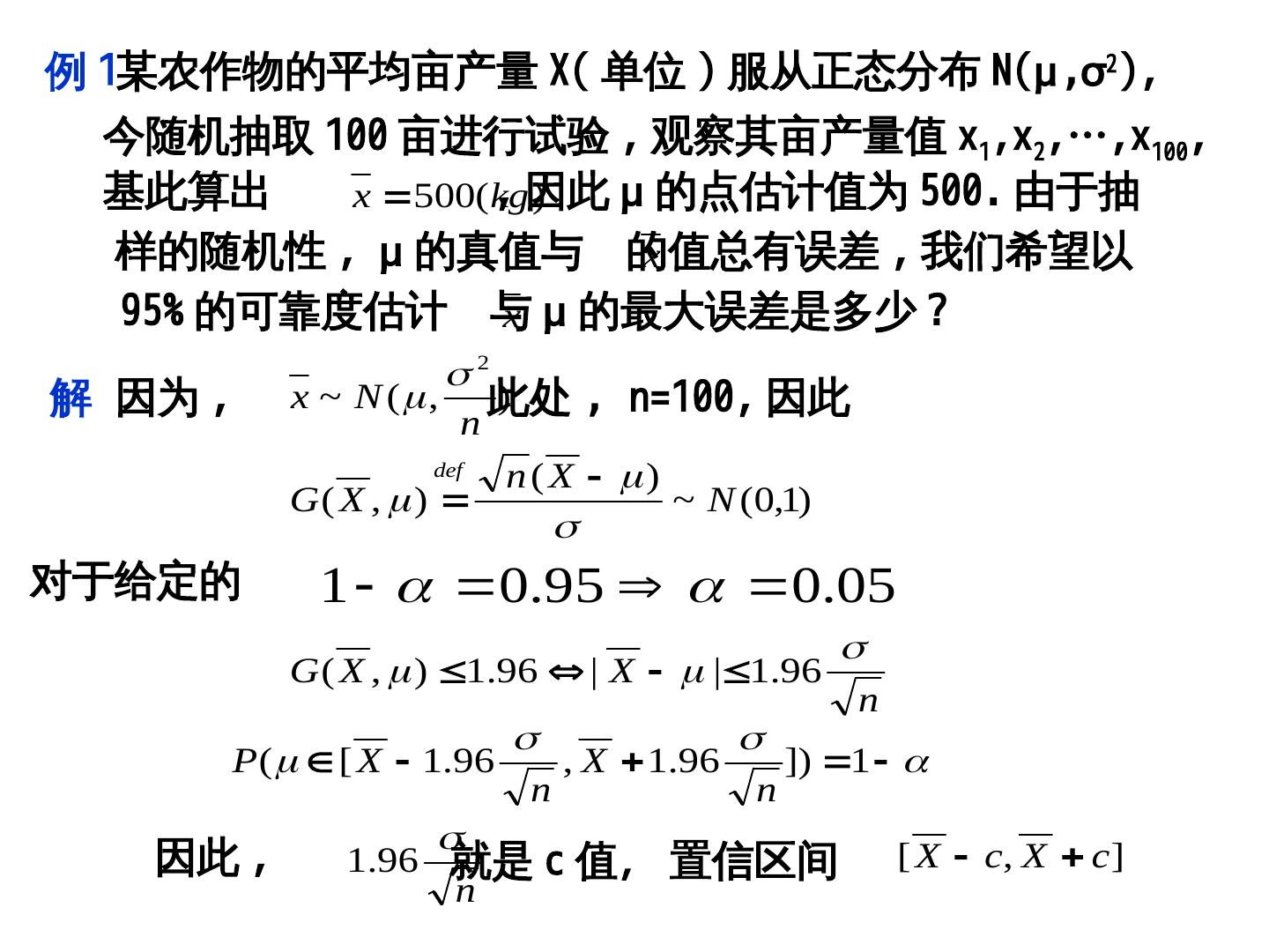 13 .例 1某农作物的平均亩产量 X( 单位 ) 服从正态分布 N(μ,σ2), 今随机抽取 100 亩进行试验 , 观察其亩产量值 x1,x2,…,x100, 基此算出 , 因此 x 500( kg ) μ 的点估计值为 500. 由于抽 样的随机性 , μ 的真值与 的值总有误差 x , 我们希望以 95% 的可靠度估计 与 x μ 的最大误差是多少 ? 2 解 因为 , x ~ N ( , 此处 ) , n=100, 因此 n def n(X ) G( X , ) ~ N (0,1) 对于给定的 1 0.95 0.05 G ( X , ) 1.96 | X |1.96 n P ( [ X 1.96 , X 1.96 ]) 1 n n 因此 , 1.96 就是 c 值, 置信区间 [ X c, X c ] n