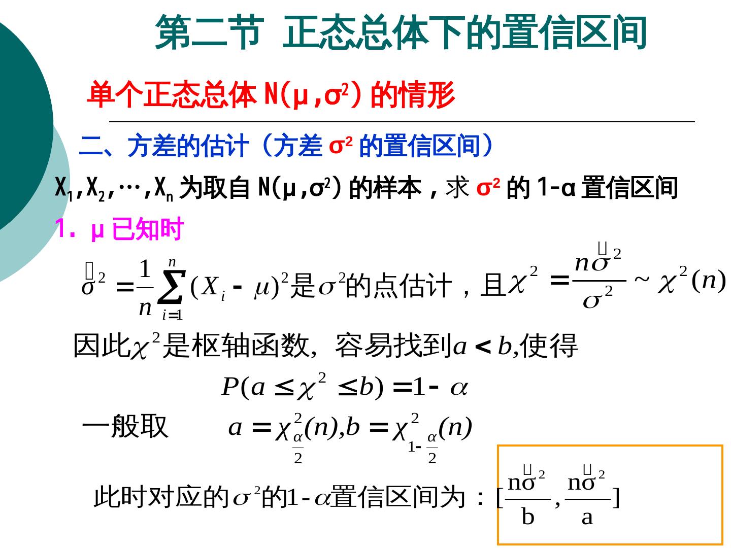 17 . 第二节 正态总体下的置信区间 单个正态总体 N(μ,σ2) 的情形 二、方差的估计(方差 σ2 的置信区间) X1,X2,…,Xn 为取自 N(μ,σ2) 的样本 , 求 σ2 的 1-α 置信区间 1. μ 已知时 2 2 1 n 2 n 2 σ ( X i ) 是 的点估计,且 2 2 2 ~ ( n) n i 1 因此 2 是枢轴函数, 容易找到a b,使得 P (a 2 b) 1 一般取 a χ α2 (n),b χ 2 α (n) 1 2 2 2 2 n σ n σ 此时对应的 2的1 - 置信区间为θ的置信度为:[ , ] b a