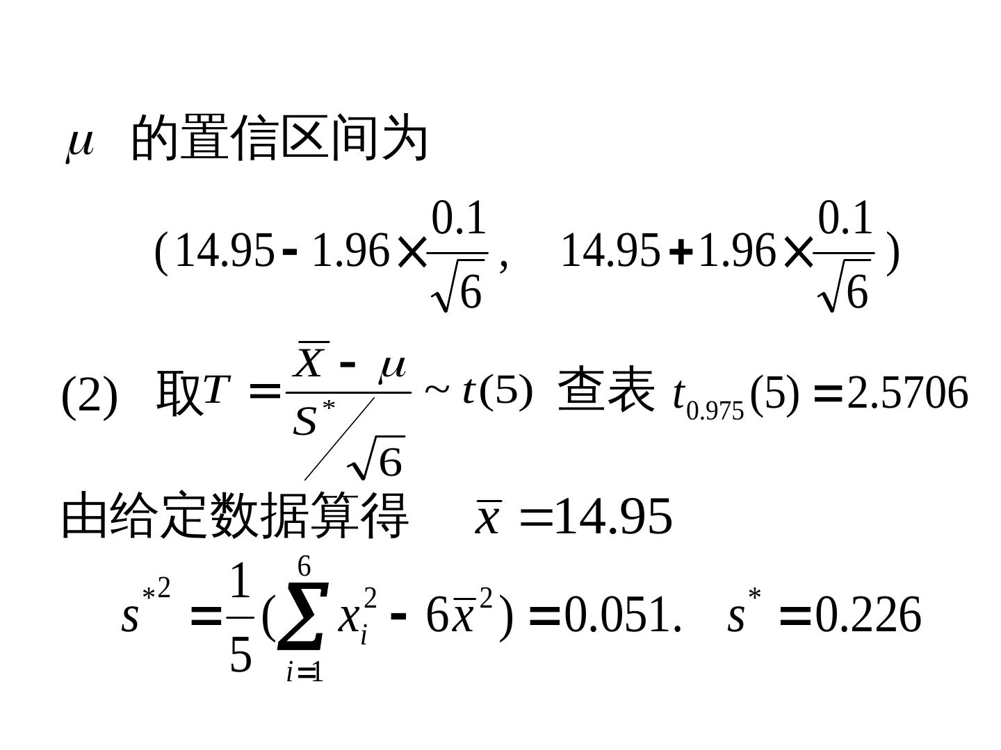 24 . 的置信区间为 0.1 0.1 ( 14.95 1.96 , 14.95 1.96 ) 6 6 X (2) 取T S * ~ t (5) 查表 t0.975 (5) 2.5706 6 由给定数据算得 x 14.95 6 *2 1 s ( xi 6 x ) 0.051. s 0.226 2 2 * 5 i 1
