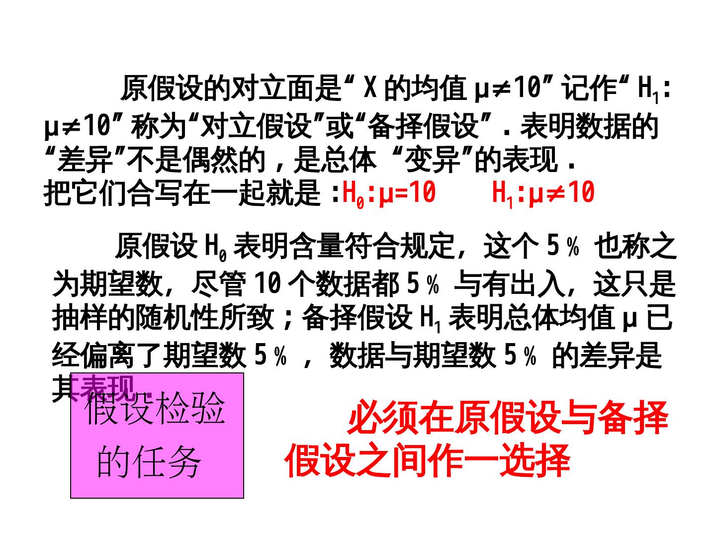 6 . 原假设的对立面是“ X 的均值 μ≠10” 记作“ H1: μ≠10” 称为“对立假设”或“备择假设” . 表明数据的 “差异”不是偶然的 , 是总体 “变异”的表现 . 把它们合写在一起就是 :H0:μ=10 H1:μ≠10 原假设 H0 表明含量符合规定,这个 5﹪ 也称之 为期望数,尽管 10 个数据都 5﹪ 与有出入,这只是 抽样的随机性所致 ; 备择假设 H1 表明总体均值 μ 已 经偏离了期望数 5﹪ ,数据与期望数 5﹪ 的差异是 其表现 . 假设检验 必须在原假设与备择 的任务 假设之间作一选择