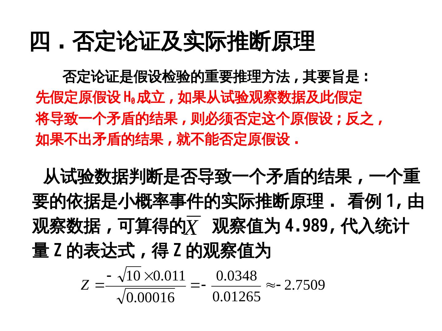 8 .四 . 否定论证及实际推断原理 否定论证是假设检验的重要推理方法 , 其要旨是 : 先假定原假设 H0 成立 , 如果从试验观察数据及此假定 将导致一个矛盾的结果 , 则必须否定这个原假设 ; 反之 , 如果不出矛盾的结果 , 就不能否定原假设 . 从试验数据判断是否导致一个矛盾的结果 , 一个重 要的依据是小概率事件的实际推断原理 . 看例 1, 由 观察数据 , 可算得的X 观察值为 4.989, 代入统计 量 Z 的表达式 , 得 Z 的观察值为 10 0.011 0.0348 Z 2.7509 0.00016 0.01265