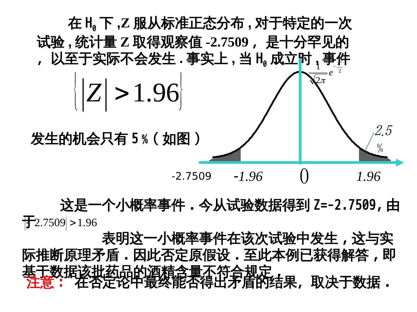 9 . 在 H0 下 ,Z 服从标准正态分布 , 对于特定的一次 试验 , 统计量 Z 取得观察值 -2.7509 ,是十分罕见的 ,以至于实际不会发生 . 事实上 , 当 H0 成立时 ,1 事件 z2 Z 1.96 e 2 2 发生的机会只有 5﹪( 如图 ) ﹪ -2.7509 1.96 1.96 这是一个小概率事件 . 今从试验数据得到 Z=-2.7509, 由 于 2.7509 1.96 表明这一小概率事件在该次试验中发生 , 这与实 际推断原理矛盾 . 因此否定原假设 . 至此本例已获得解答 , 即 基于数据该批药品的酒精含量不符合规定 . 注意 : 在否定论中最终能否得出矛盾的结果,取决于数据 .