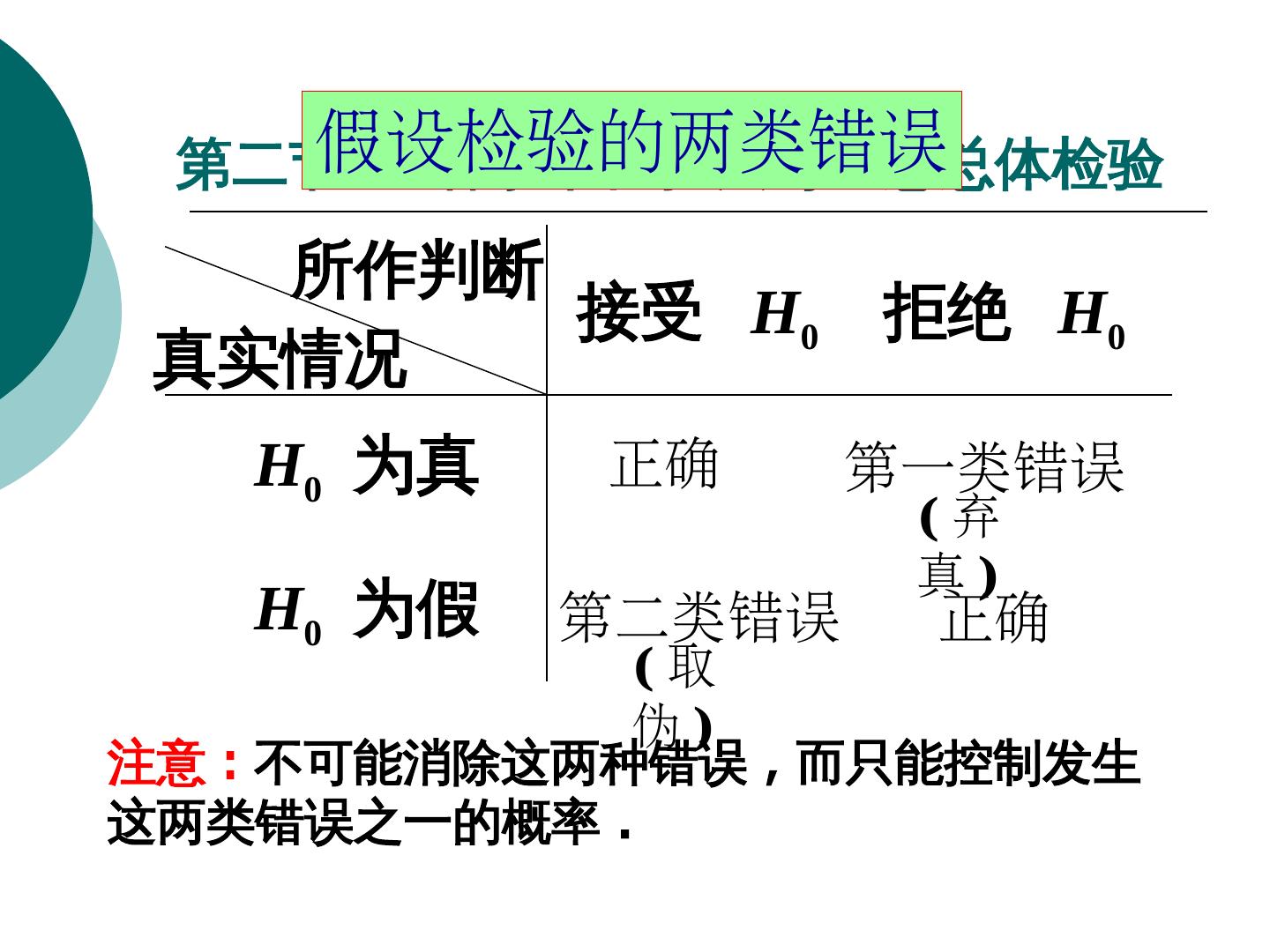 10 . 假设检验的两类错误 第二节 显著水平检验法与正态总体检验 所作判断 接受 H0 拒绝 H0 真实情况 H0 为真 正确 第一类错误 (弃 真) H0 为假 第二类错误 正确 (取 伪) 注意 : 不可能消除这两种错误 , 而只能控制发生 这两类错误之一的概率 .