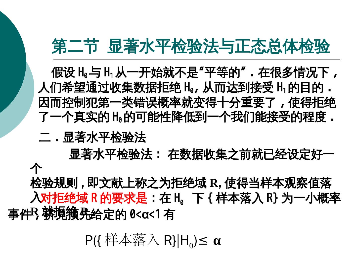 11 . 第二节 显著水平检验法与正态总体检验 假设 H0 与 H1 从一开始就不是“平等的” . 在很多情况下 , 人们希望通过收集数据拒绝 H0, 从而达到接受 H1 的目的 . 因而控制犯第一类错误概率就变得十分重要了 , 使得拒绝 了一个真实的 H0 的可能性降低到一个我们能接受的程度 . 二 . 显著水平检验法 显著水平检验法 : 在数据收集之前就已经设定好一 个 检验规则 , 即文献上称之为拒绝域 R, 使得当样本观察值落 入对拒绝域 R 的要求是 : 在 H0 下 { 样本落入 R} 为一小概率 事件R, 就拒绝 R0. 挤兑预先给定的 0<α<1 有 P({ 样本落入 R}|H0)≤ α