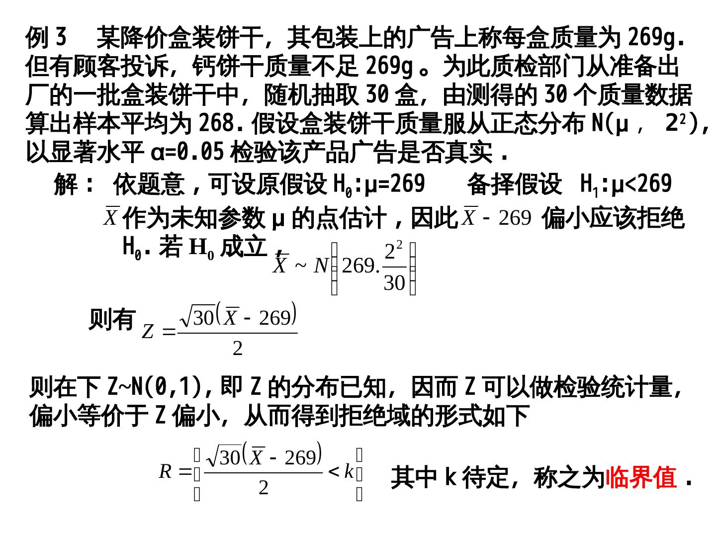 12 .例 3 某降价盒装饼干,其包装上的广告上称每盒质量为 269g. 但有顾客投诉,钙饼干质量不足 269g 。为此质检部门从准备出 厂的一批盒装饼干中,随机抽取 30 盒,由测得的 30 个质量数据 算出样本平均为 268. 假设盒装饼干质量服从正态分布 N(μ , 22 ), 以显著水平 α=0.05 检验该产品广告是否真实 . 解 : 依题意 , 可设原假设 H0:μ=269 备择假设 H1:μ<269 X 作为未知参数 μ 的点估计 , 因此 X 269 偏小应该拒绝 H0. 若 H0 成立 , 22 X ~ N 269. 30 则有 Z 30 X 269 2 则在下 Z~N(0,1), 即 Z 的分布已知,因而 Z 可以做检验统计量, 偏小等价于 Z 偏小,从而得到拒绝域的形式如下 30 X 269 R k 其中 k 待定,称之为临界值 . 2