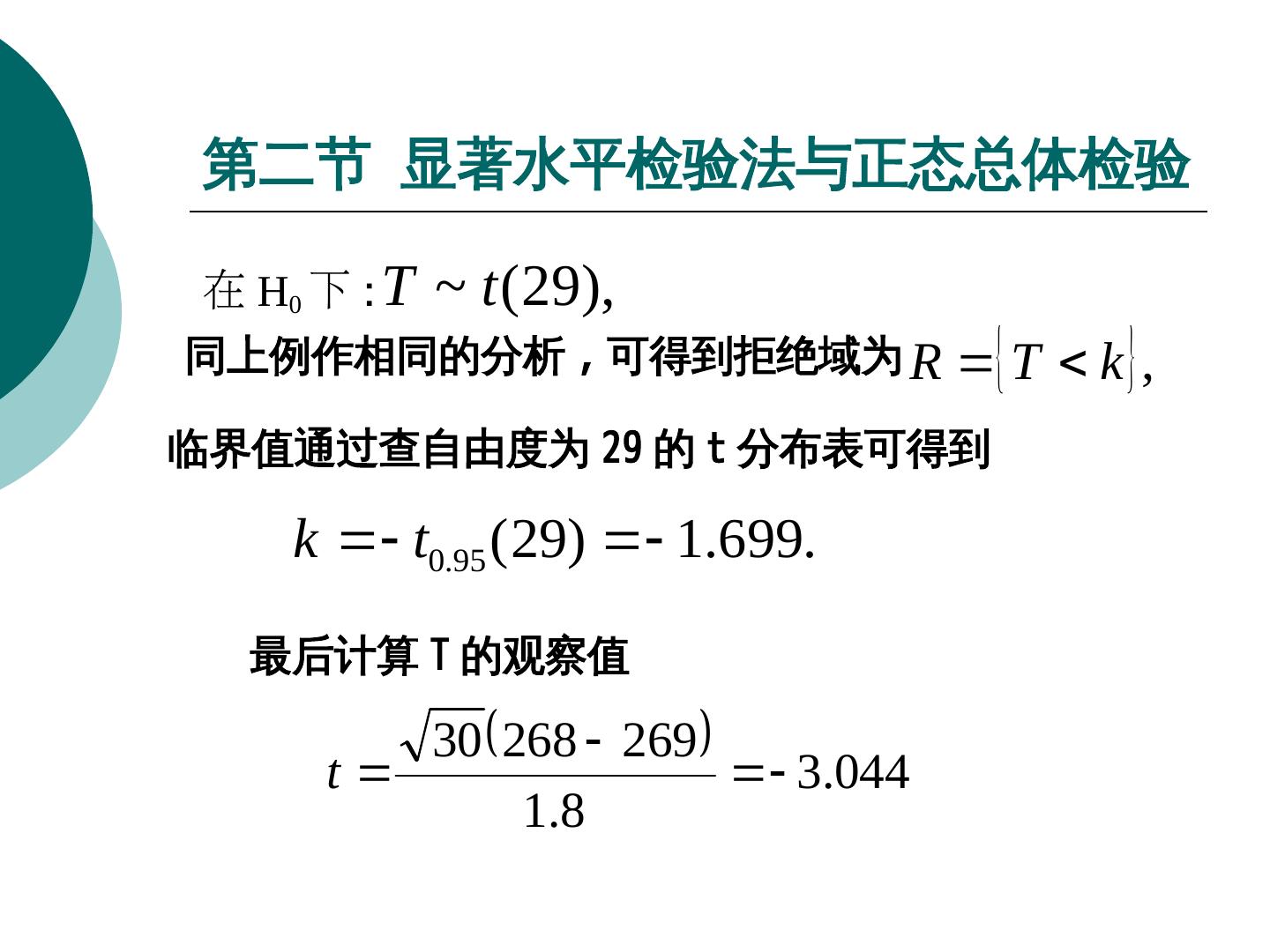 15 . 第二节 显著水平检验法与正态总体检验 在 H0 下 : T ~ t ( 29), 同上例作相同的分析 , 可得到拒绝域为 R T k , 临界值通过查自由度为 29 的 t 分布表可得到 k t0.95 ( 29) 1.699. 最后计算 T 的观察值 30 268 269 t 3.044 1.8