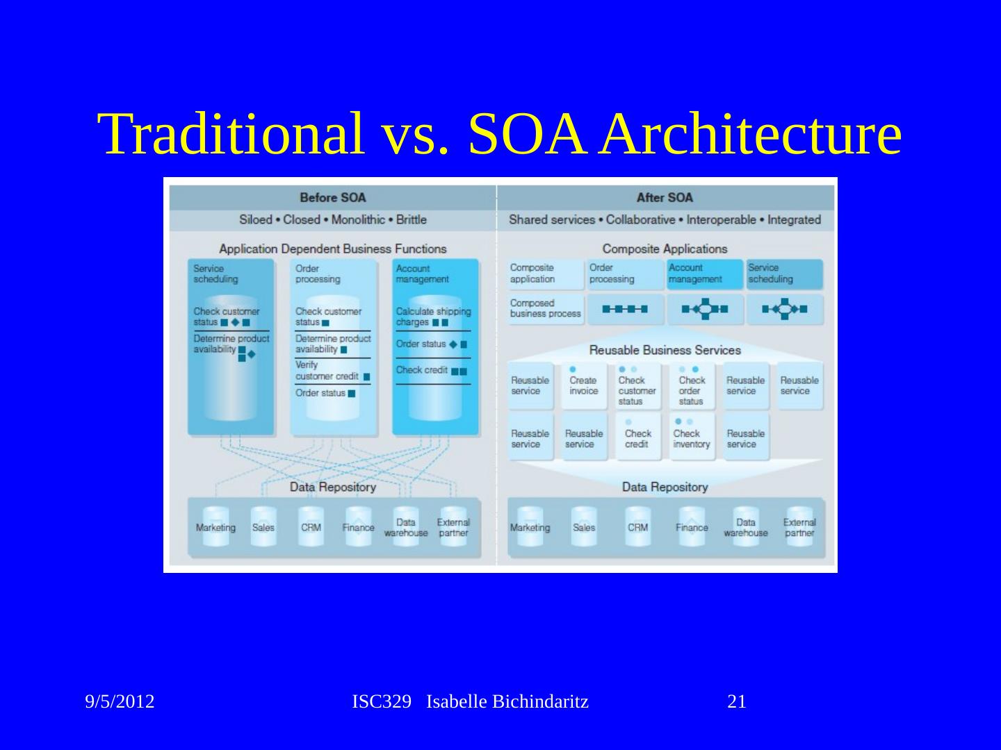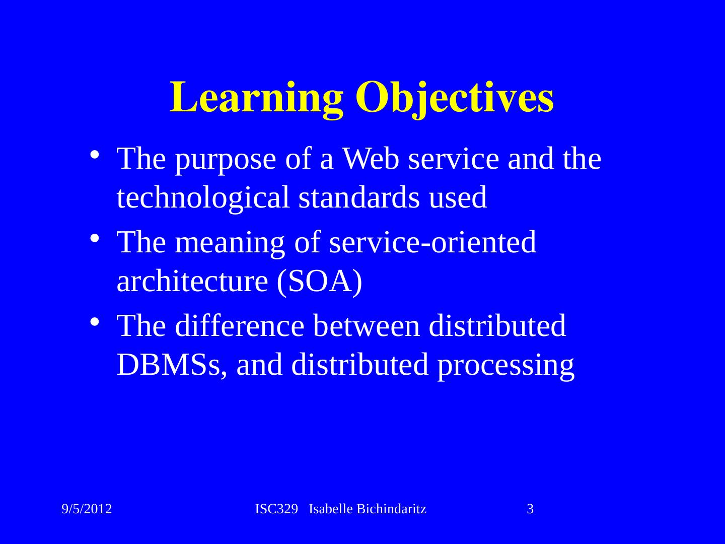 The purpose of a Web service and the technological standards used; The meaning of service-oriented architecture (SOA); The difference between distributed ...