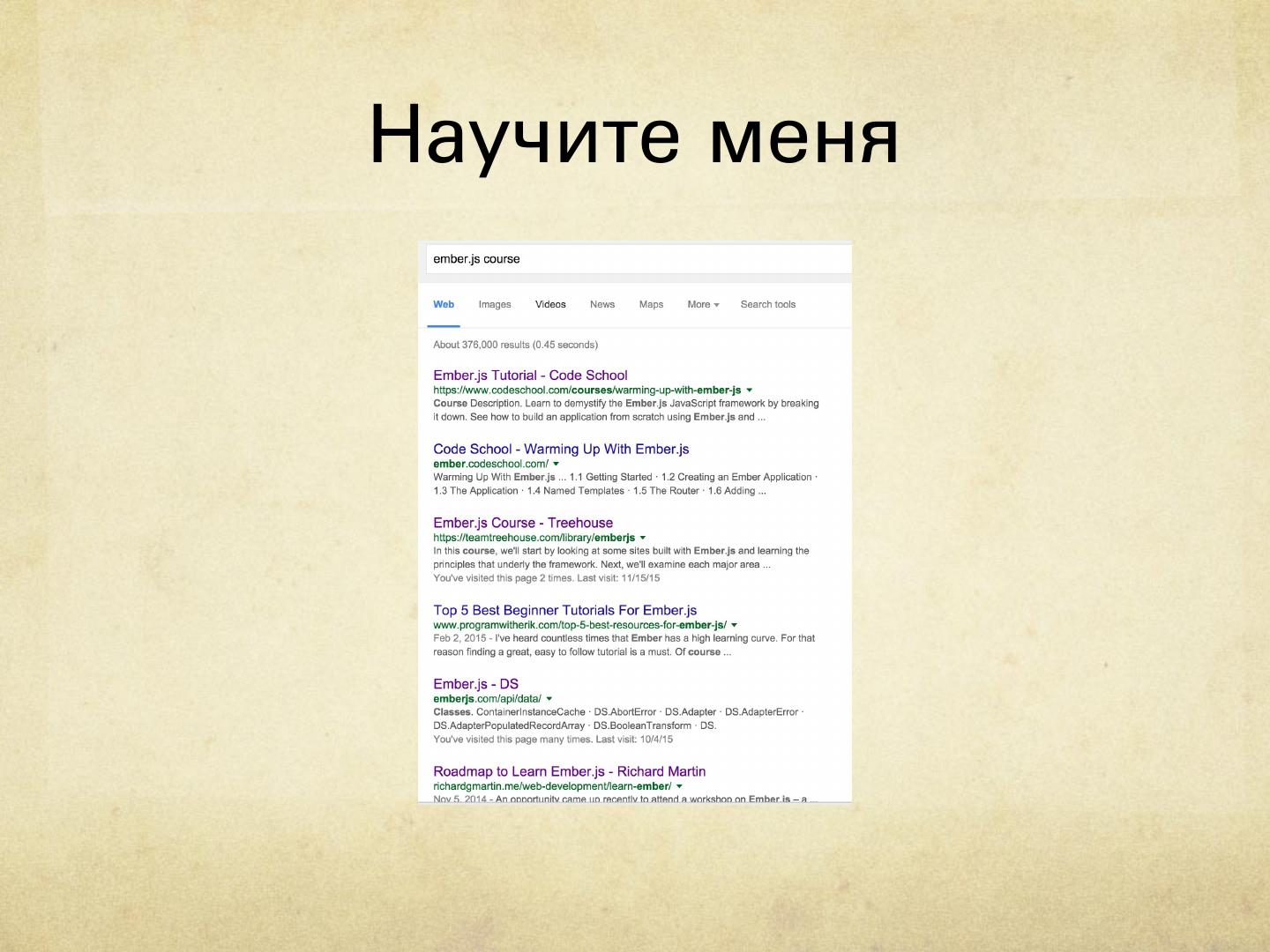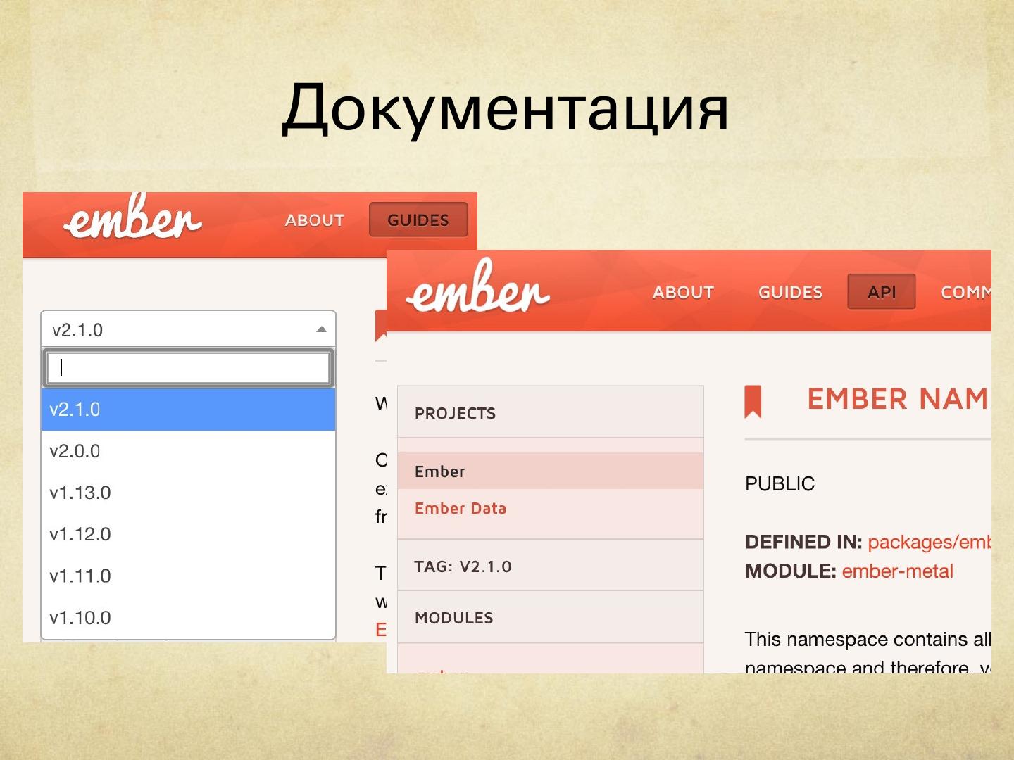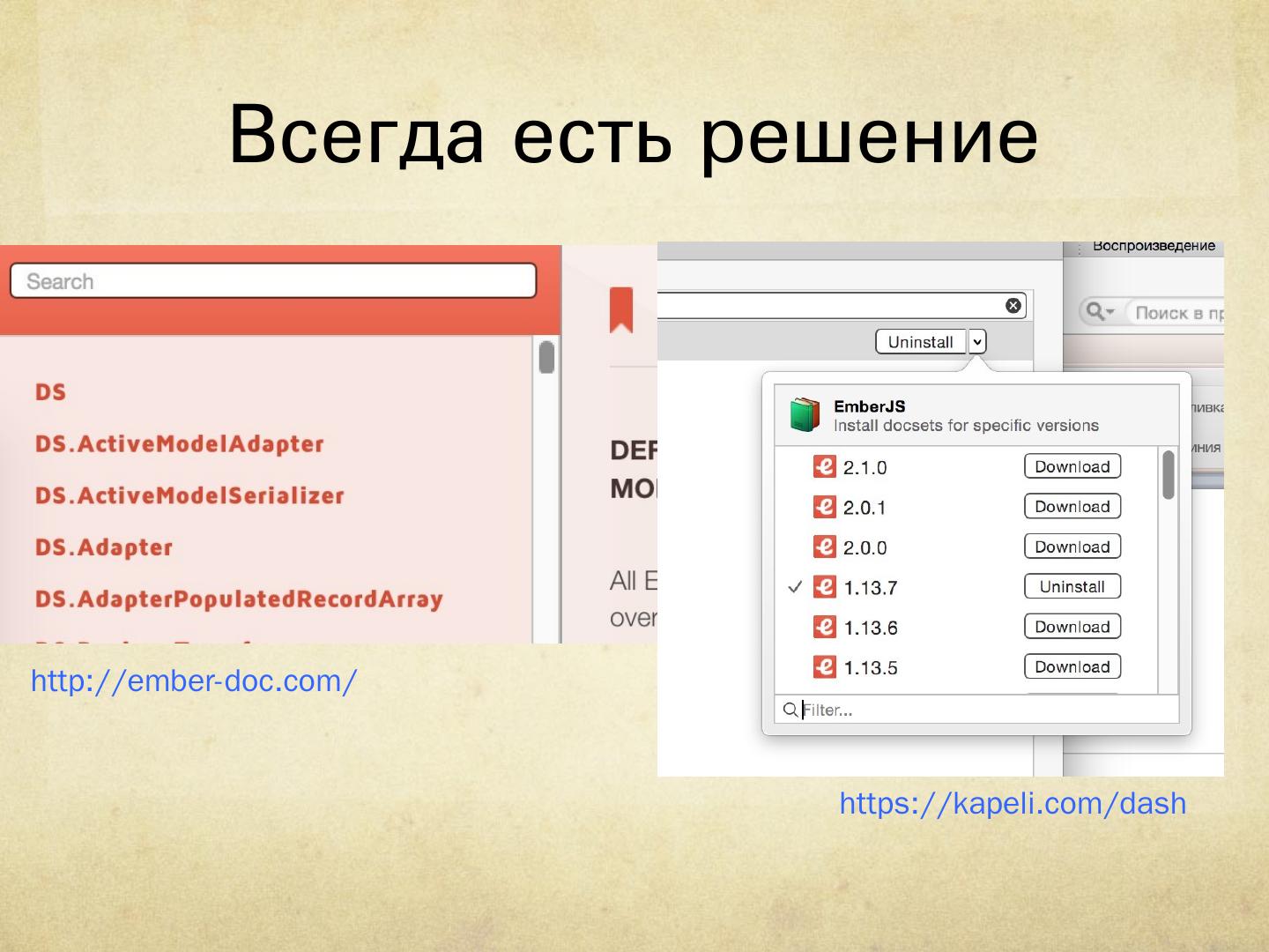 jscs. Ember 2. API для внутреннего пользования? Документация. Всегда есть решение. http://ember-doc.com/. https://kapeli.com/dash. Научите меня. SO.