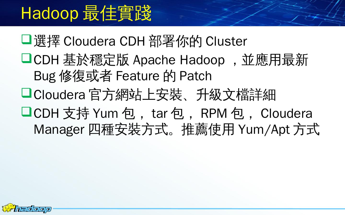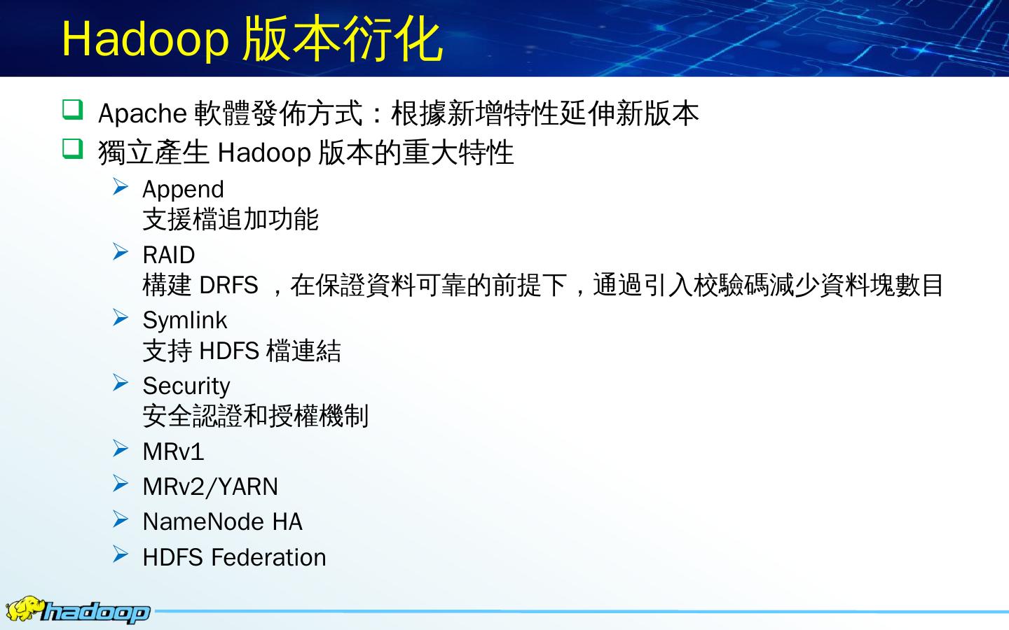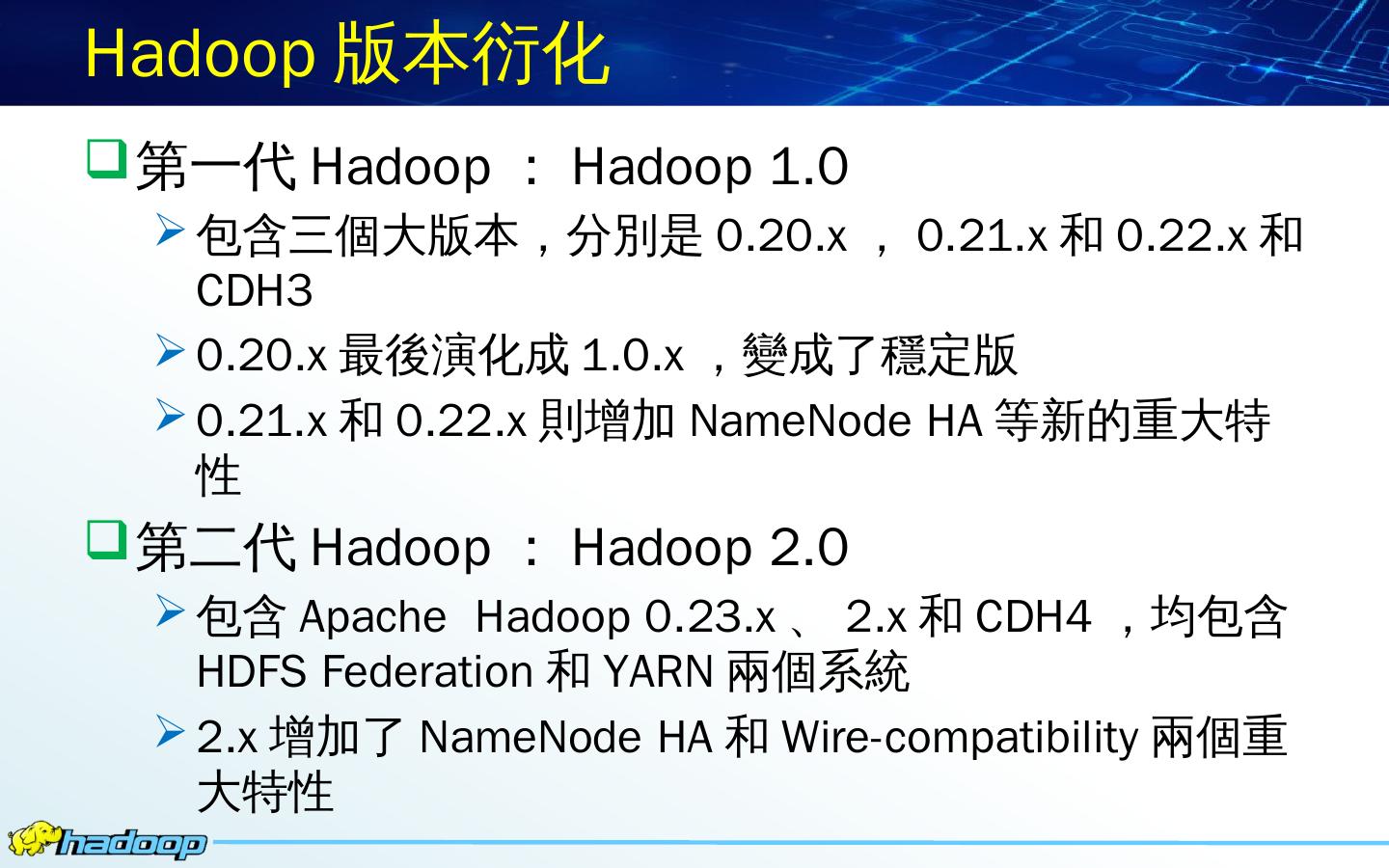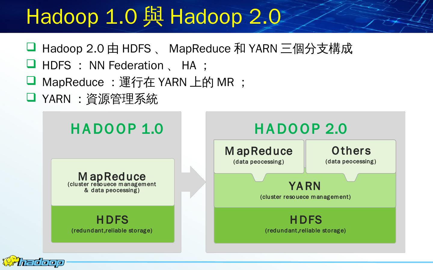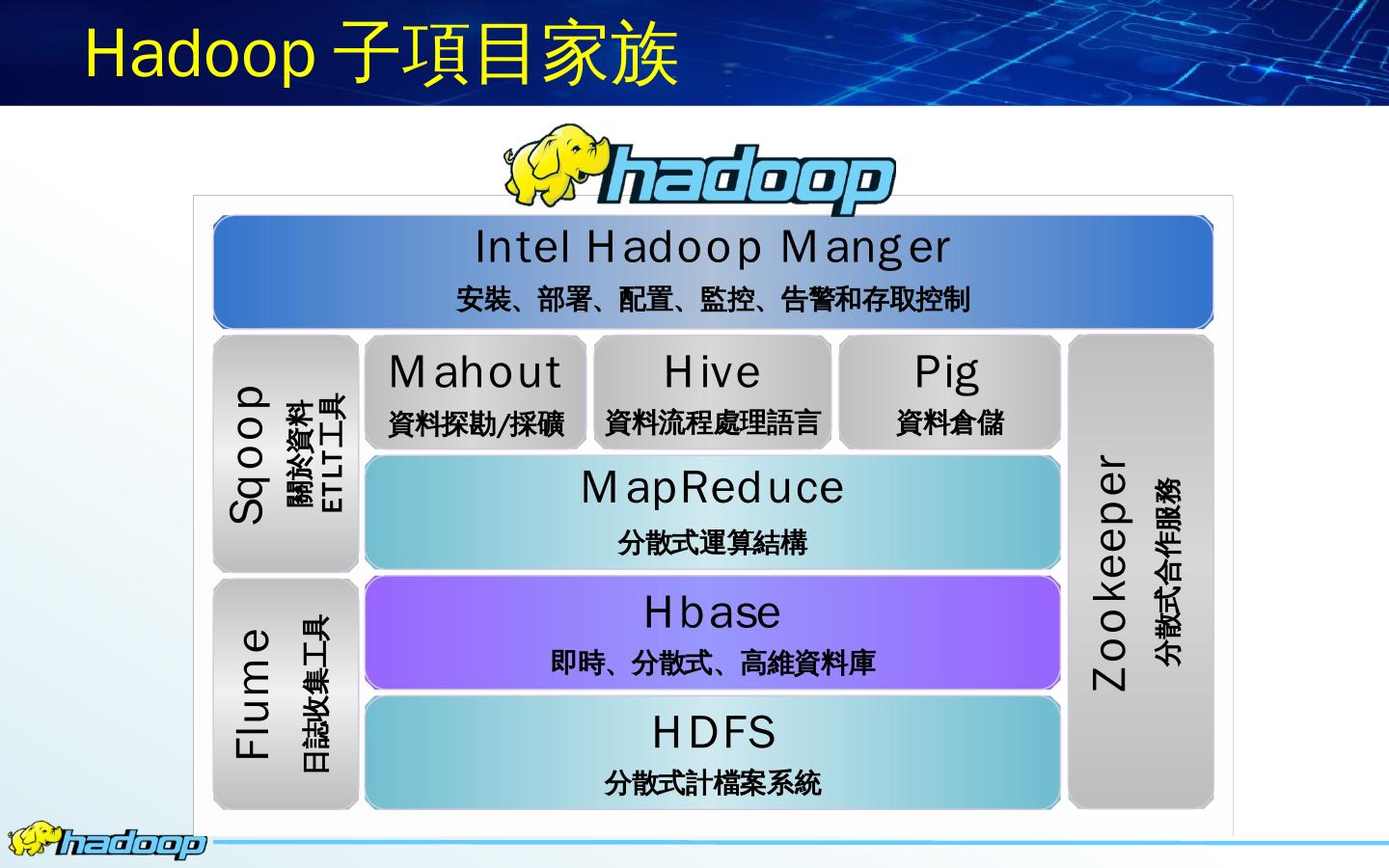 包含Apache Hadoop 0.23.x、2.x和CDH4,均包含HDFS Federation和YARN兩個 ... 生態系統由Hadoop、HBase、Hive、Pig、Sqoop、Flume、Mahout、Zookeeper等 ...