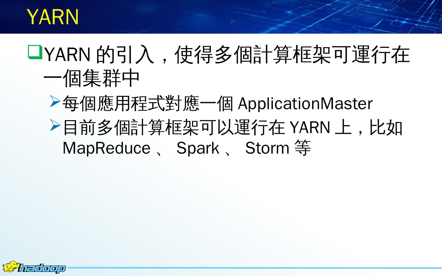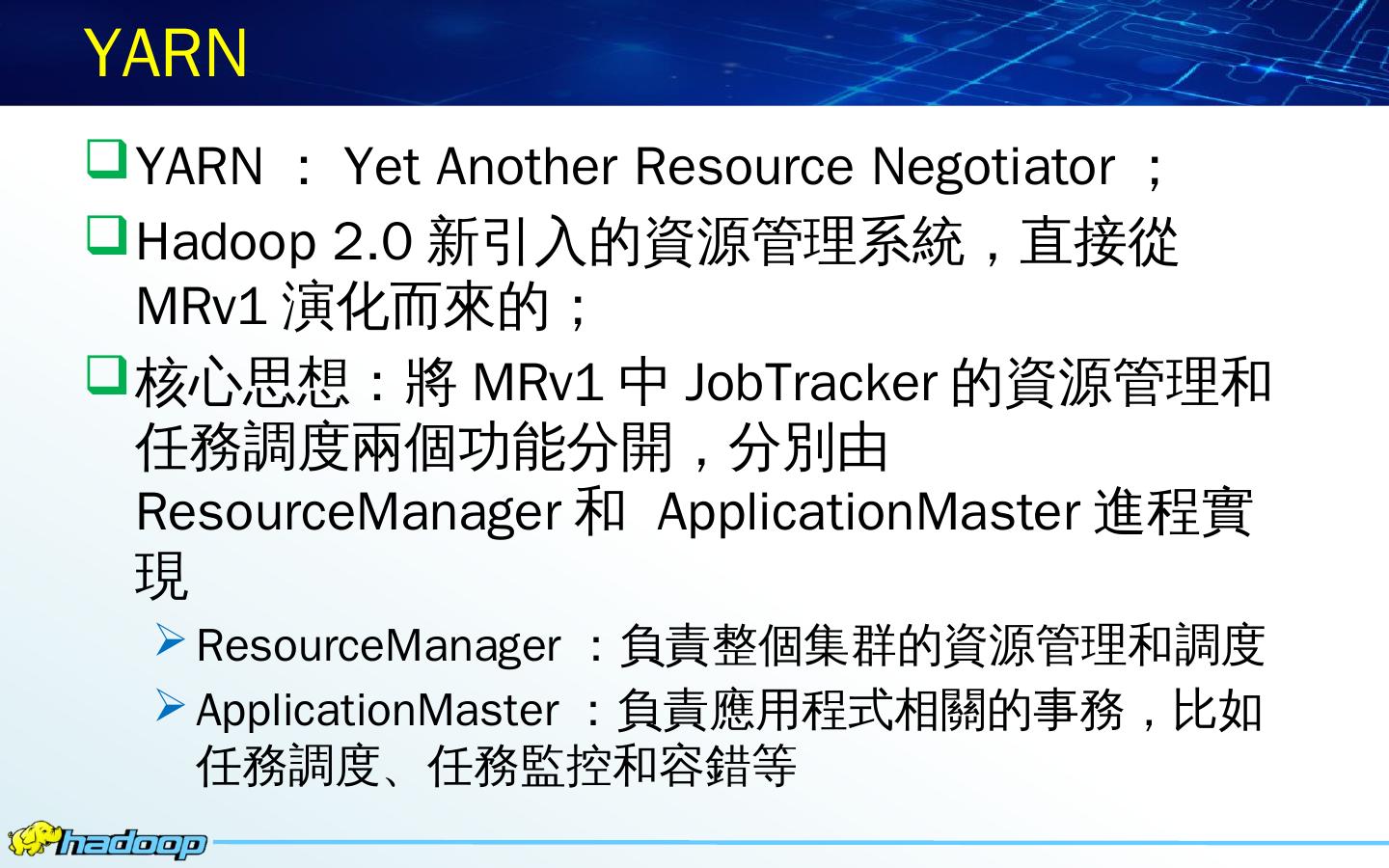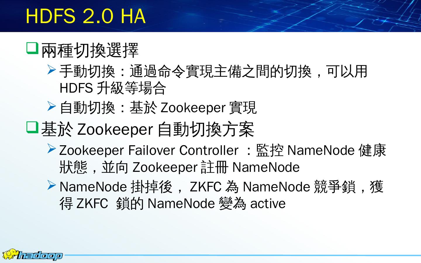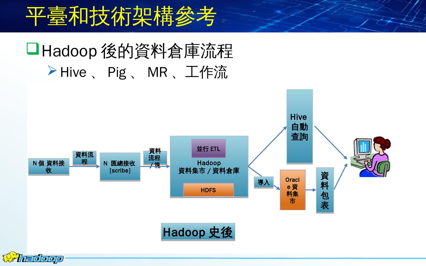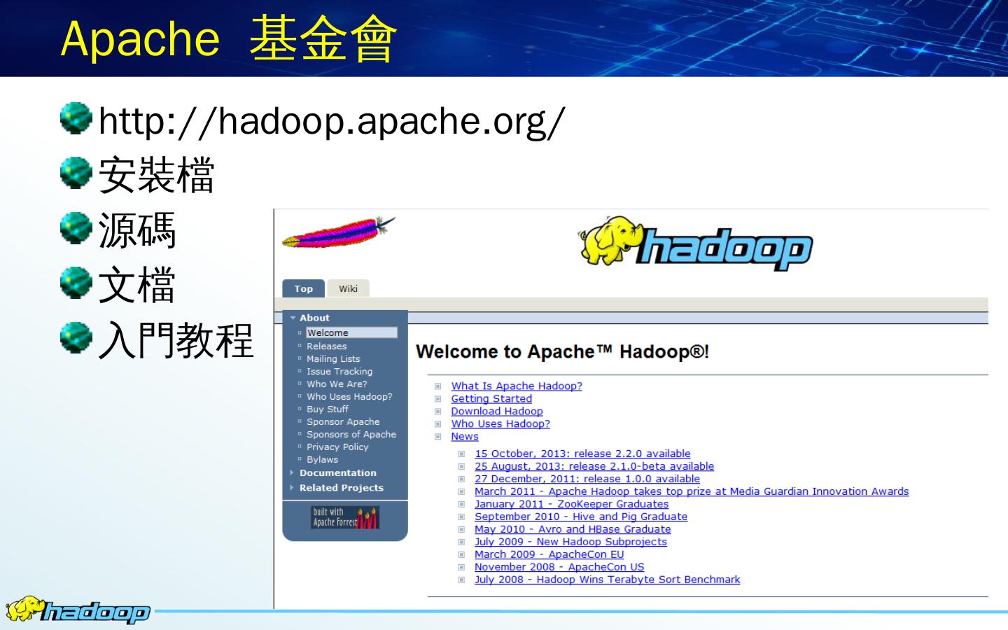 包含Apache Hadoop 0.23.x、2.x和CDH4,均包含HDFS Federation和YARN兩個 ... 生態系統由Hadoop、HBase、Hive、Pig、Sqoop、Flume、Mahout、Zookeeper等 ...