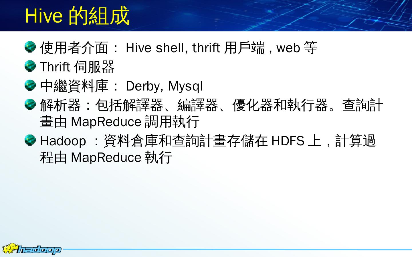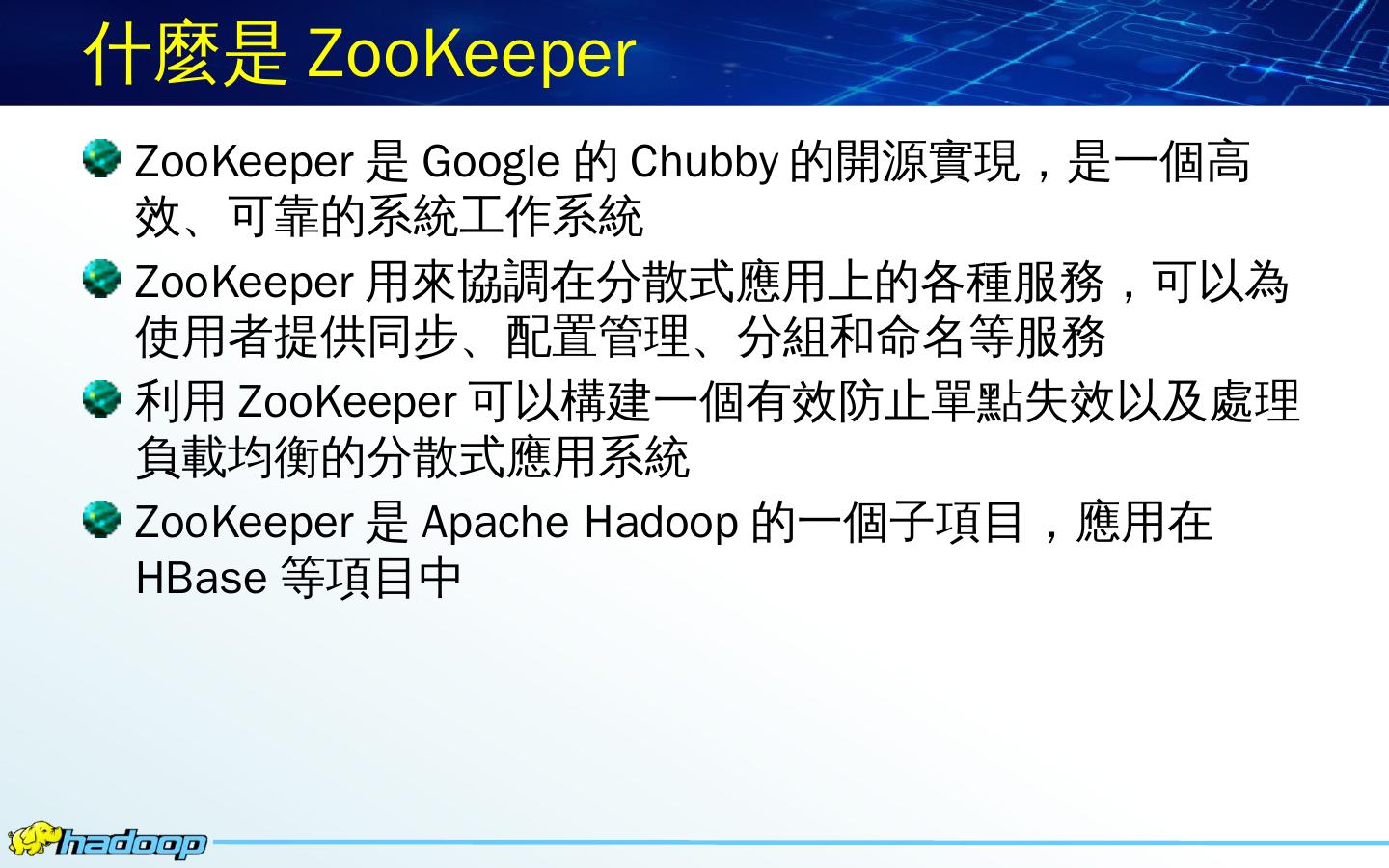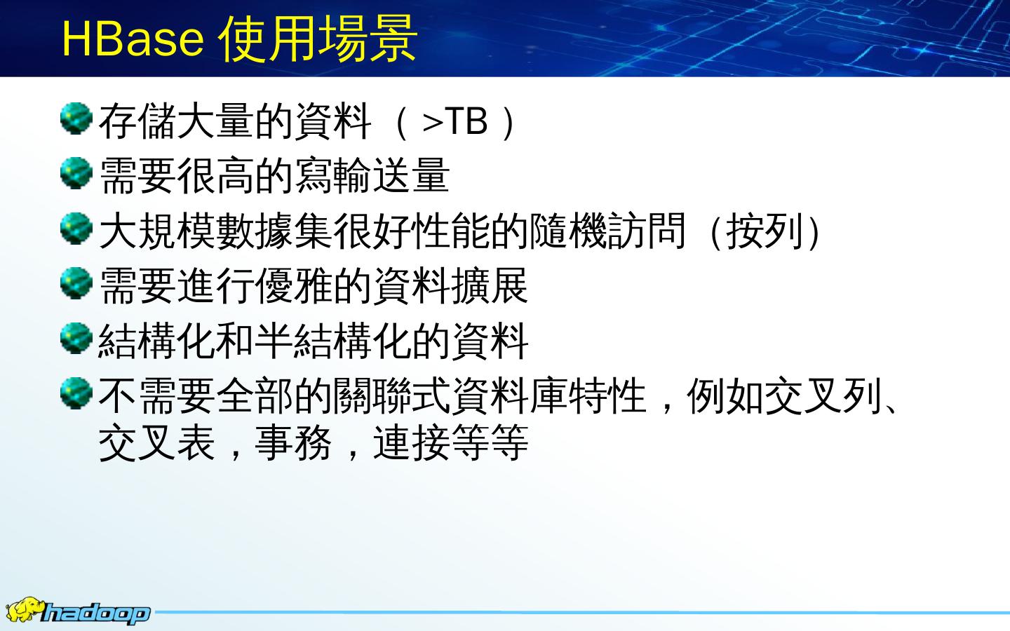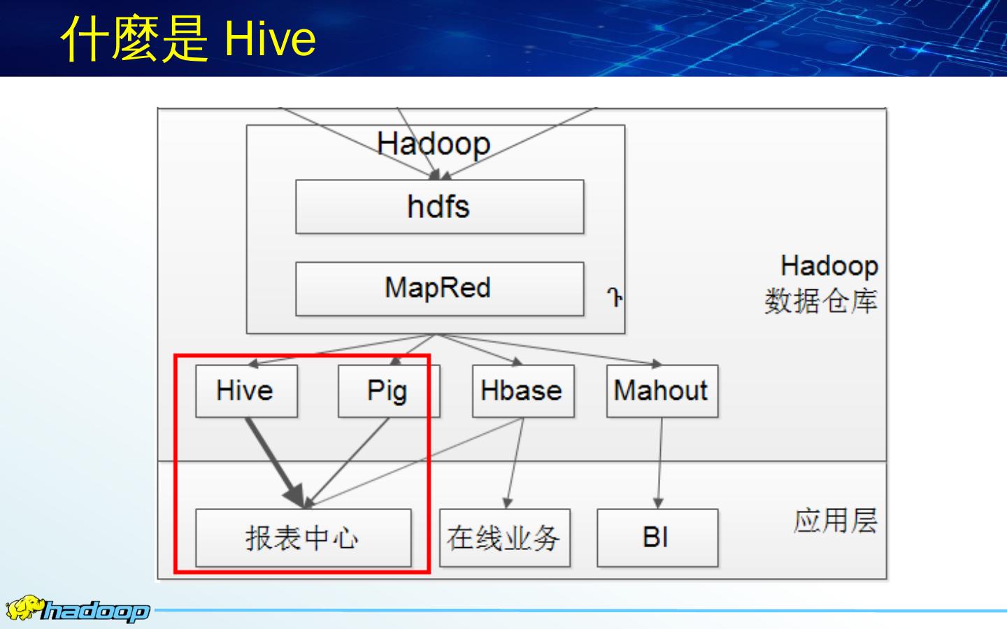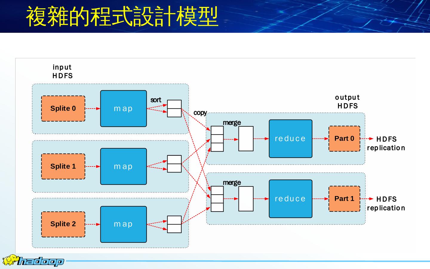 包含Apache Hadoop 0.23.x、2.x和CDH4,均包含HDFS Federation和YARN兩個 ... 生態系統由Hadoop、HBase、Hive、Pig、Sqoop、Flume、Mahout、Zookeeper等 ...