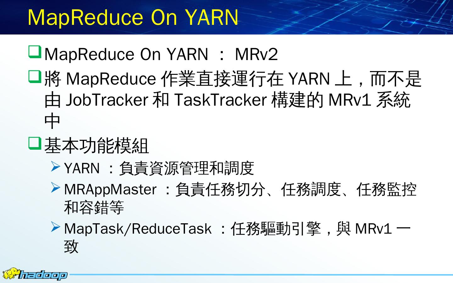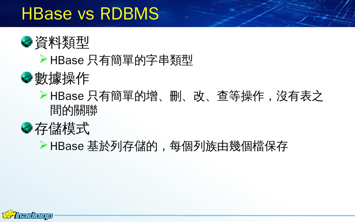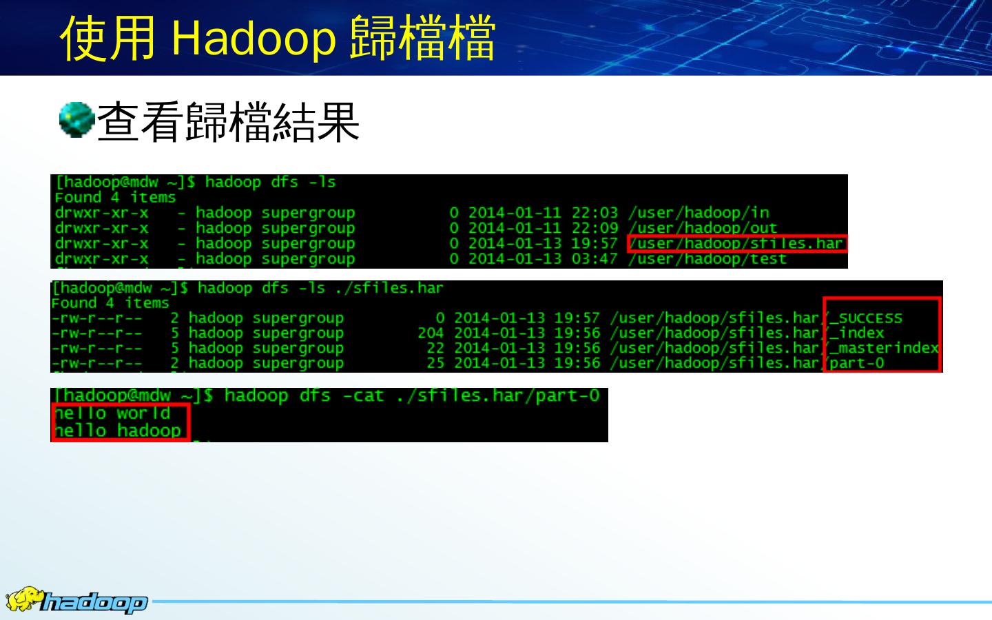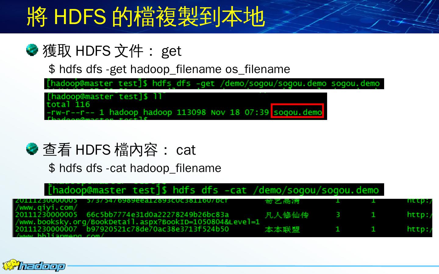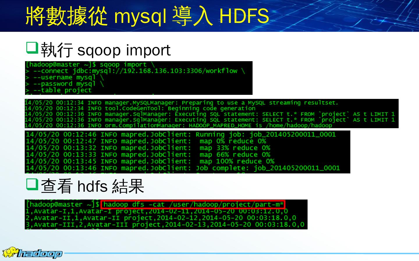 包含Apache Hadoop 0.23.x、2.x和CDH4,均包含HDFS Federation和YARN兩個 ... 生態系統由Hadoop、HBase、Hive、Pig、Sqoop、Flume、Mahout、Zookeeper等 ...