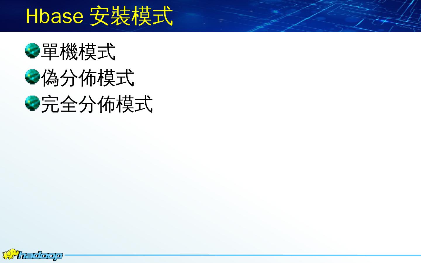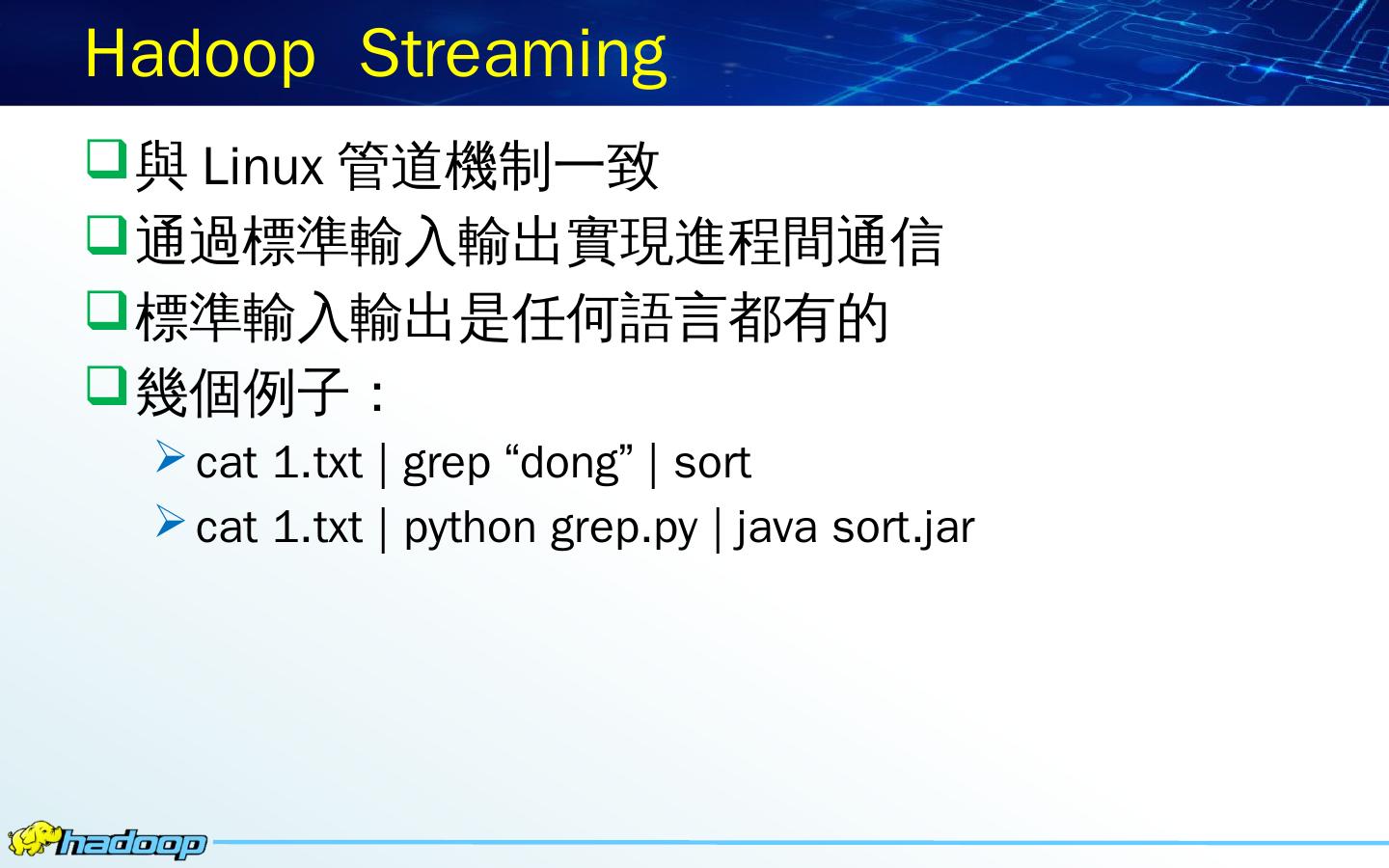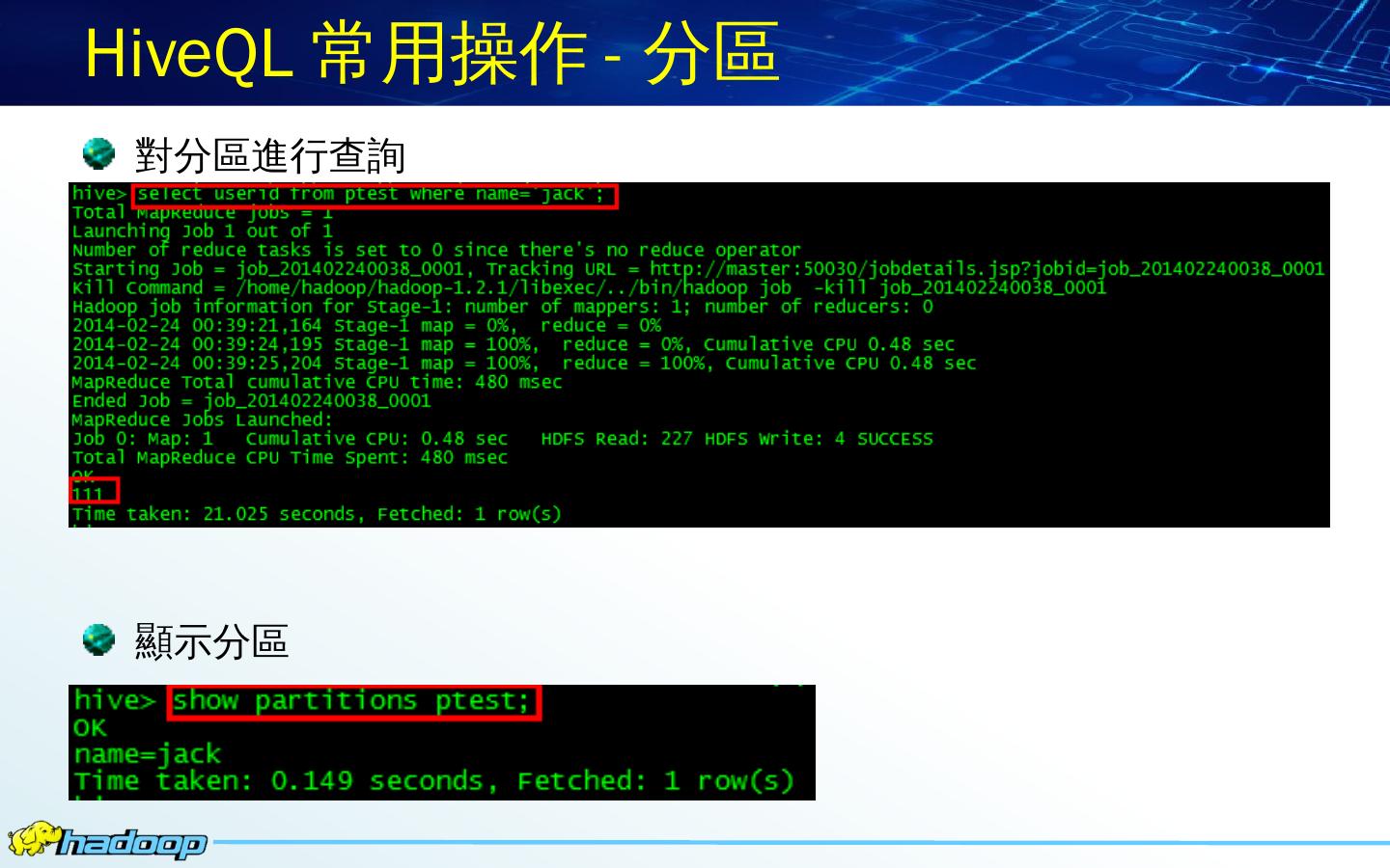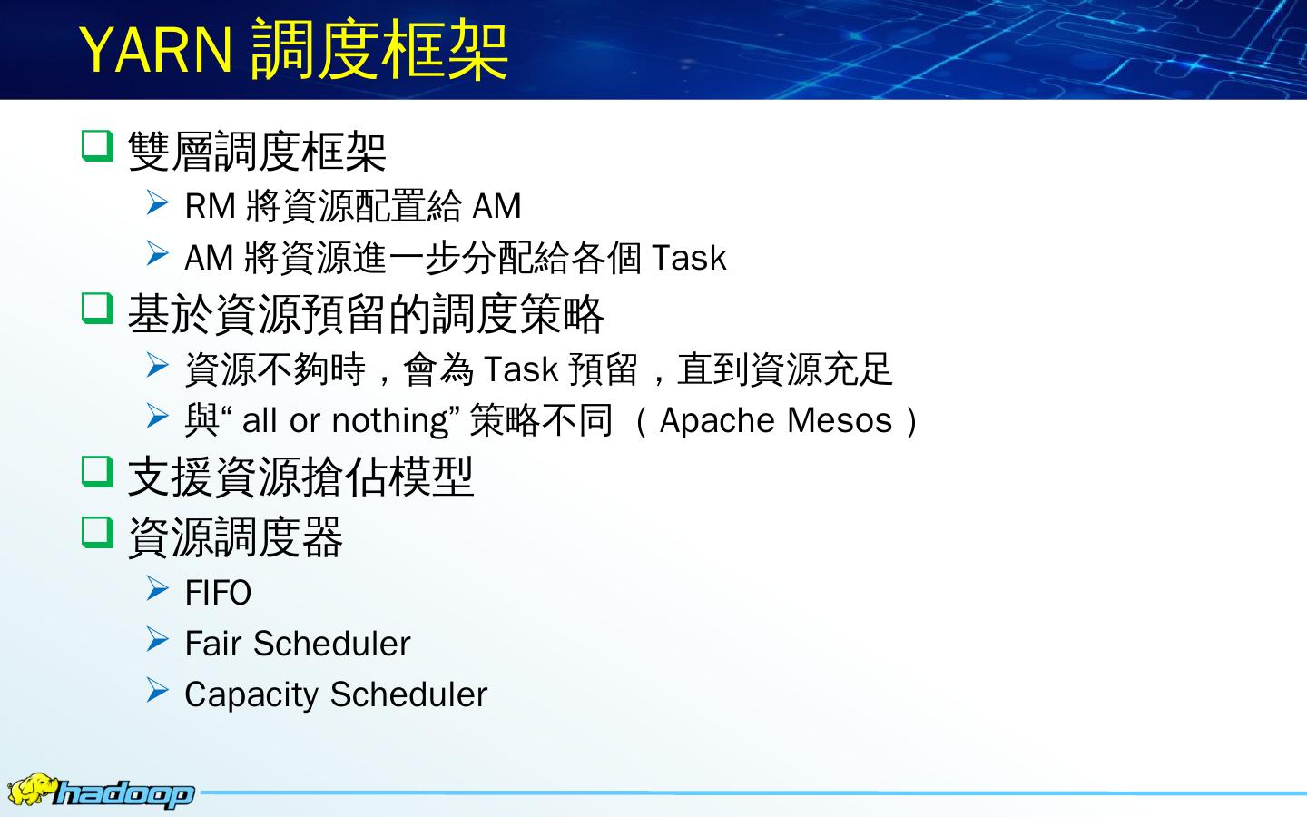 包含Apache Hadoop 0.23.x、2.x和CDH4,均包含HDFS Federation和YARN兩個 ... 生態系統由Hadoop、HBase、Hive、Pig、Sqoop、Flume、Mahout、Zookeeper等 ...