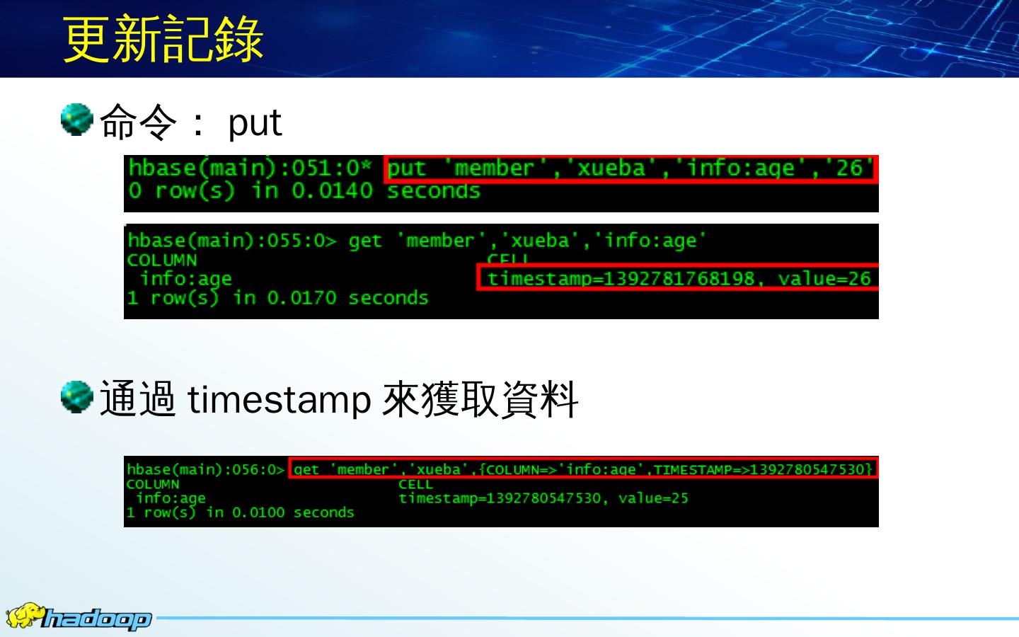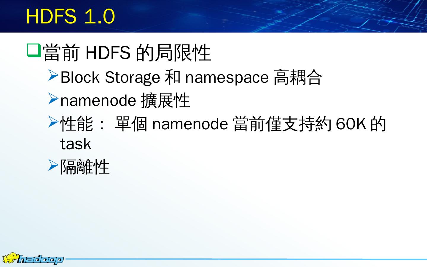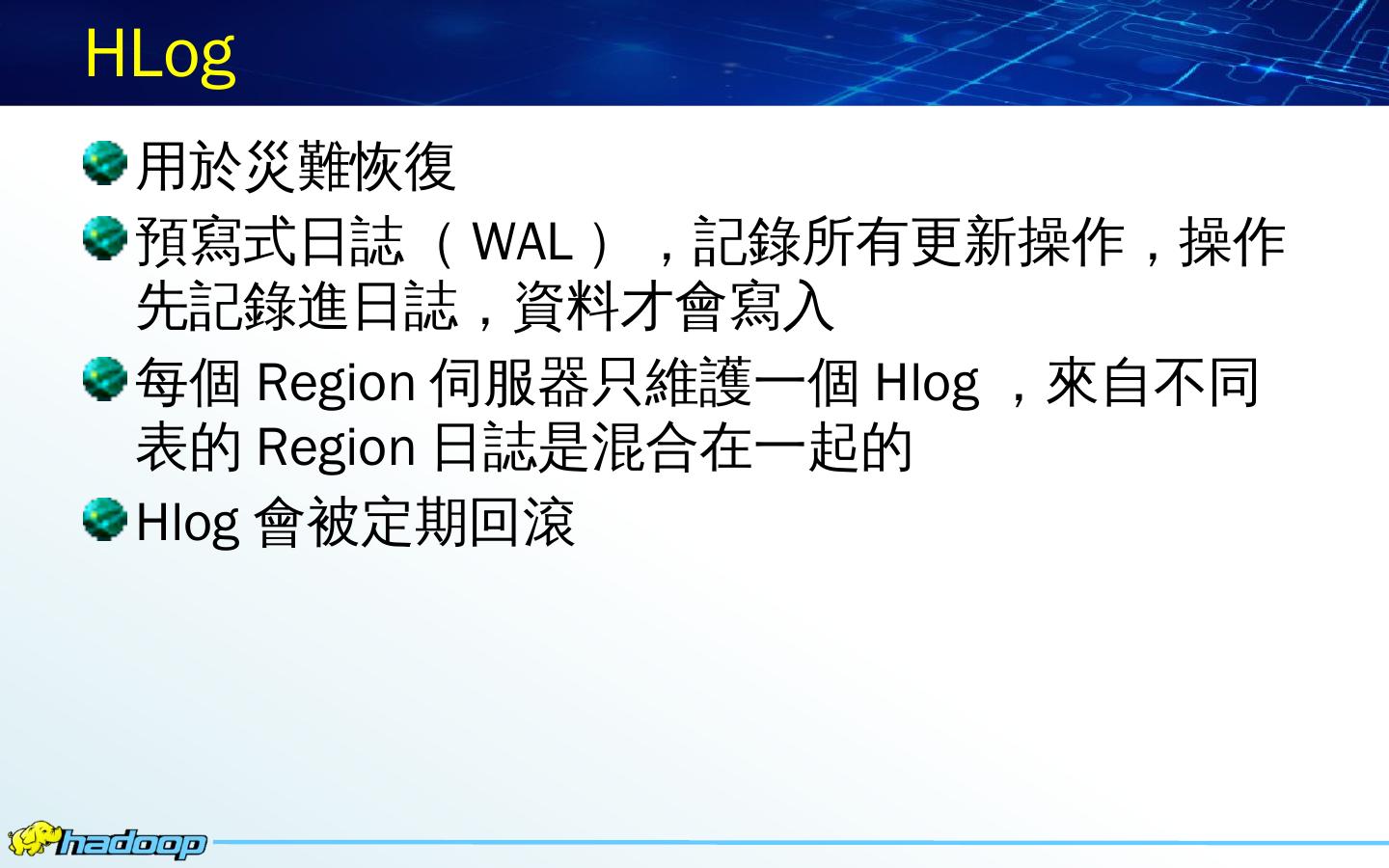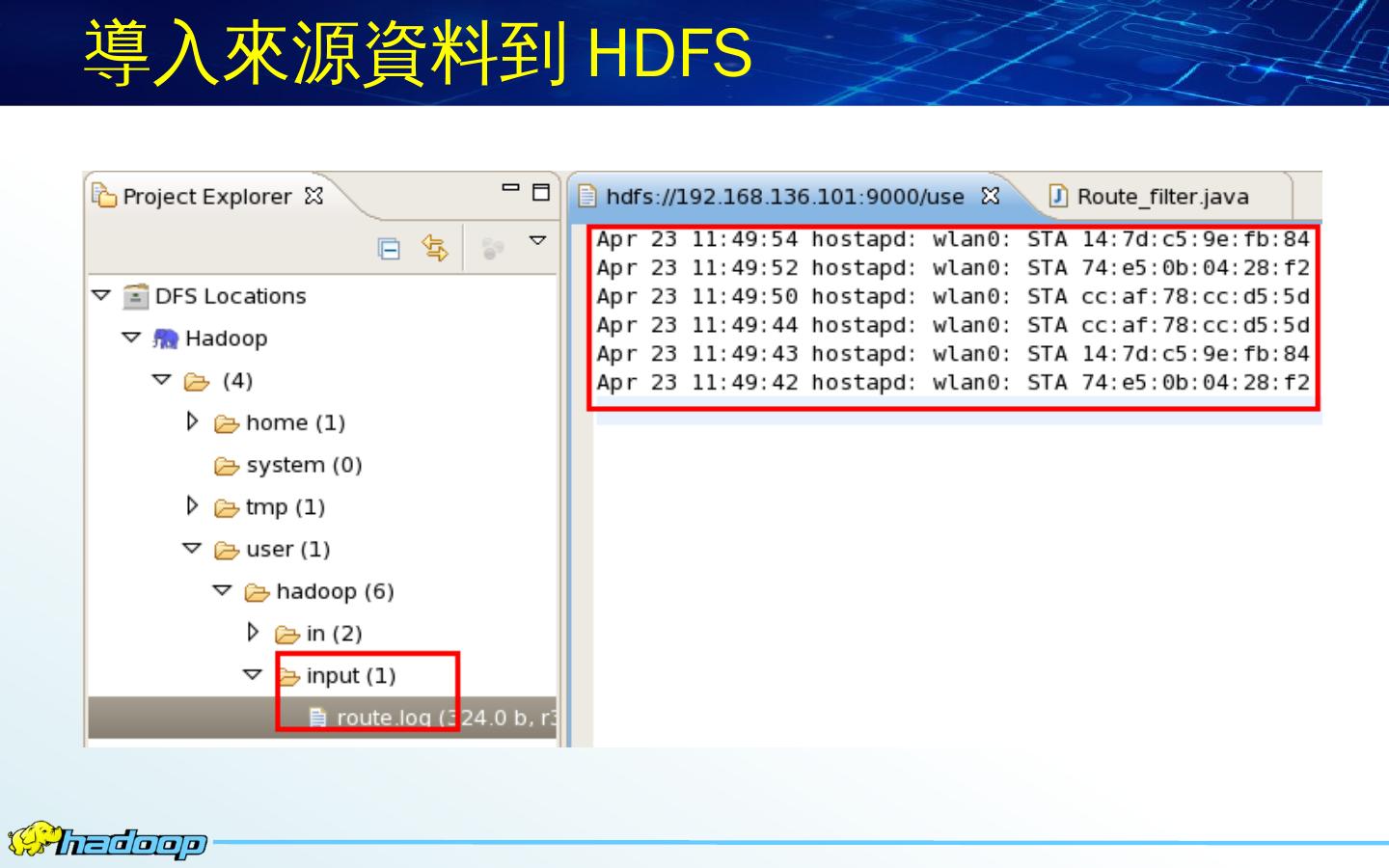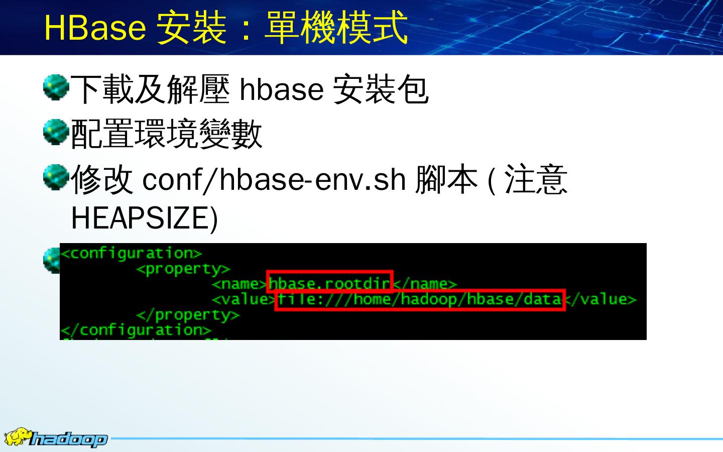 包含Apache Hadoop 0.23.x、2.x和CDH4,均包含HDFS Federation和YARN兩個 ... 生態系統由Hadoop、HBase、Hive、Pig、Sqoop、Flume、Mahout、Zookeeper等 ...