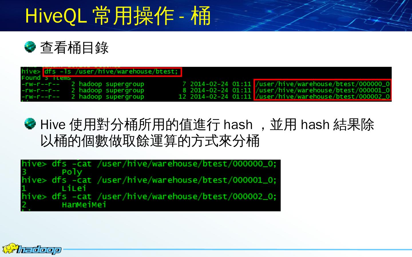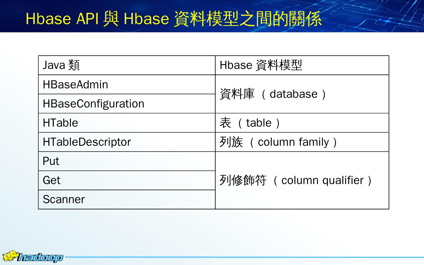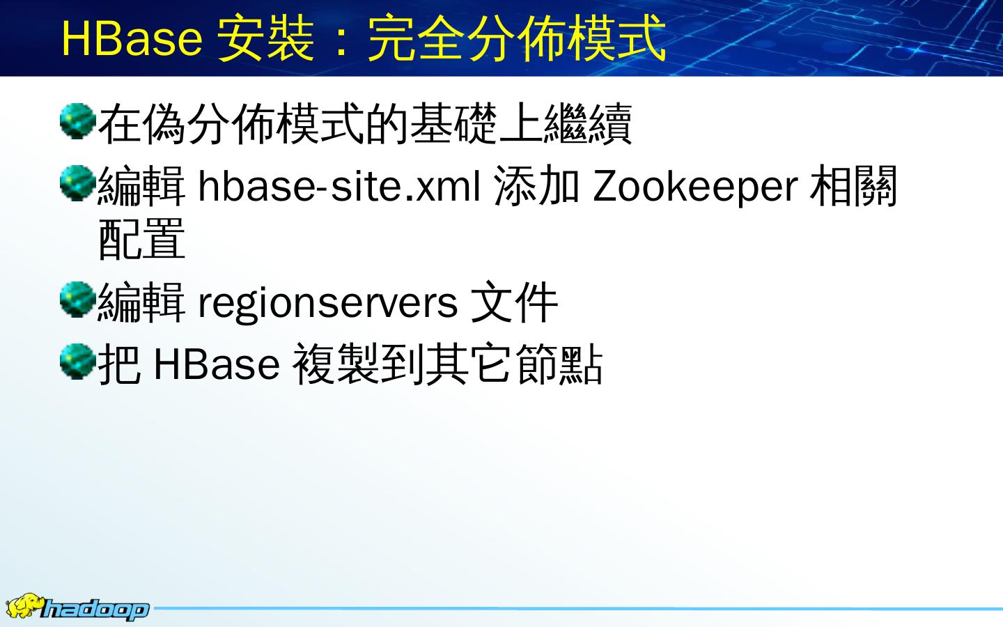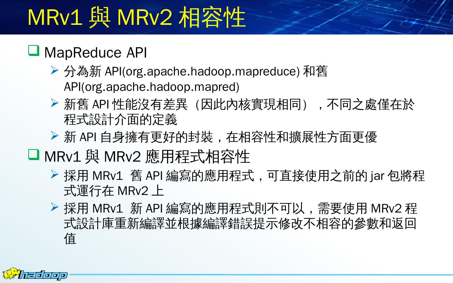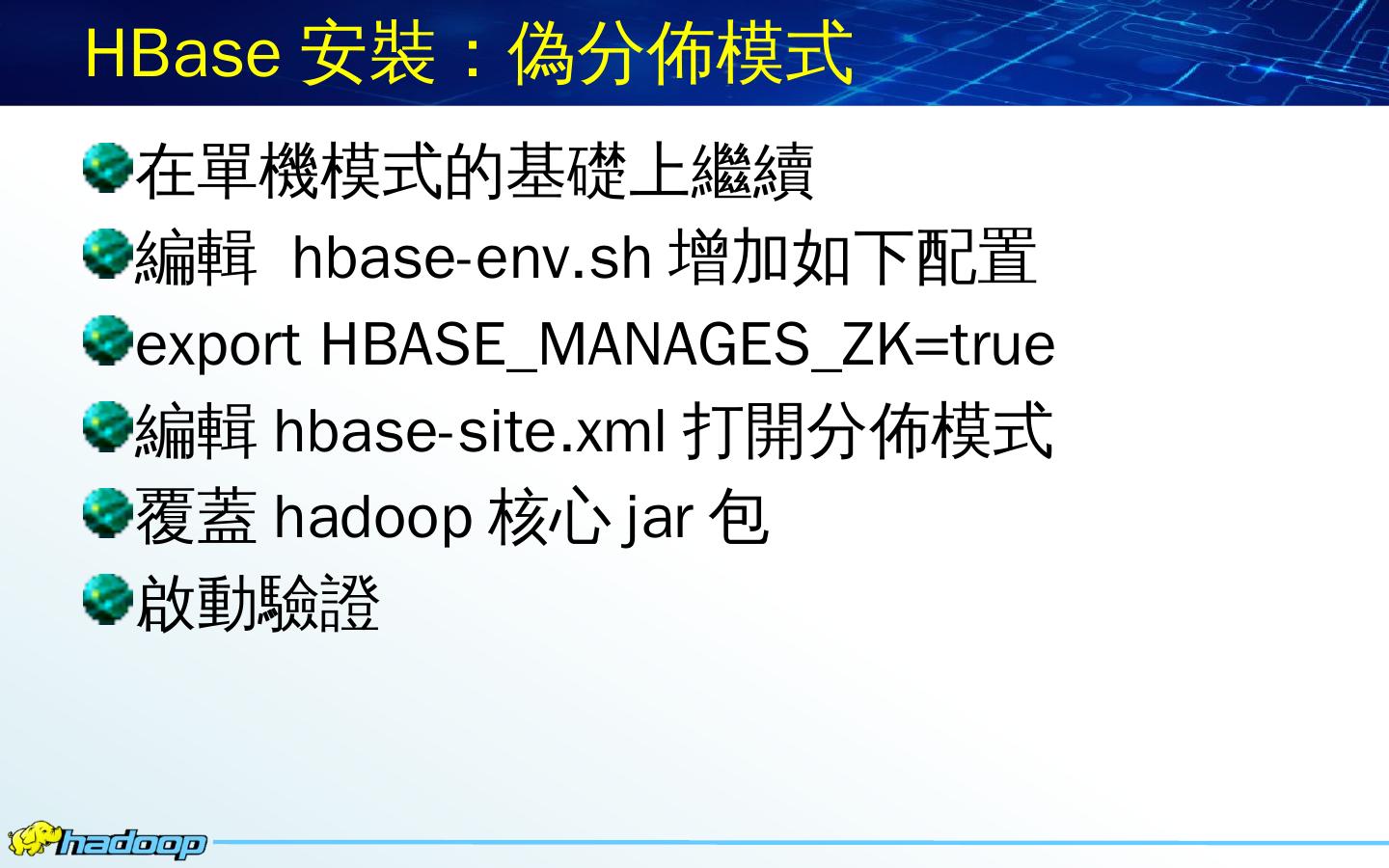 包含Apache Hadoop 0.23.x、2.x和CDH4,均包含HDFS Federation和YARN兩個 ... 生態系統由Hadoop、HBase、Hive、Pig、Sqoop、Flume、Mahout、Zookeeper等 ...