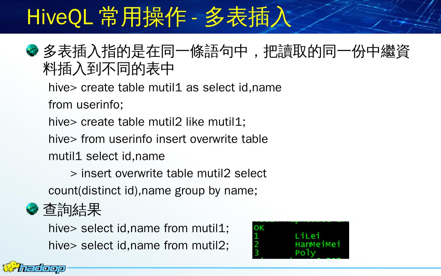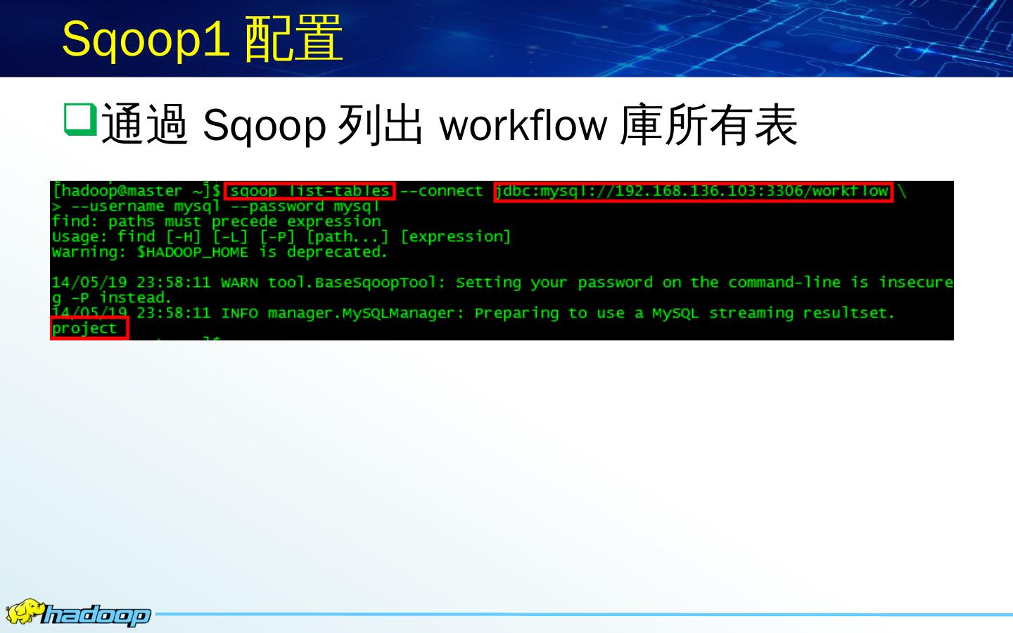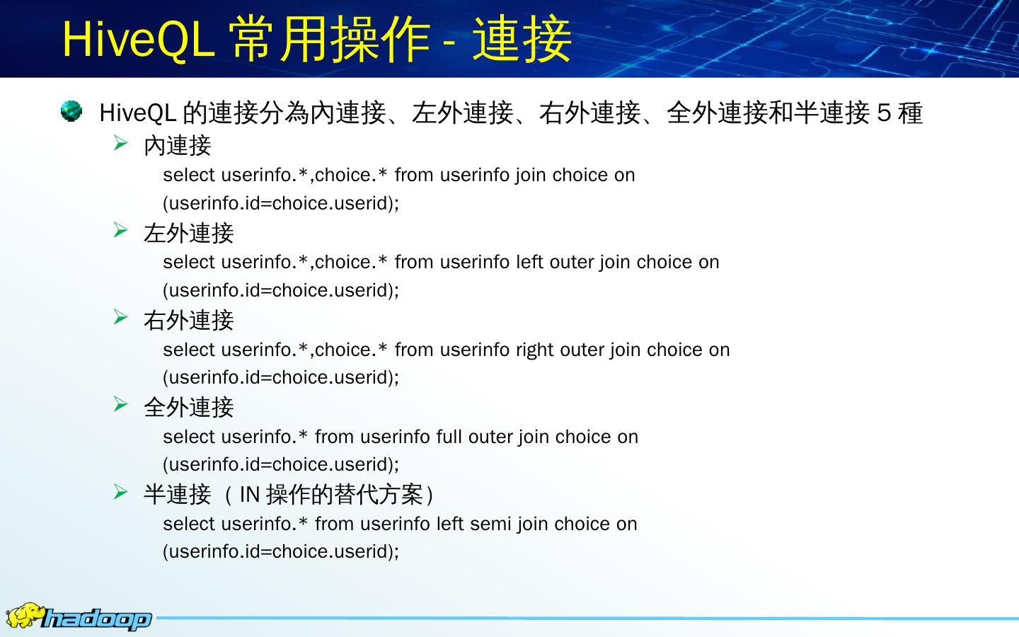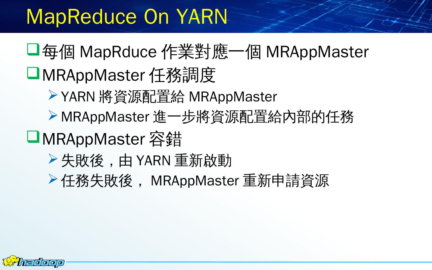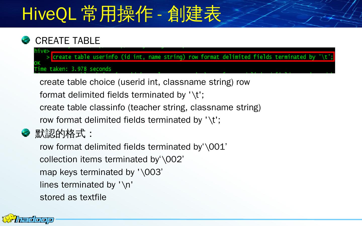 包含Apache Hadoop 0.23.x、2.x和CDH4,均包含HDFS Federation和YARN兩個 ... 生態系統由Hadoop、HBase、Hive、Pig、Sqoop、Flume、Mahout、Zookeeper等 ...
