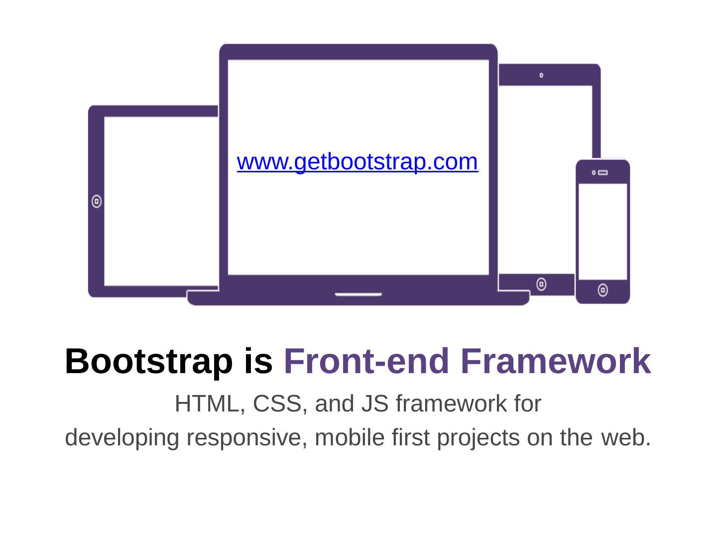 Introduction to Bootstrap. Bootstrap is Front-end Framework. HTML, CSS, and JS framework for developing responsive, mobile first projects on the web.