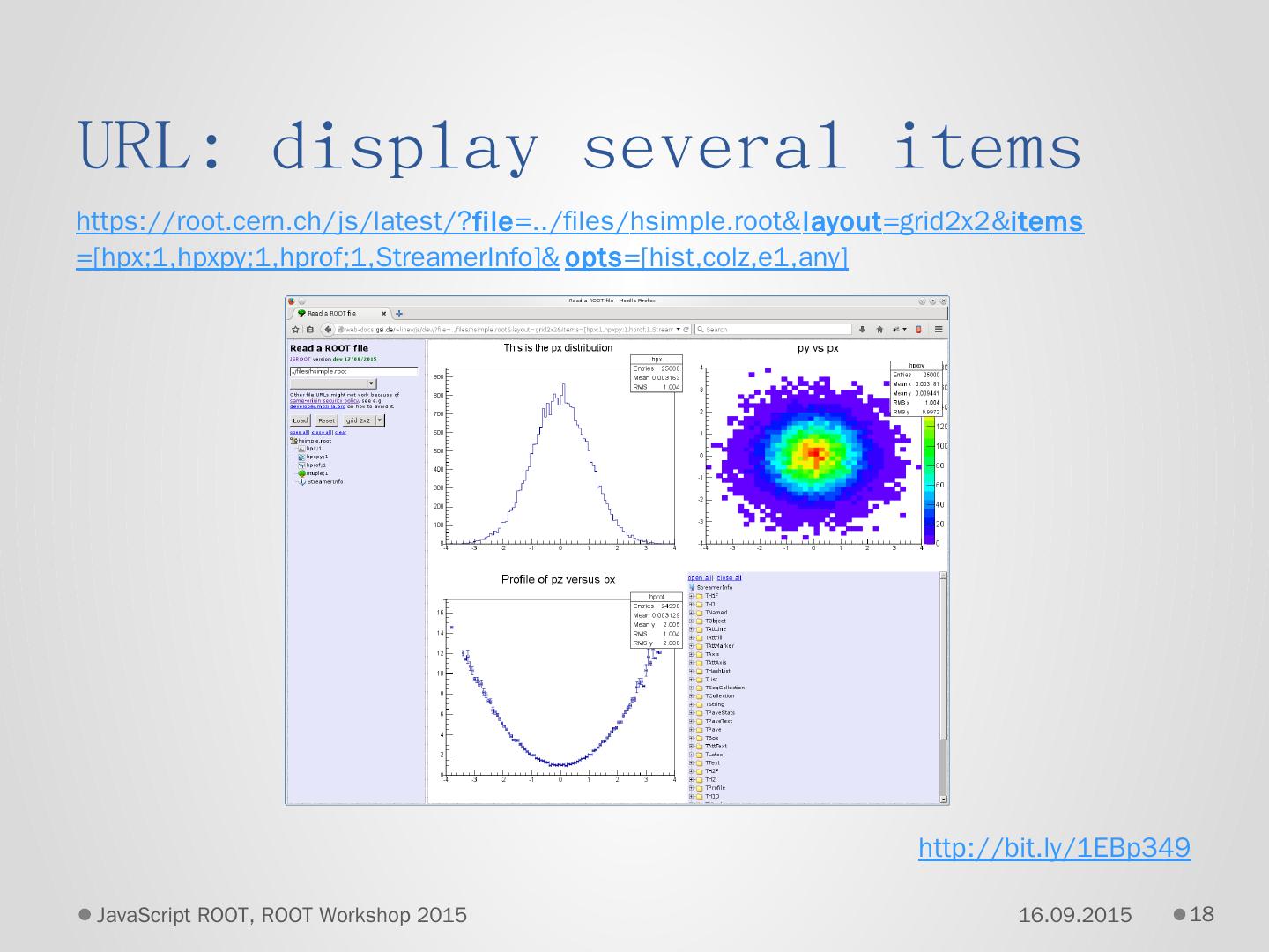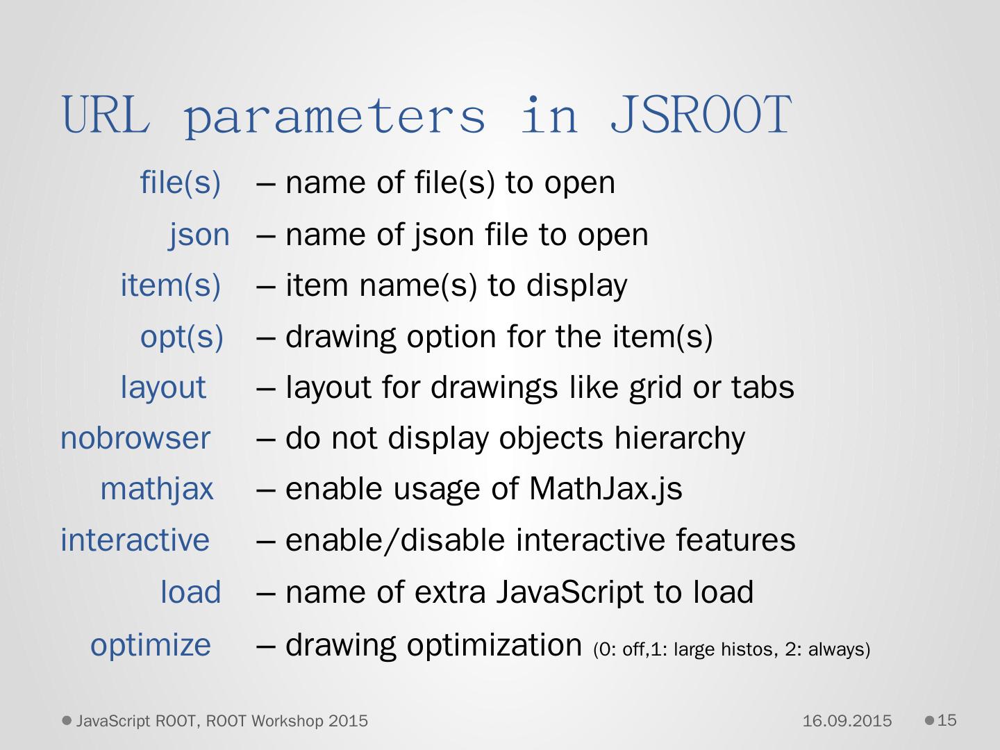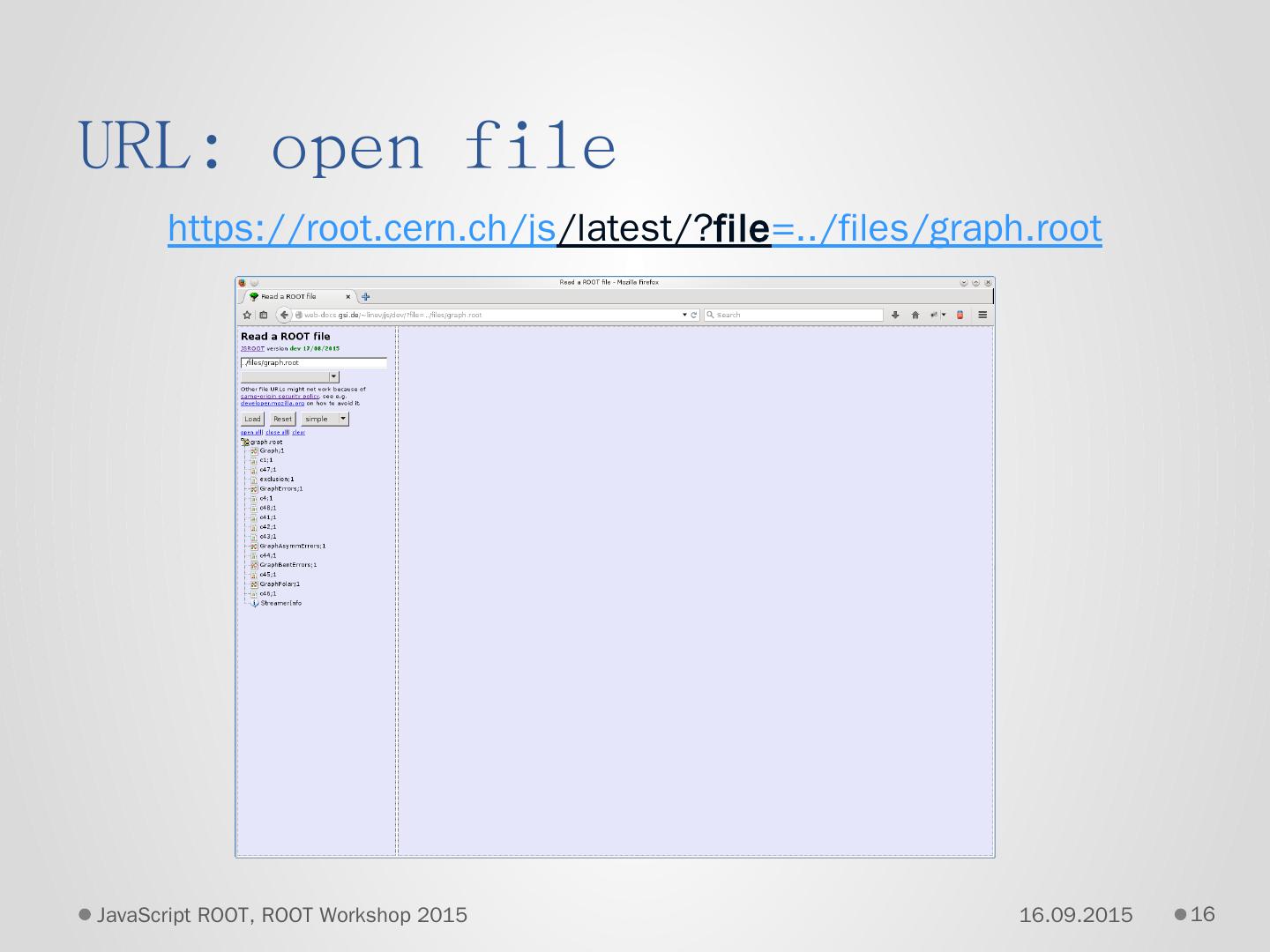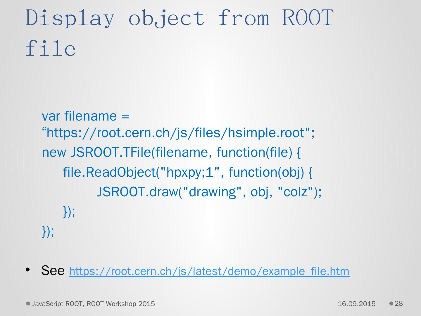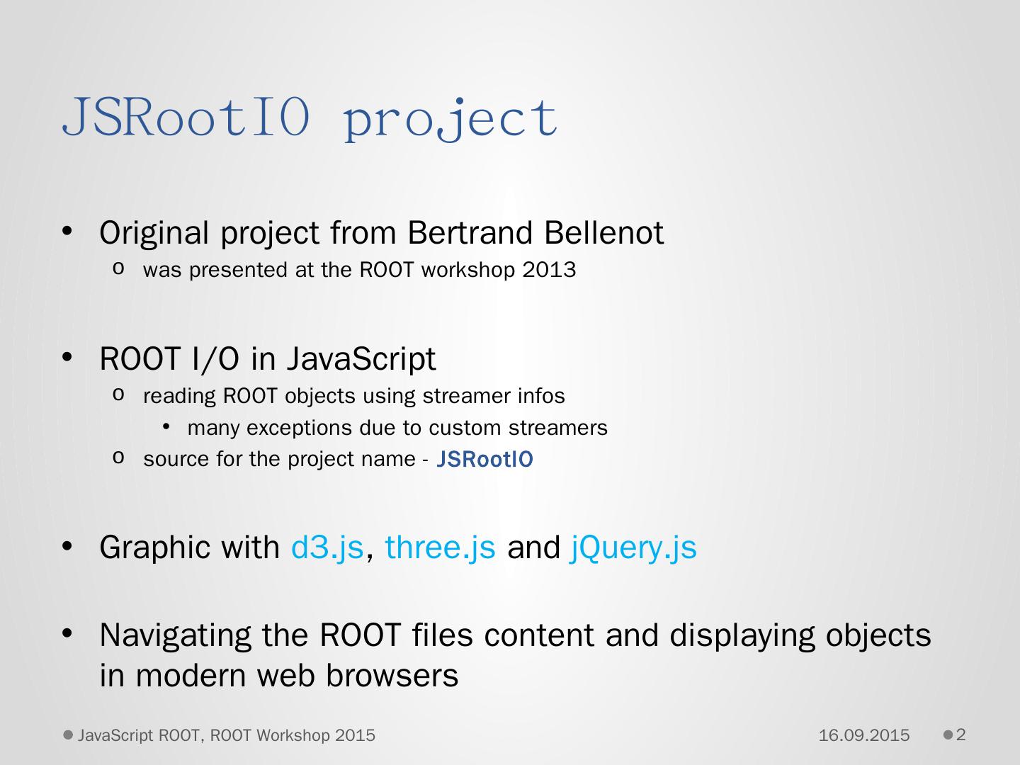 Graphic with d3.js, three.js and jQuery.js. Navigating the ROOT files content and displaying objects in modern web browsers. 16.09.2015. 2. JavaScript ROOT ...