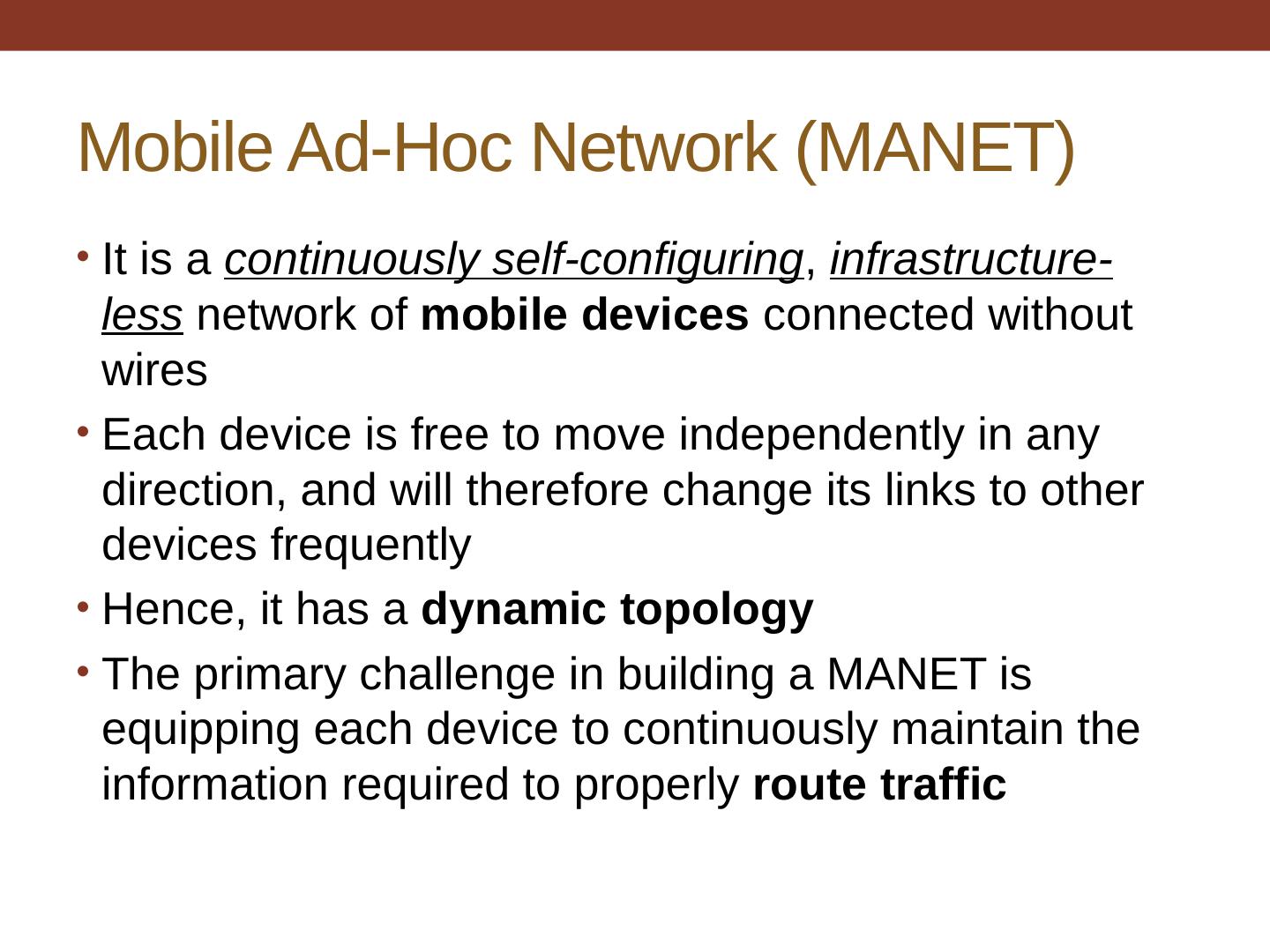 Each device is free to move independently in any direction, and will therefore change its links to other devices frequently. Hence, it has a dynamic topology.The primary challenge in building a MANET is equipping each device to continuously maintain the information required to properly route traffic;
