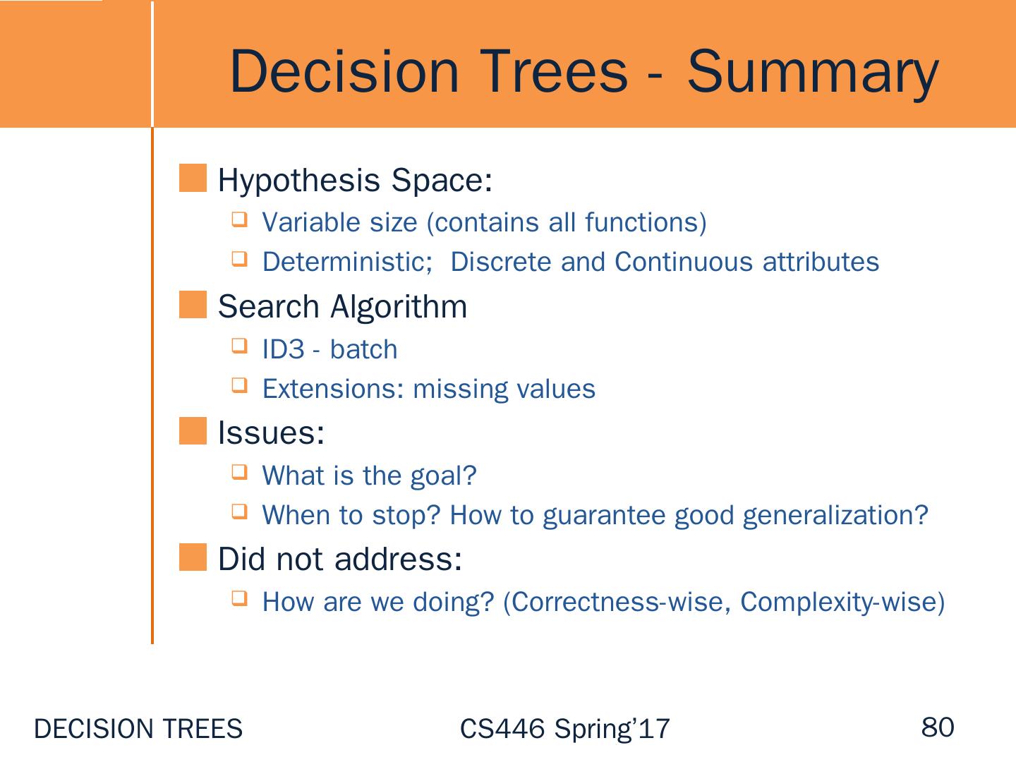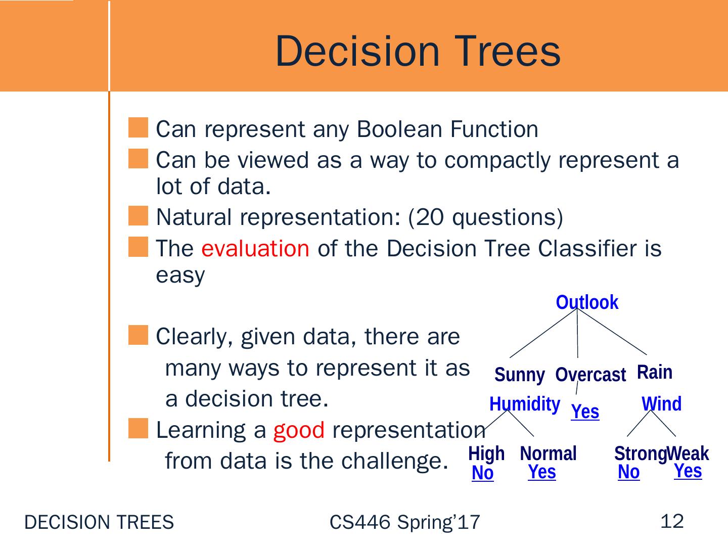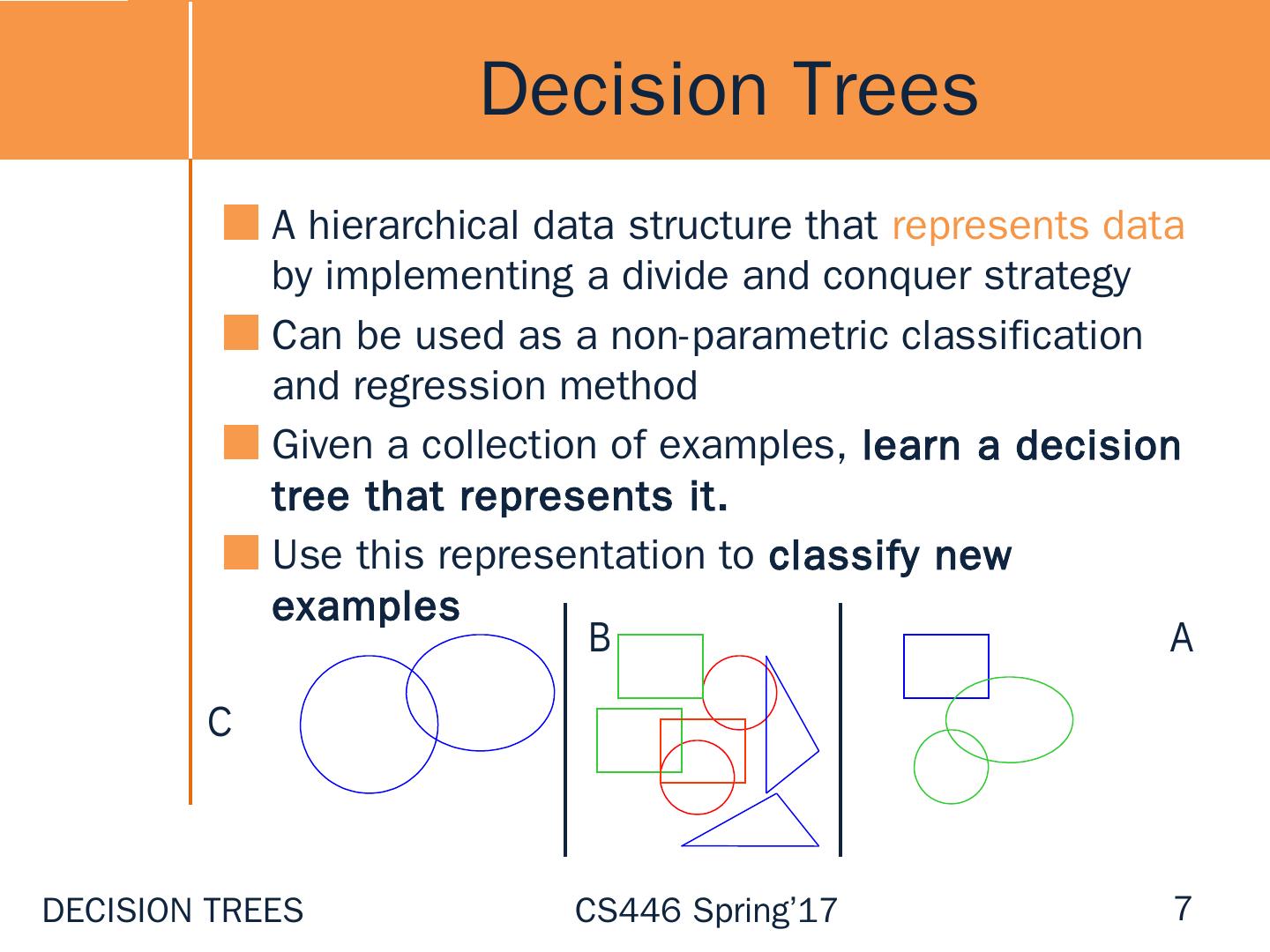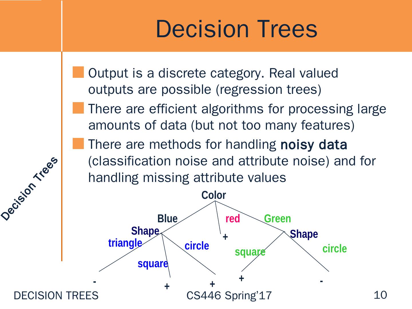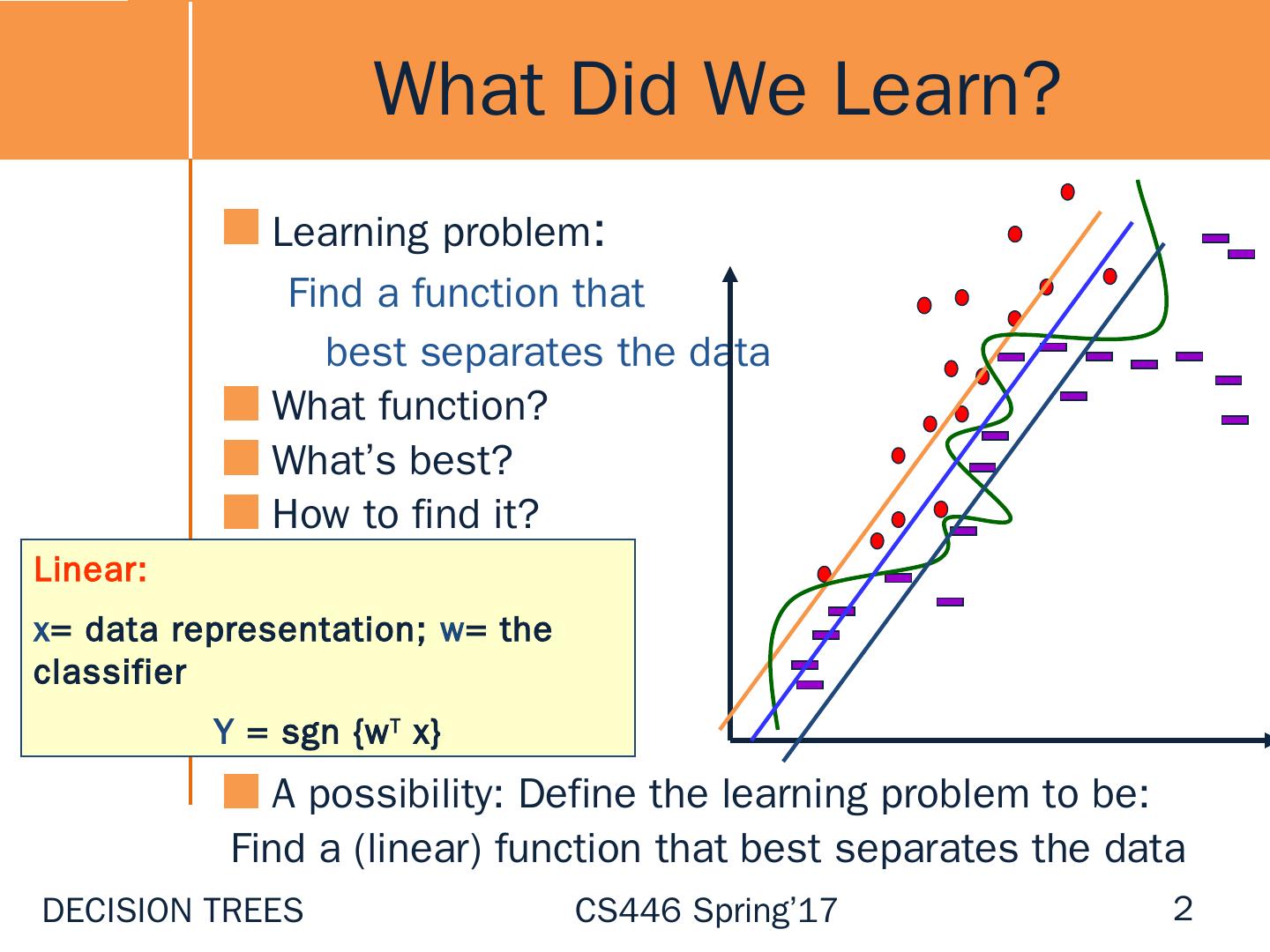DECISION TREES CS446 Spring'17. What Did We Learn? Learning problem: Find a function that. best separates the data. What function? What's best? How to ...