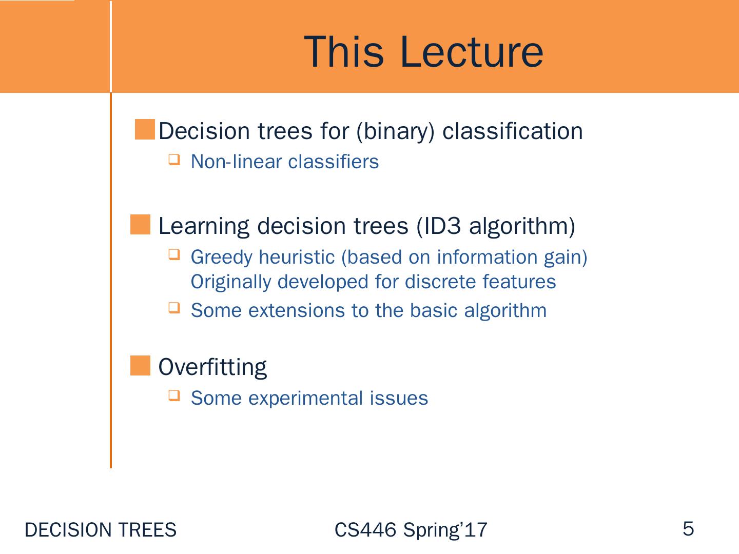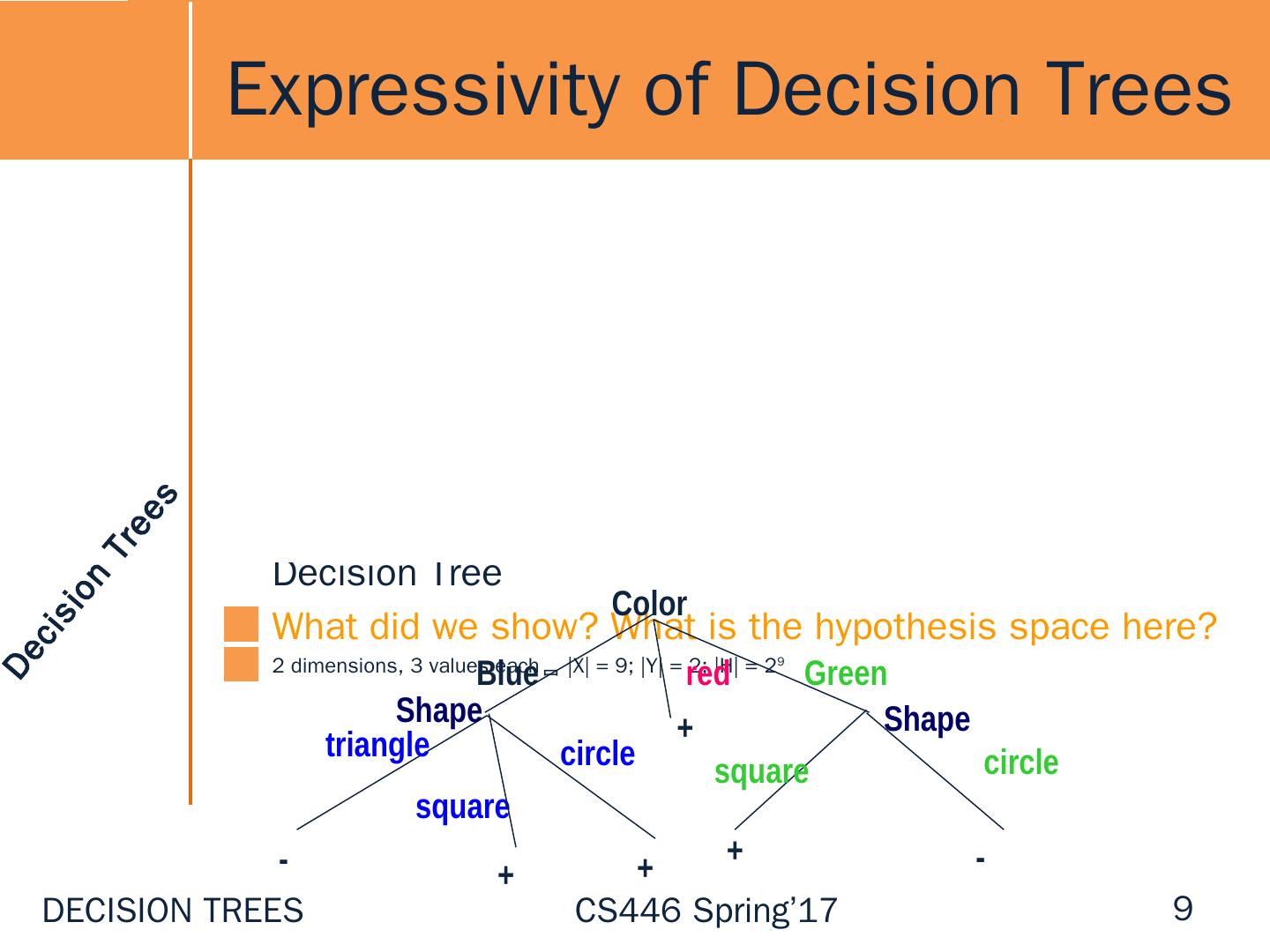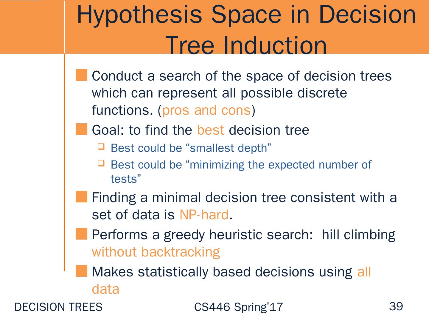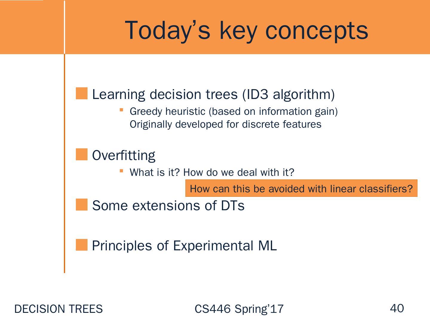 DECISION TREES CS446 Spring'17. What Did We Learn? Learning problem: Find a function that. best separates the data. What function? What's best? How to ...