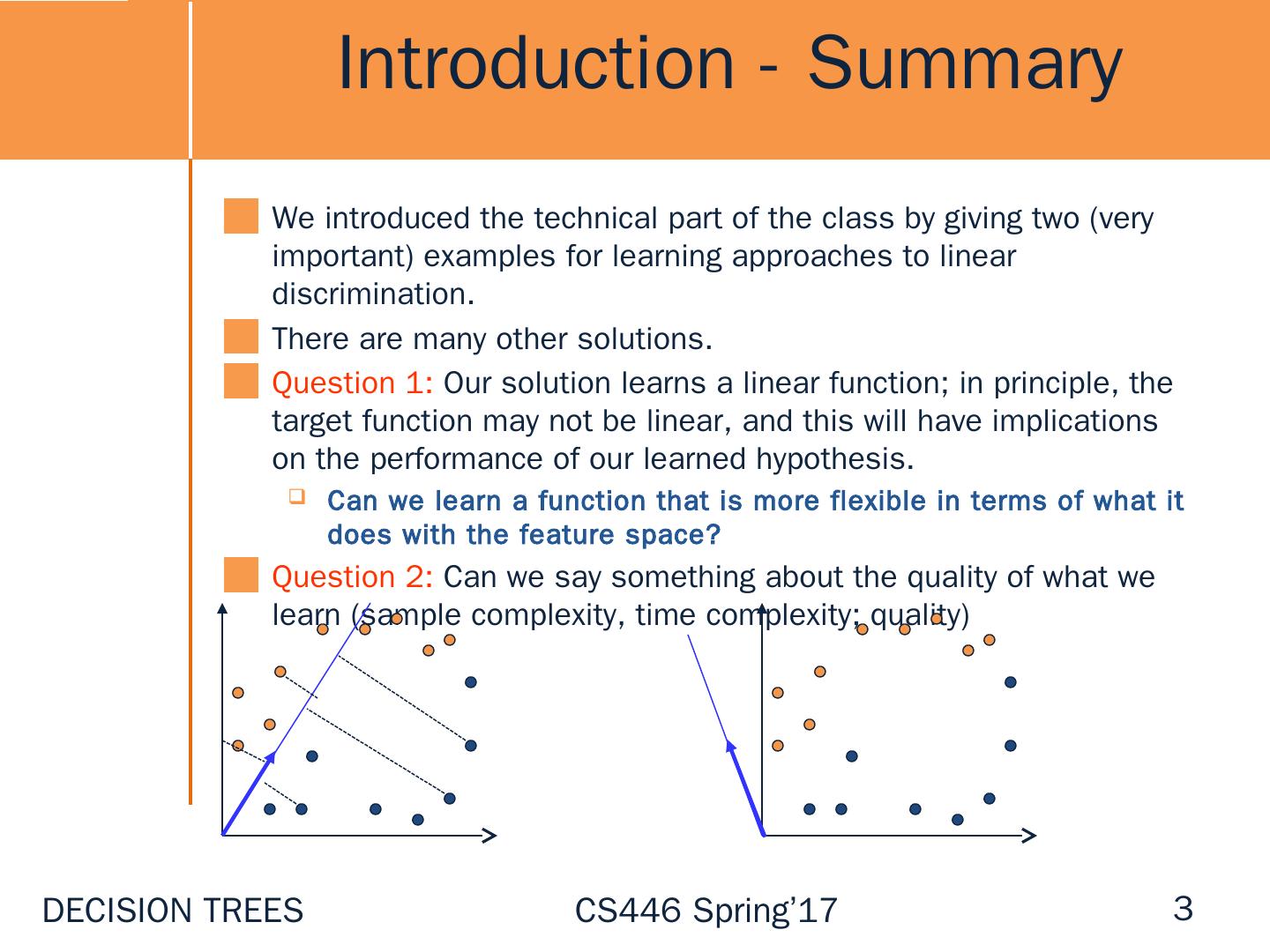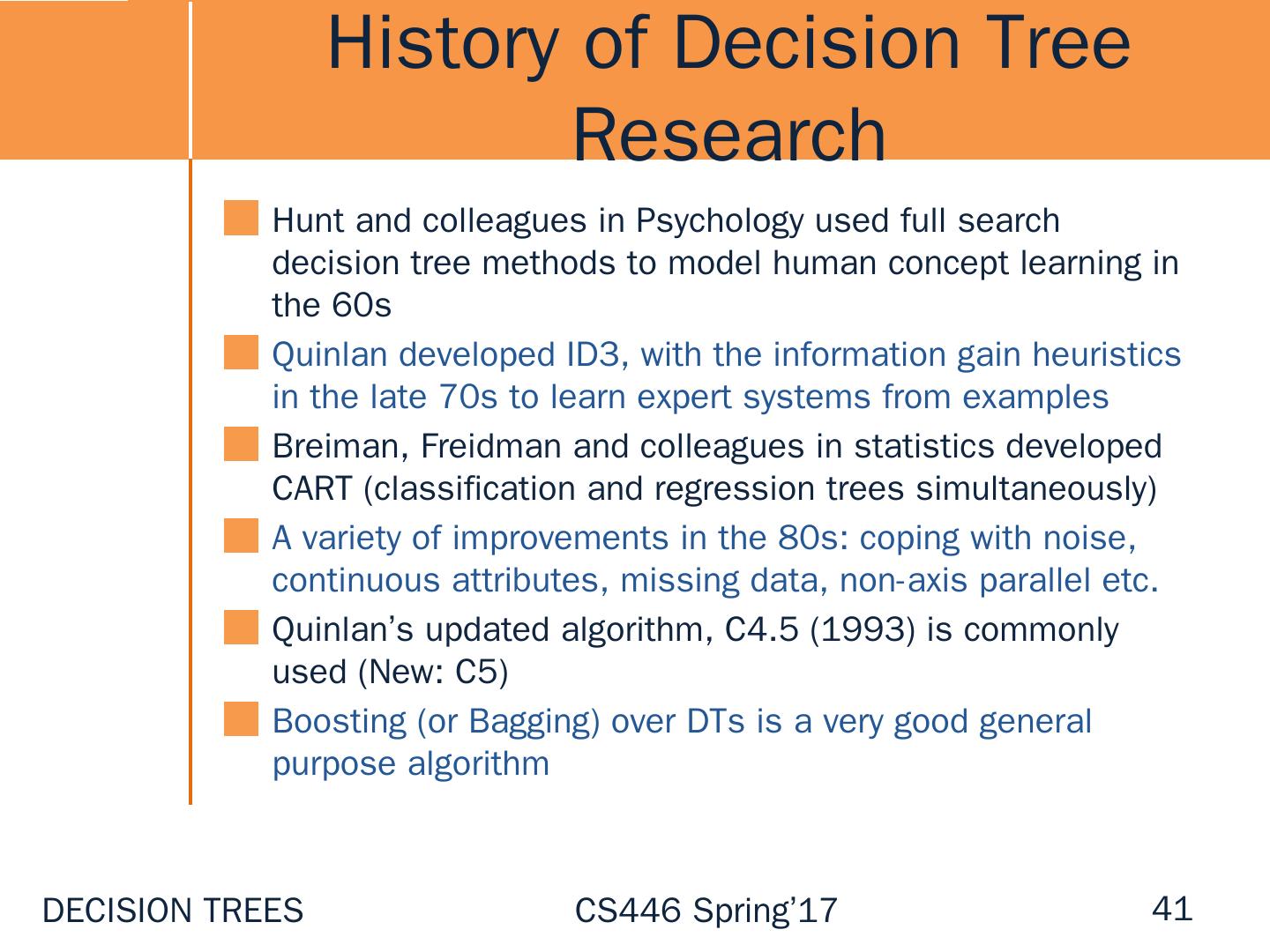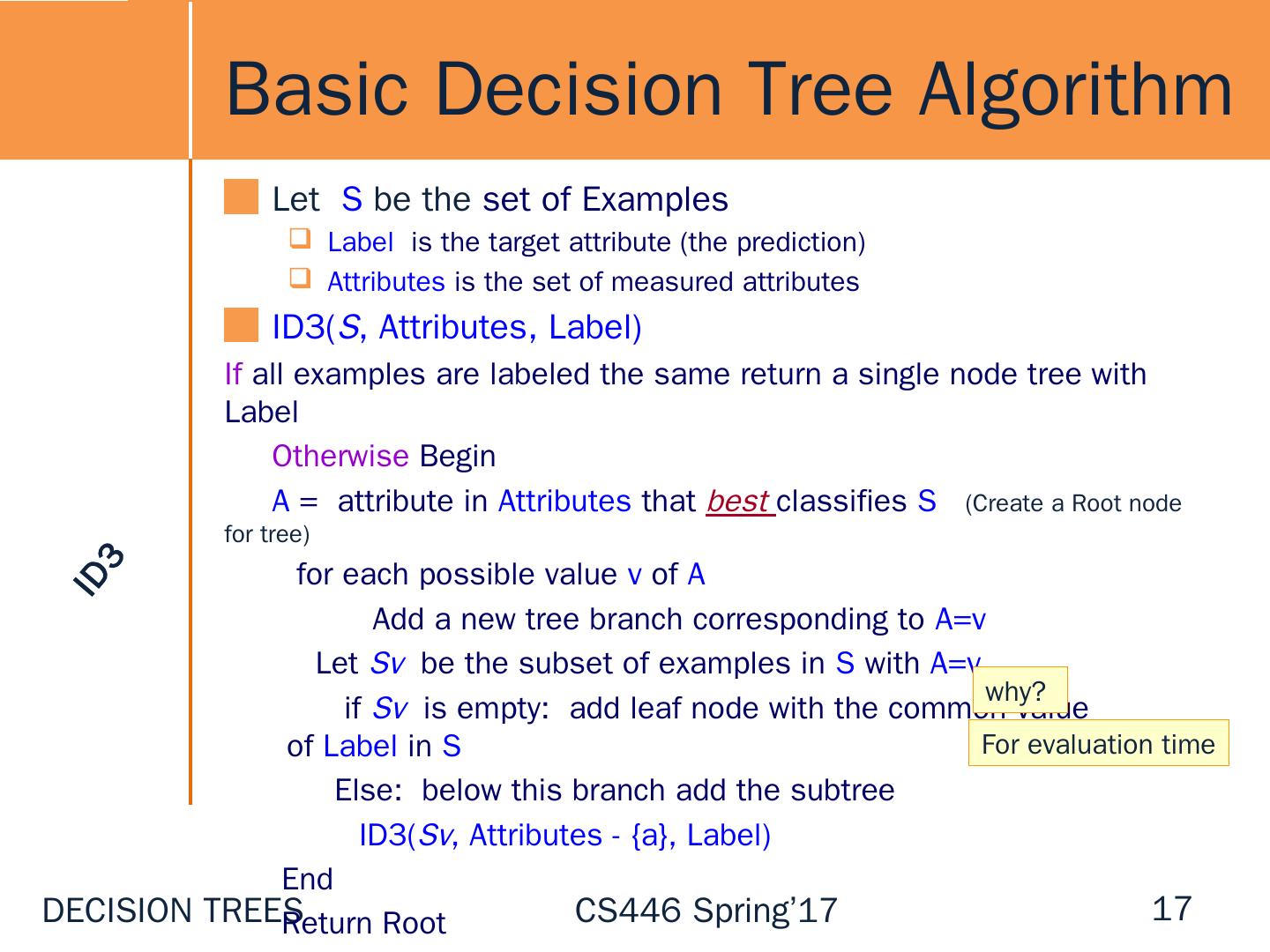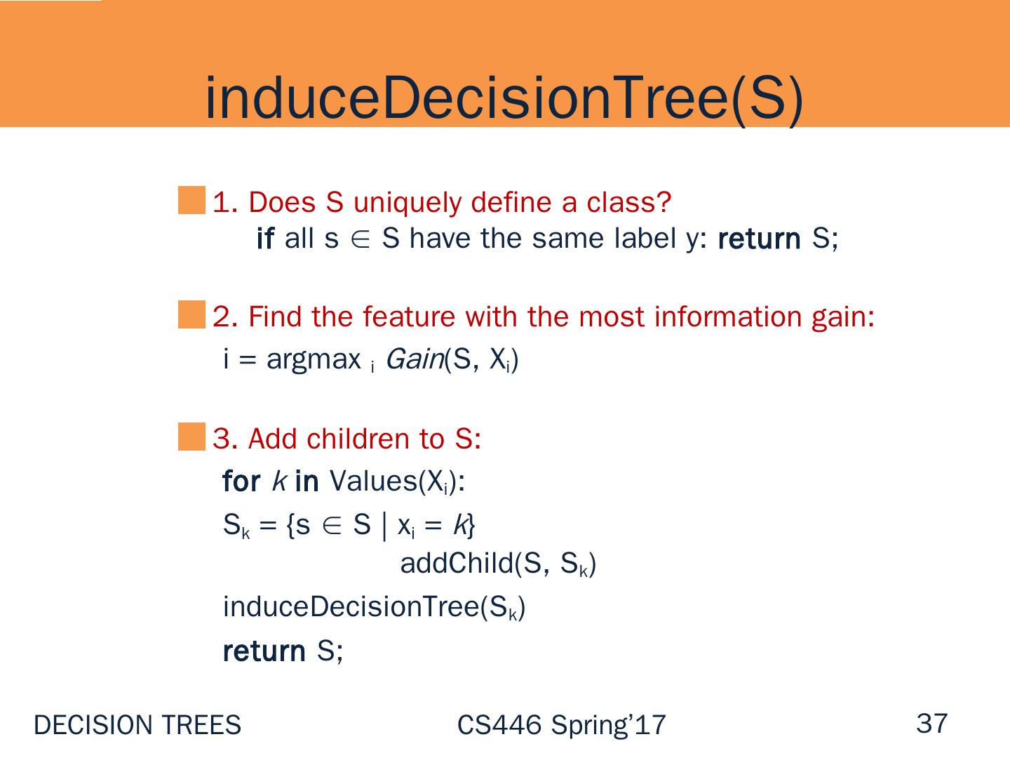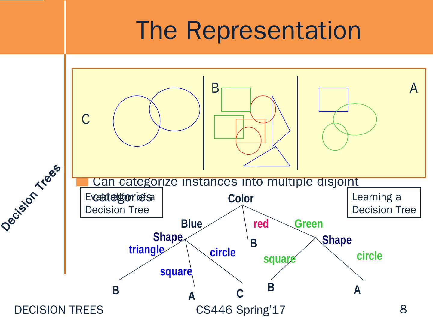 DECISION TREES CS446 Spring'17. What Did We Learn? Learning problem: Find a function that. best separates the data. What function? What's best? How to ...