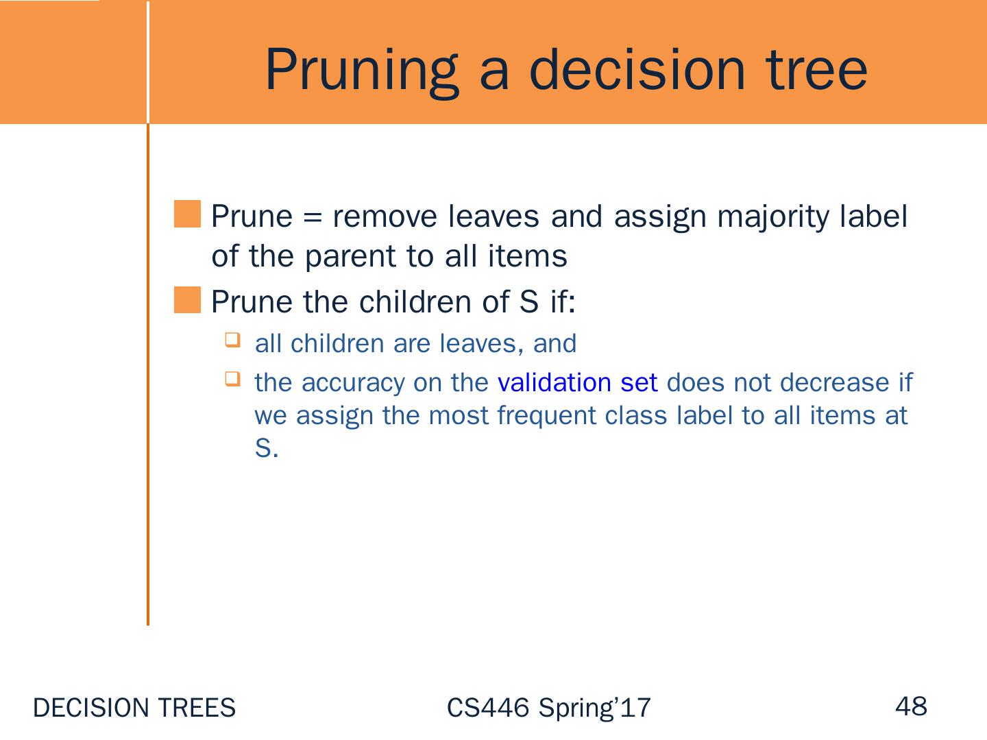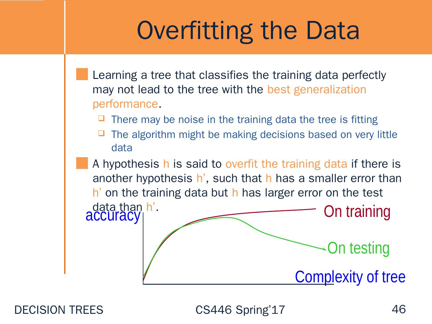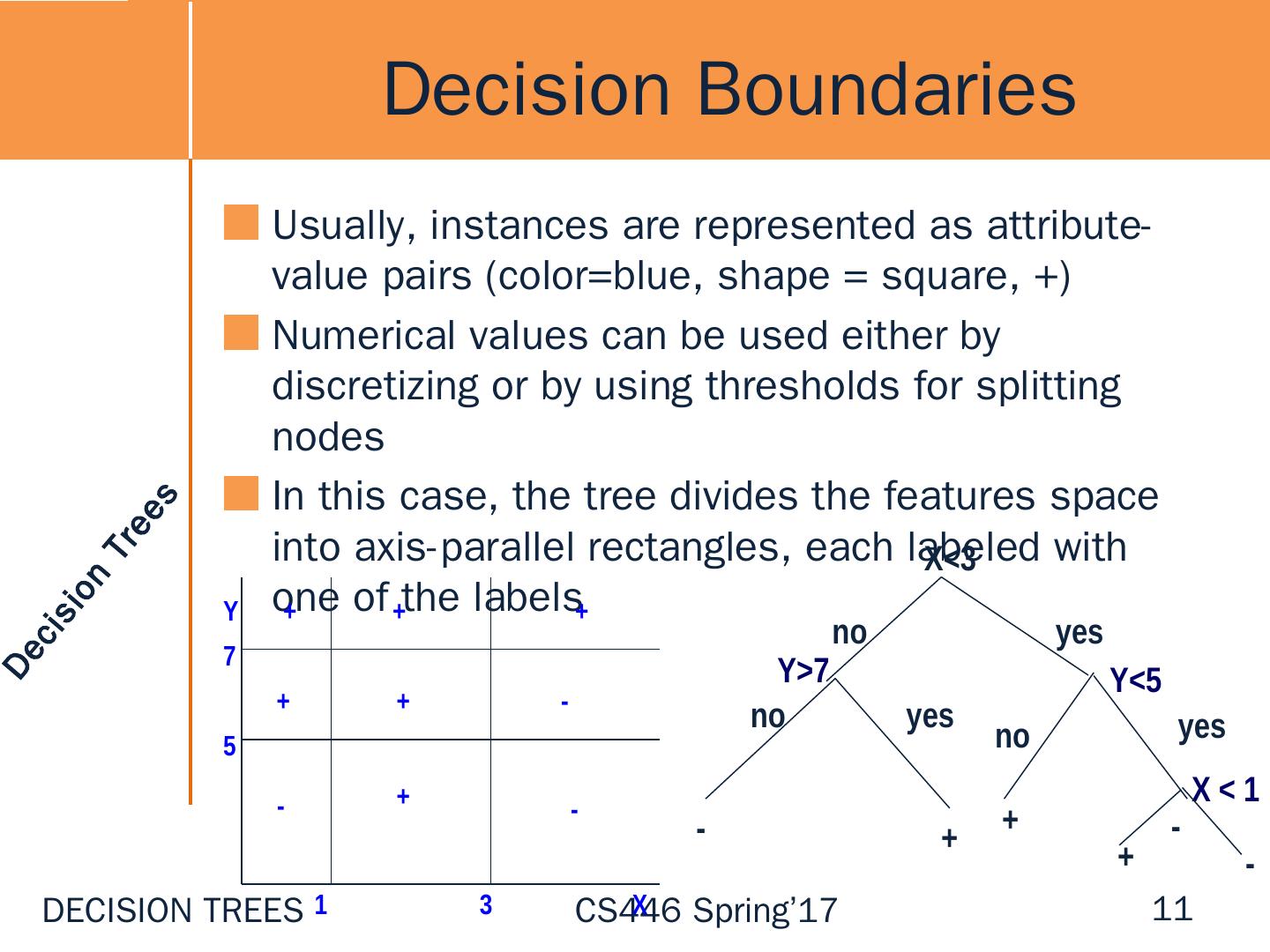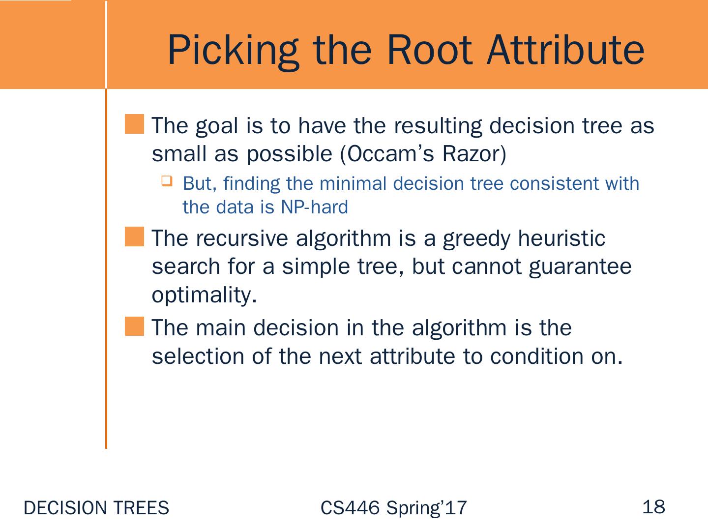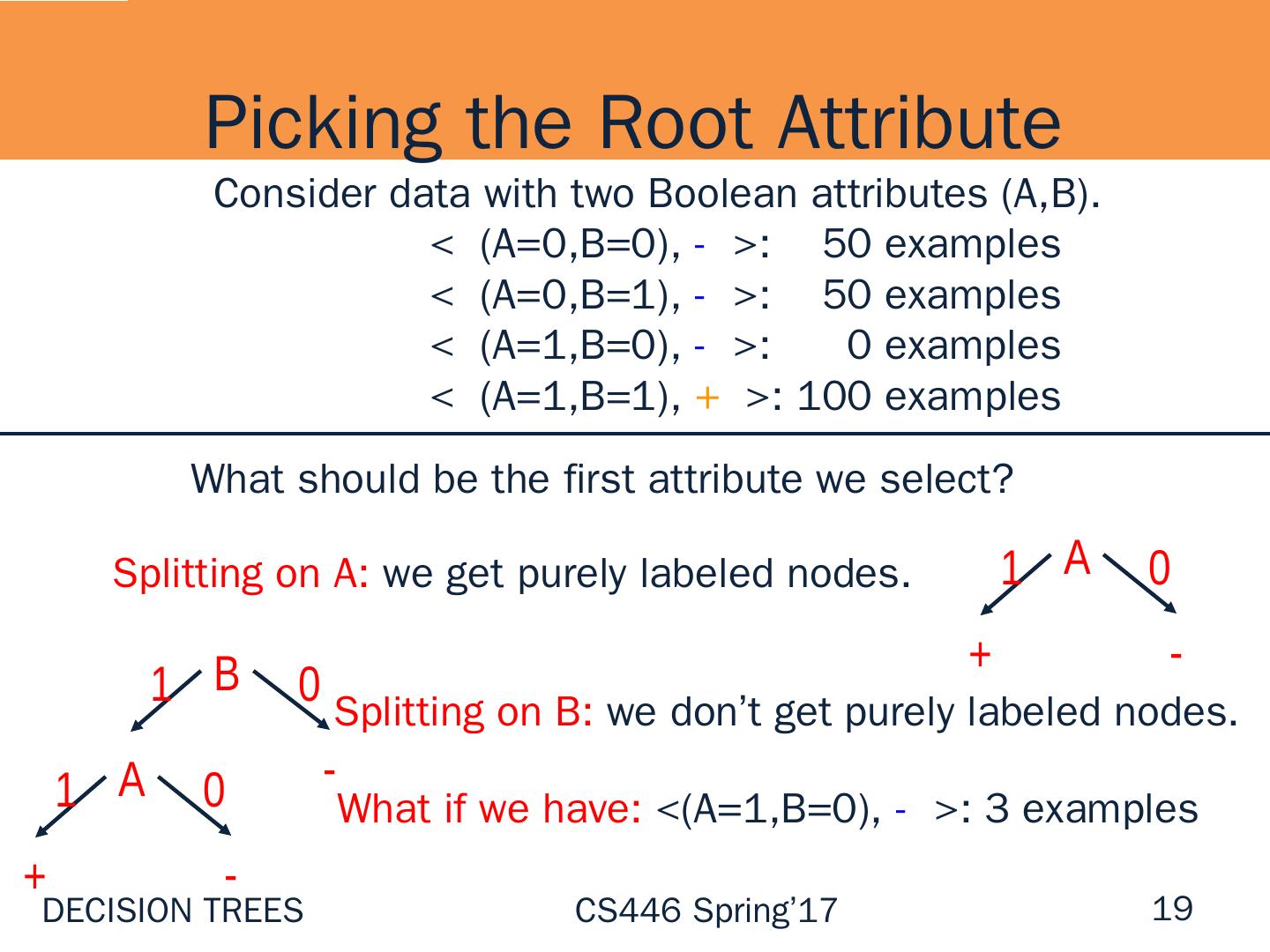 DECISION TREES CS446 Spring'17. What Did We Learn? Learning problem: Find a function that. best separates the data. What function? What's best? How to ...