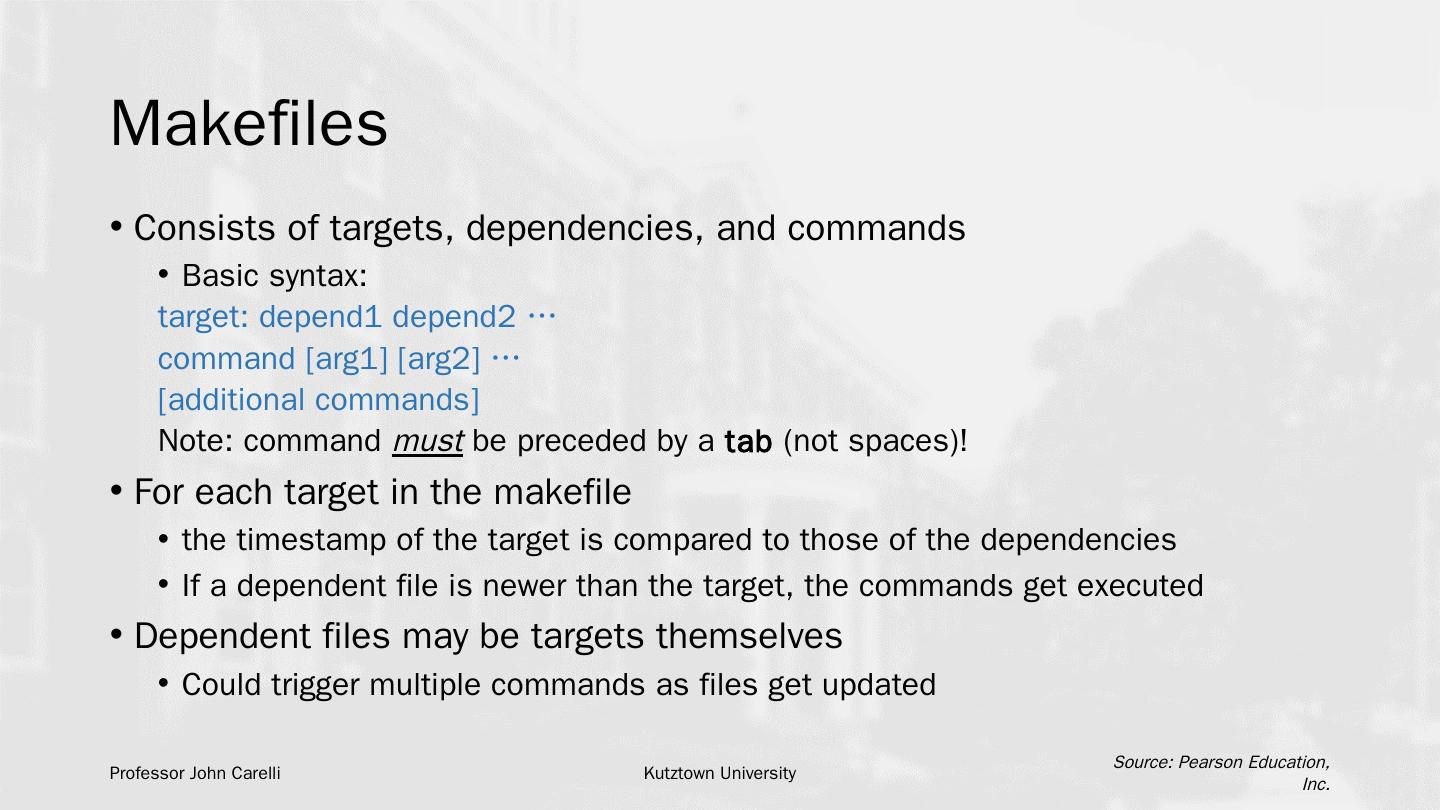 Source: Pearson Education, Inc. Makefiles and the make utility. make is a unix utility. Organizes command-based tasks; Uses file timestamps to keep targeted ...
