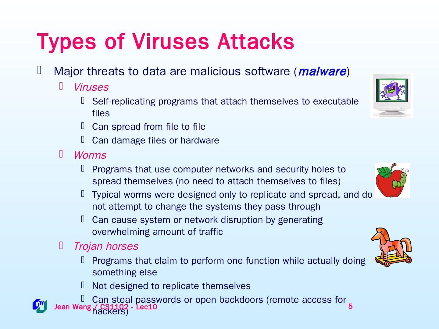 5 .5 Types of Viruses Attacks Major threats to data are malicious software ( malware ) Viruses Self-replicating programs that attach themselves to executable files Can spread from file to file Can damage files or hardware Worms Programs that use computer networks and security holes to spread themselves (no need to attach themselves to files) Typical worms were designed only to replicate and spread, and do not attempt to change the systems they pass through Can cause system or network disruption by generating overwhelming amount of traffic Trojan horses Programs that claim to perform one function while actually doing something else Not designed to replicate themselves Can steal passwords or open backdoors (remote access for hackers) Jean Wang / CS1102 - Lec10