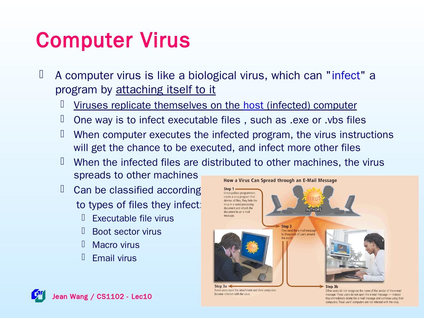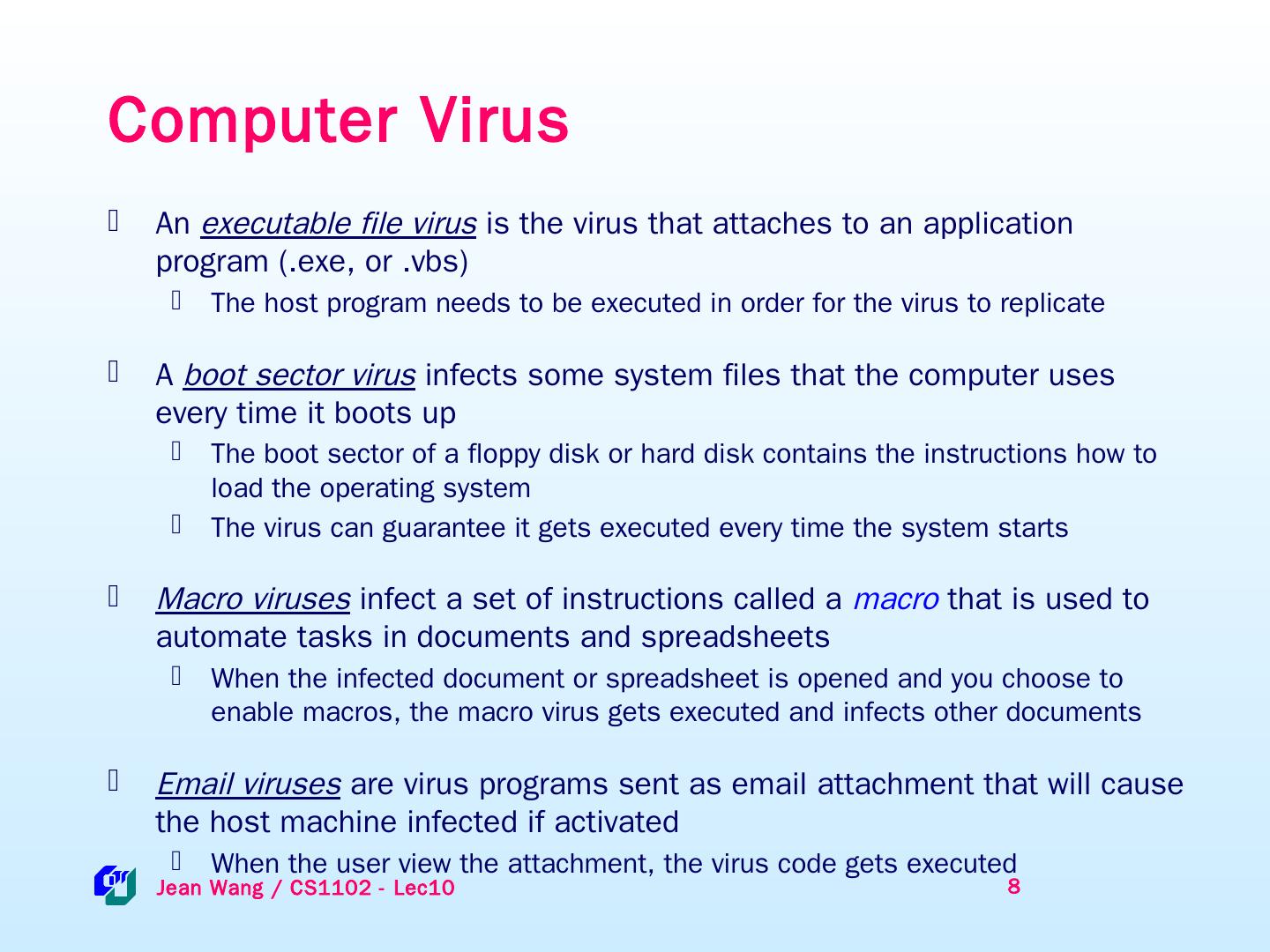 8 .8 Computer Virus An executable file virus is the virus that attaches to an application program (.exe, or . vbs ) The host program needs to be executed in order for the virus to replicate A boot sector virus infects some system files that the computer uses every time it boots up The boot sector of a floppy disk or hard disk contains the instructions how to load the operating system The virus can guarantee it gets executed every time the system starts Macro viruses infect a set of instructions called a macro that is used to automate tasks in documents and spreadsheets When the infected document or spreadsheet is opened and you choose to enable macros, the macro virus gets executed and infects other documents Email viruses are virus programs sent as email attachment that will cause the host machine infected if activated When the user view the attachment, the virus code gets executed Jean Wang / CS1102 - Lec10