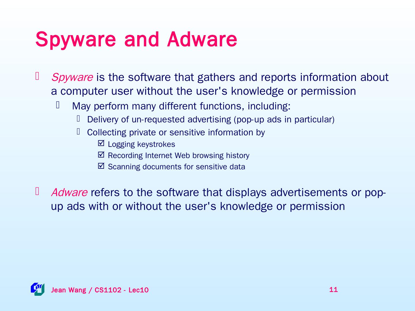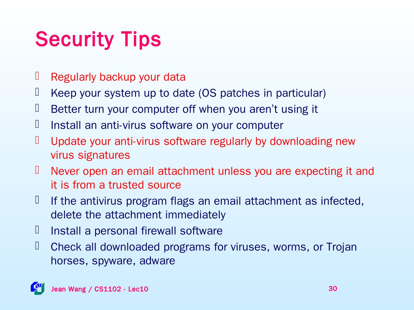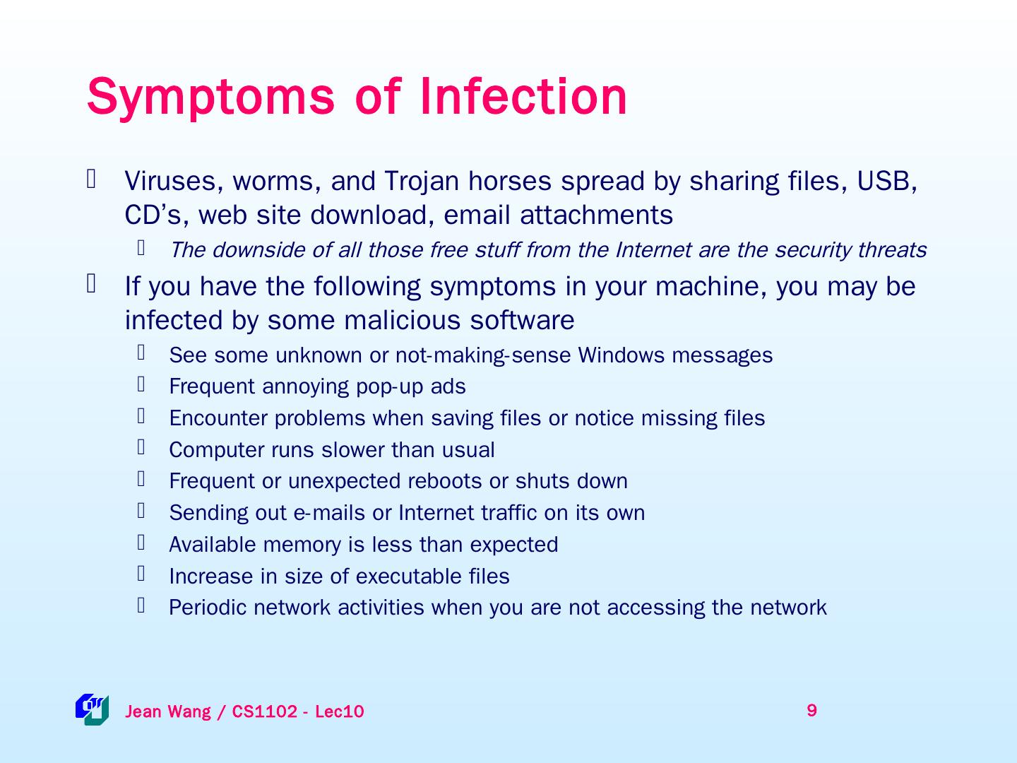 9 .9 Symptoms of Infection Viruses, worms, and Trojan horses spread by sharing files, USB, CD’s, web site download, email attachments The downside of all those free stuff from the Internet are the security threats If you have the following symptoms in your machine, you may be infected by some malicious software See some unknown or not-making-sense Windows messages Frequent annoying pop-up ads Encounter problems when saving files or notice missing files Computer runs slower than usual Frequent or unexpected reboots or shuts down Sending out e-mails or Internet traffic on its own Available memory is less than expected Increase in size of executable files Periodic network activities when you are not accessing the network Jean Wang / CS1102 - Lec10