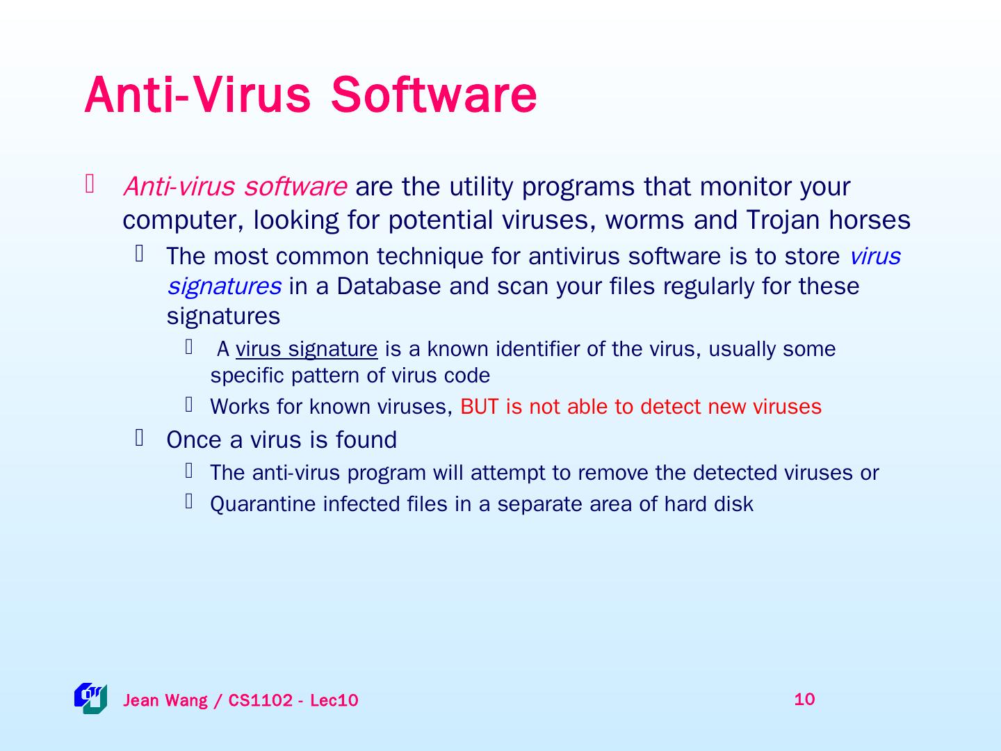10 .10 Anti-Virus Software Anti-virus software are the utility programs that monitor your computer, looking for potential viruses, worms and Trojan horses The most common technique for antivirus software is to store virus signatures in a Database and scan your files regularly for these signatures A virus signature is a known identifier of the virus, usually some specific pattern of virus code Works for known viruses, BUT is not able to detect new viruses Once a virus is found The anti-virus program will attempt to remove the detected viruses or Quarantine infected files in a separate area of hard disk Jean Wang / CS1102 - Lec10