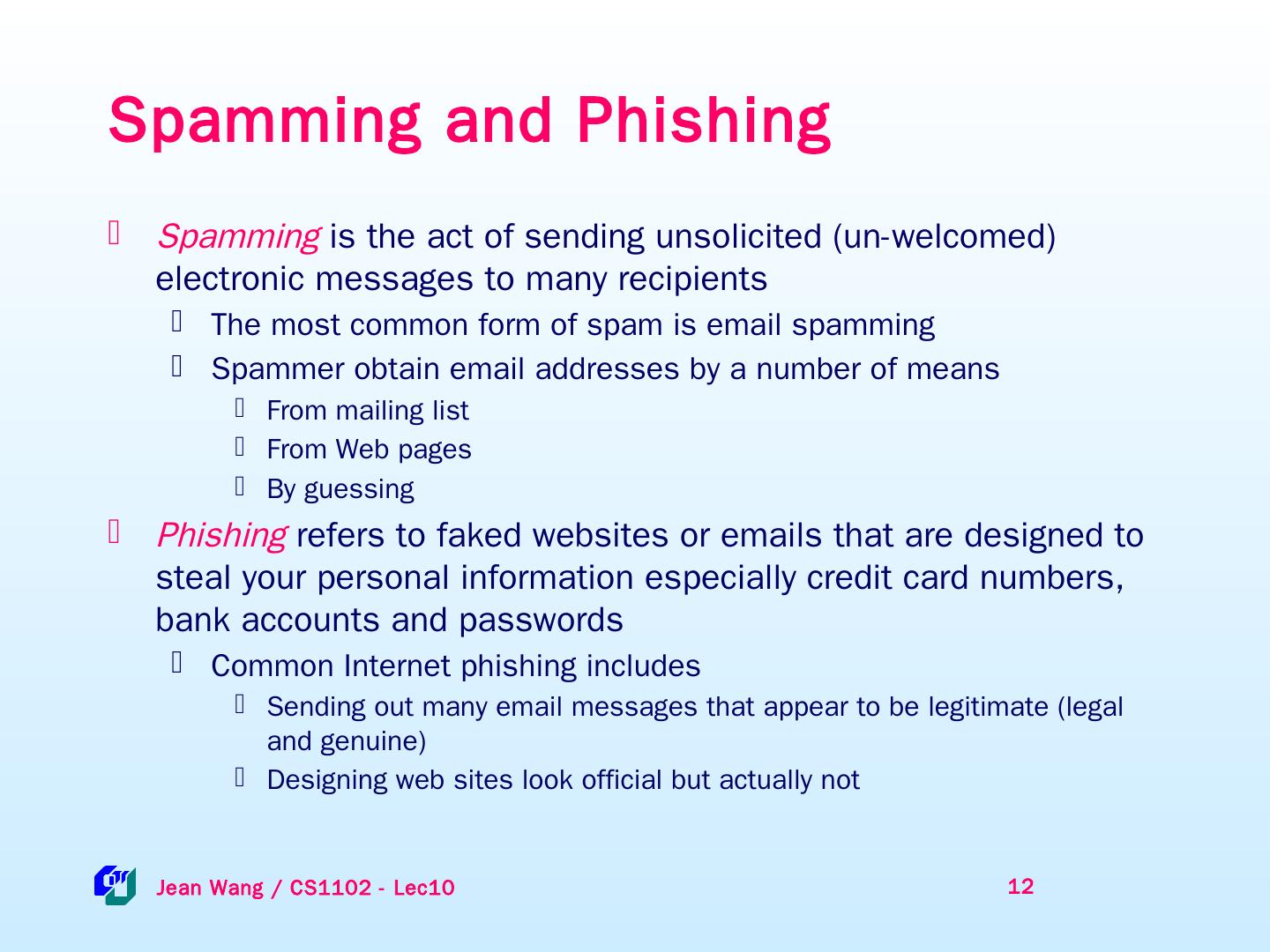 12 .12 Spamming and Phishing Spamming is the act of sending unsolicited (un-welcomed) electronic messages to many recipients The most common form of spam is email spamming Spammer obtain email addresses by a number of means From mailing list From Web pages By guessing Phishing refers to faked websites or emails that are designed to steal your personal information especially credit card numbers, bank accounts and passwords Common Internet phishing includes Sending out many email messages that appear to be legitimate (legal and genuine) Designing web sites look official but actually not Jean Wang / CS1102 - Lec10