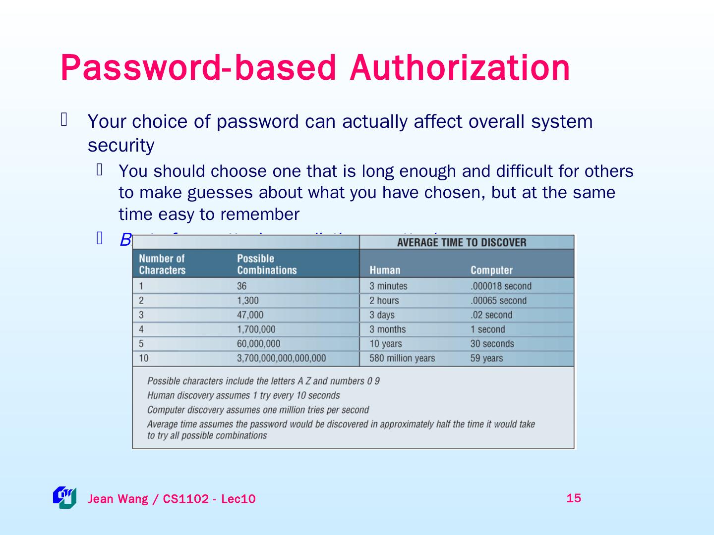 15 .15 Password-based Authorization Your choice of password can actually affect overall system security You should choose one that is long enough and difficult for others to make guesses about what you have chosen, but at the same time easy to remember Brute-force attack v.s . dictionary attack Jean Wang / CS1102 - Lec10